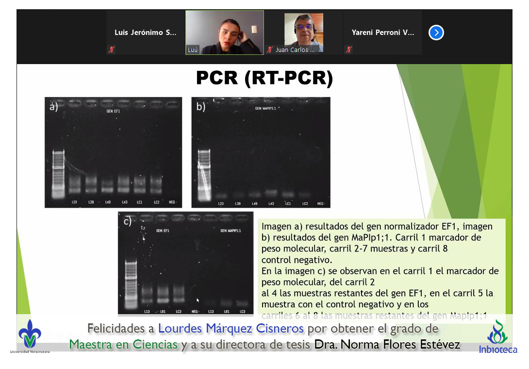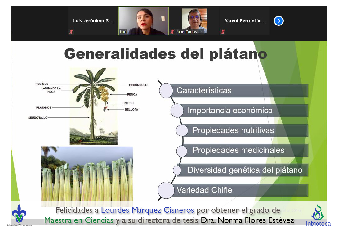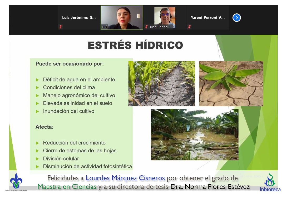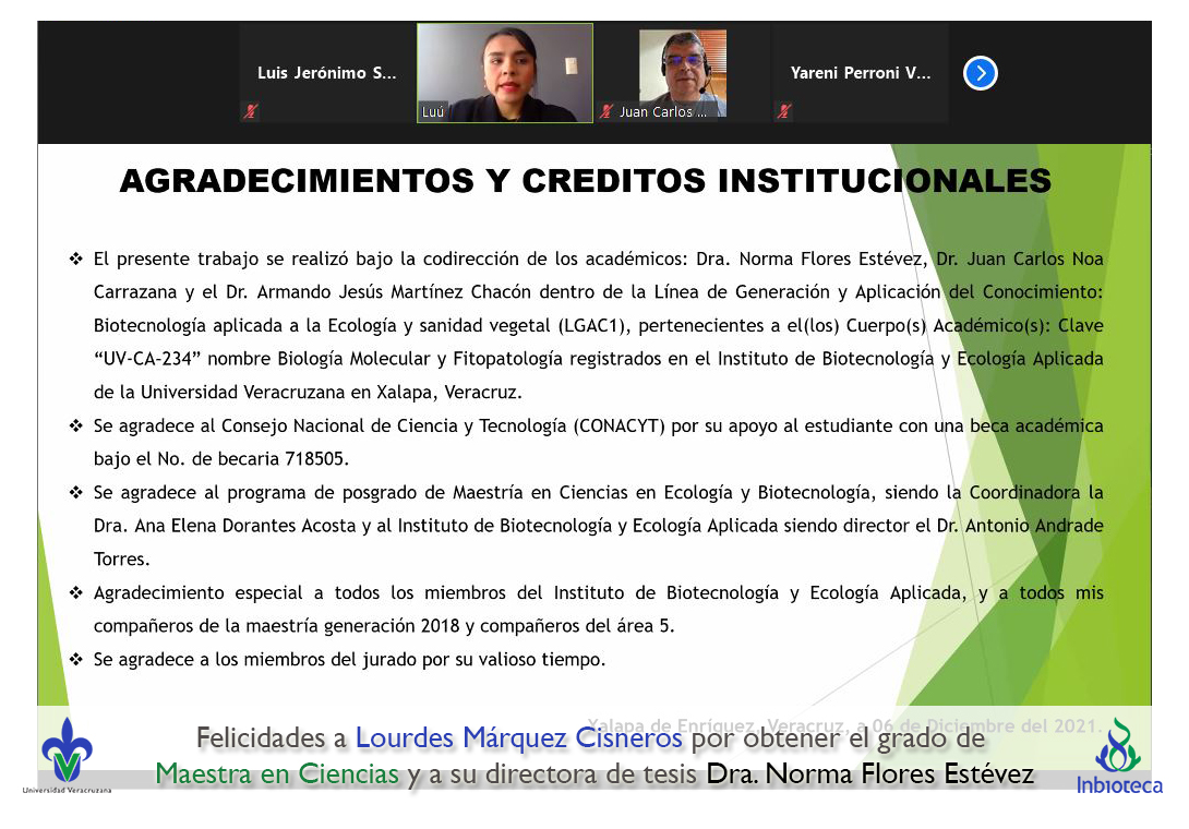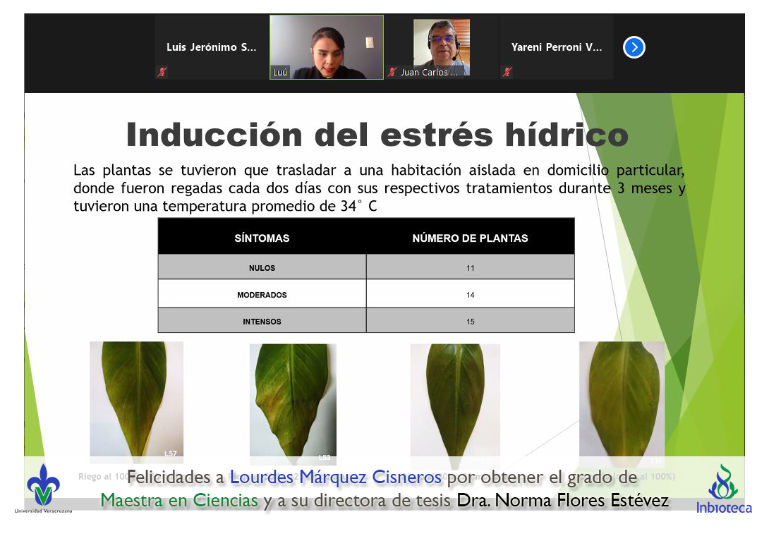 06 de diciembre de 2021.- A través de videoconferencia a las 10:00 horas, se realizó el examen de grado de Maestría con la defensa pública de la tesis intitulada: Influencia del estrés hídrico en la expresión de síntomas en plántulas de plátano con infección por virus rayado del plátano (BSV). El jurado evaluador lo integró la Dra. Yareni Perroni Ventura (Presidenta), el Dr. Juan Carlos Noa Carrazana (Secretario) y como invitada externa del Instituto Tecnológico Superior de Perote (ITSPerote), la Dra. Nora Iseal Ruiz Colorado en calidad de (Vocal).