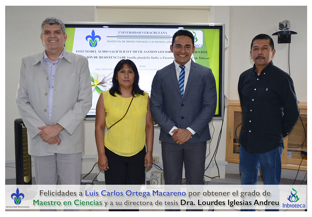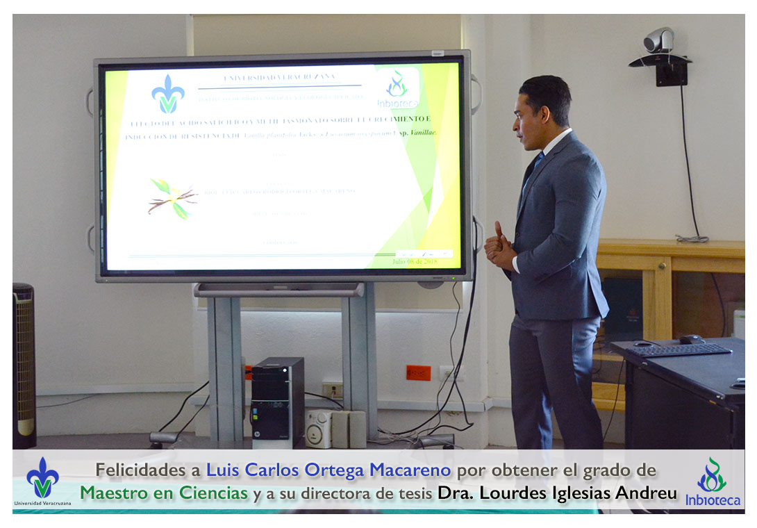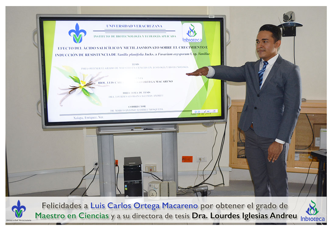 08 de julio de 2019.- En el Aula de Usos Múltiples del INBIOTECA a las 11:00 horas, se realizó el examen de grado de Maestría con la defensa pública de la tesis titulada: "Efecto del ácido salicílico y metil-jasmonato sobre el crecimiento e inducción de resistencia de Vanilla planifolia Jacks. a Fusarium oxysporum f. sp. Vanillae.".