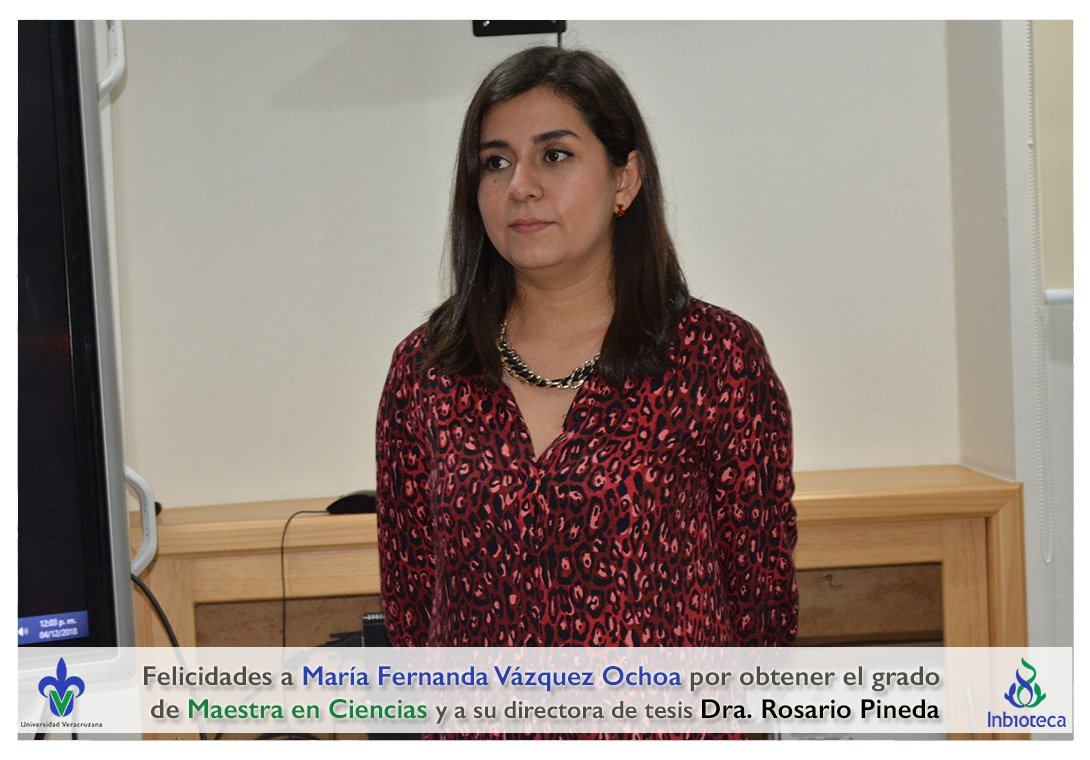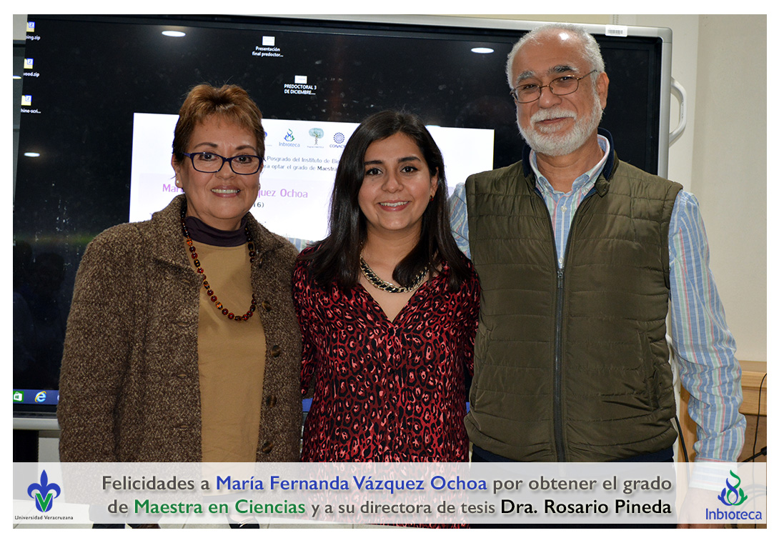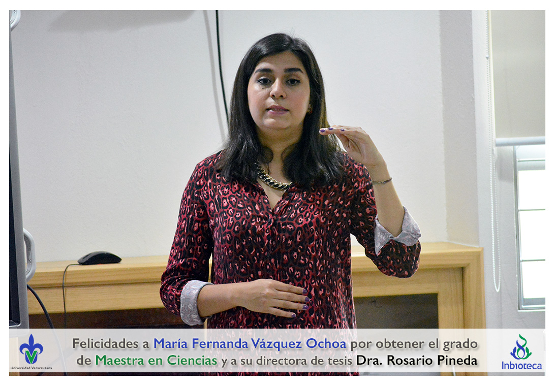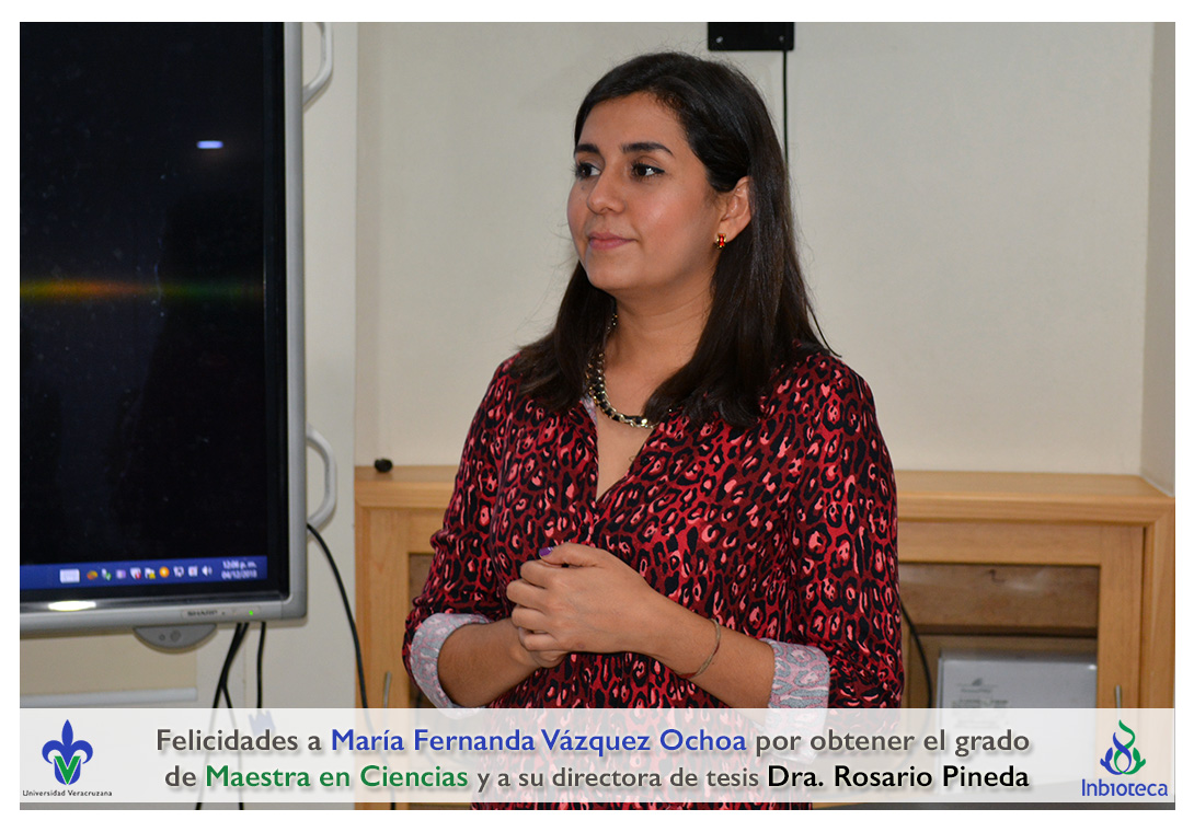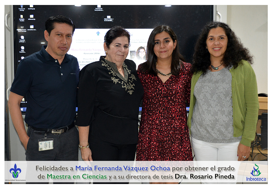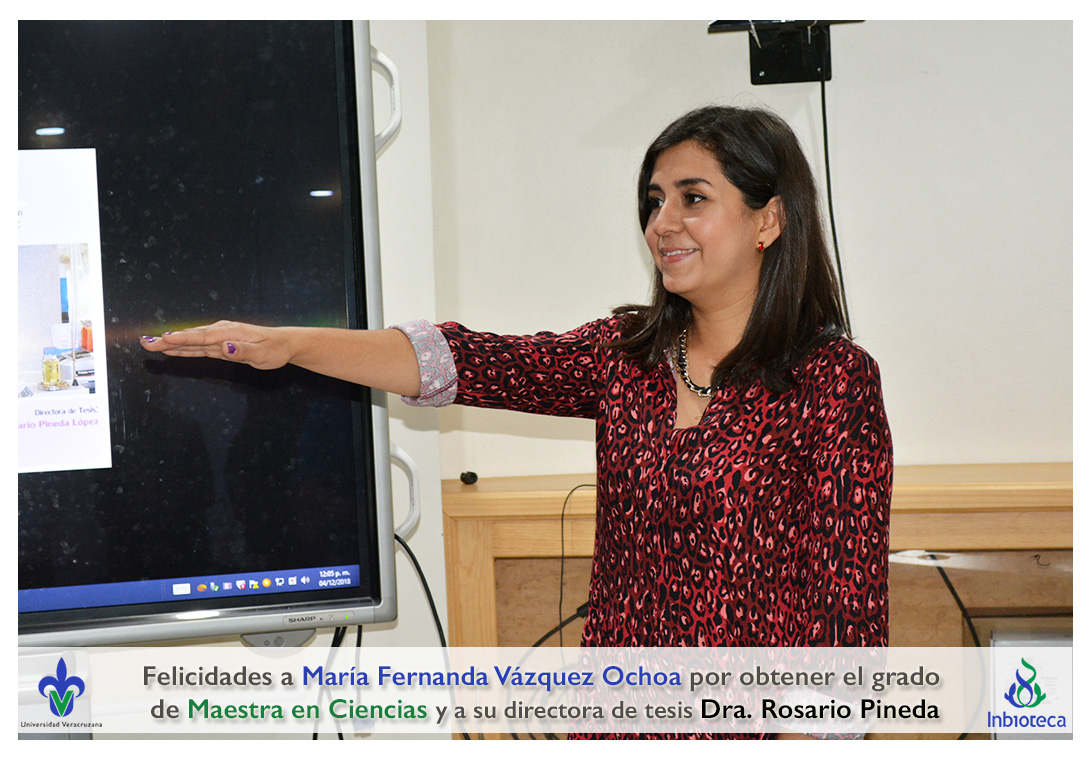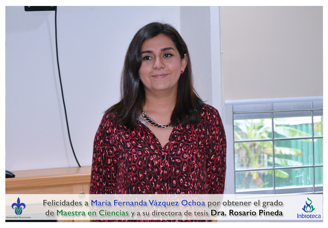 Felicidades a María Fernanda Vázquez Ochoa por obtener el grado de Maestra en Ciencias en Ecología y Biotecnología, a su directora de tesis Dra. María del Rosario Pineda López, a su comité y a todos los que contribuyeron en el trabajo realizado. ¡Enhorabuena!