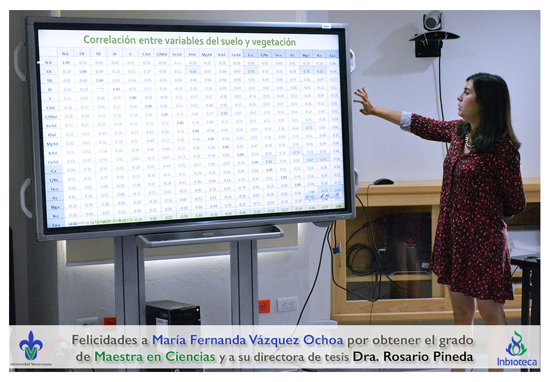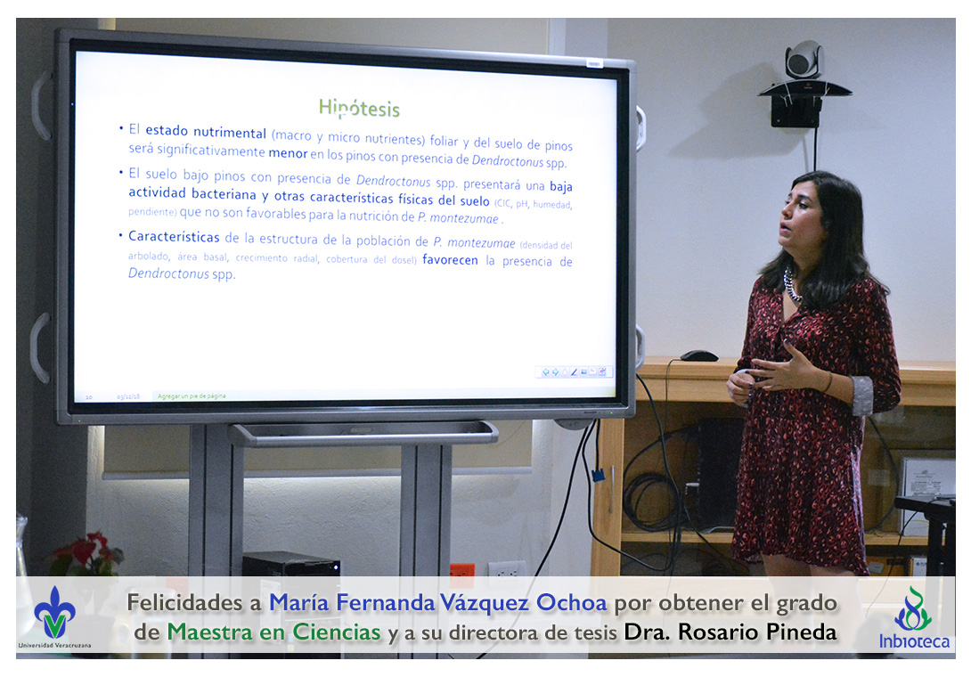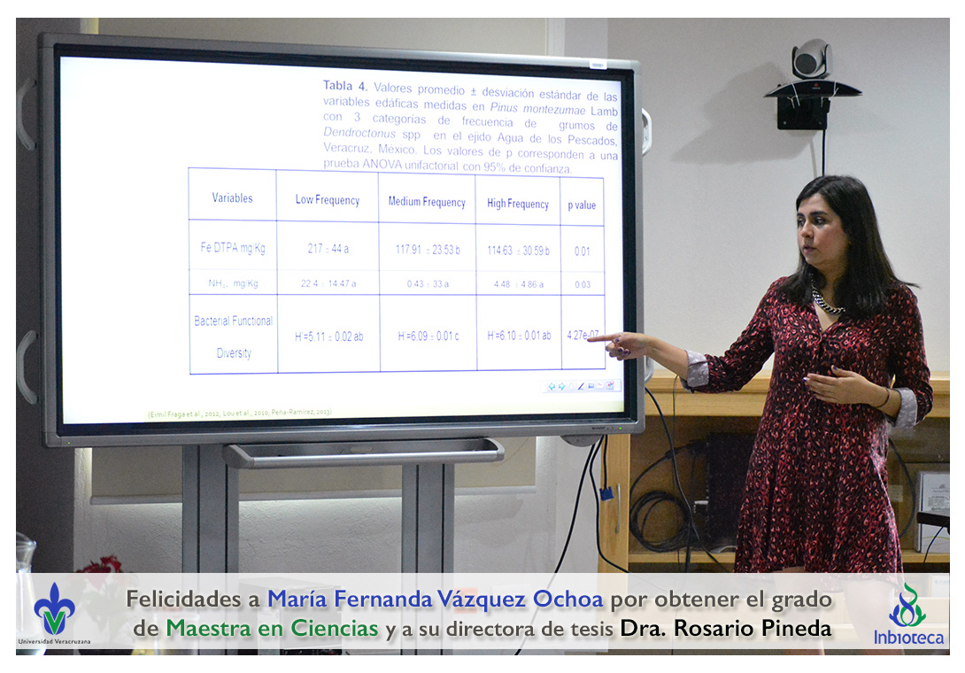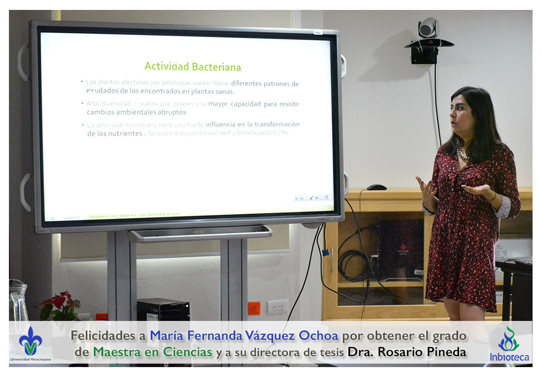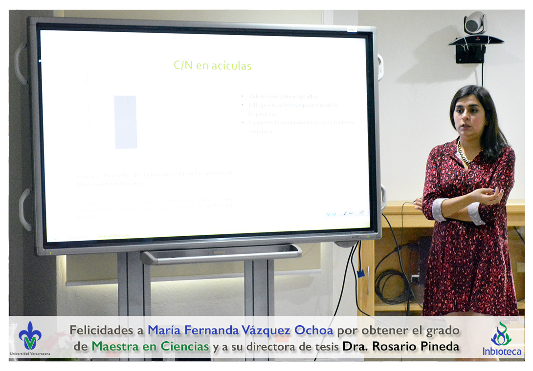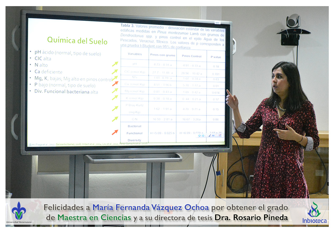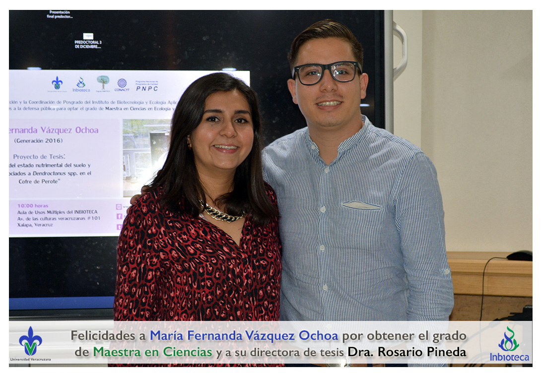 Felicidades a María Fernanda Vázquez Ochoa por obtener el grado de Maestra en Ciencias en Ecología y Biotecnología, a su directora de tesis Dra. María del Rosario Pineda López, a su comité y a todos los que contribuyeron en el trabajo realizado. ¡Enhorabuena!