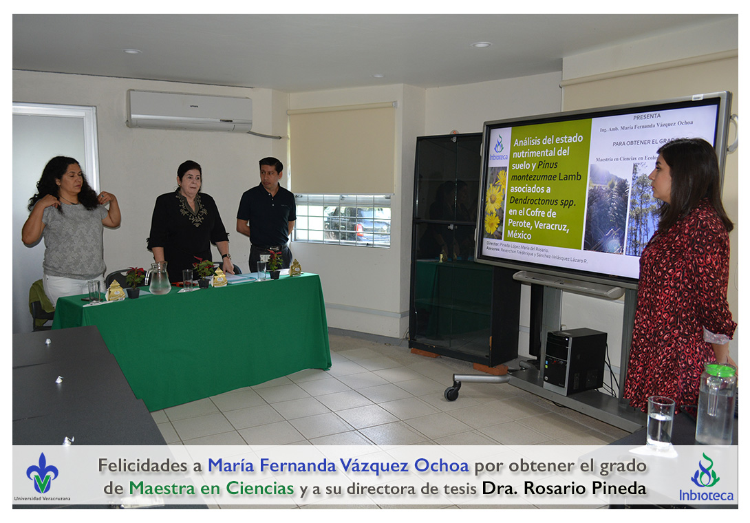 04 de diciembre de 2018.- En el Aula de Usos Múltiples del INBIOTECA a las 10:00 horas, se realizó el examen de grado de Maestría con la defensa pública de la tesis titulada: "Análisis del estado nutrimental del suelo y pinos asociados a Dendroctonus spp. en el Cofre de Perote".