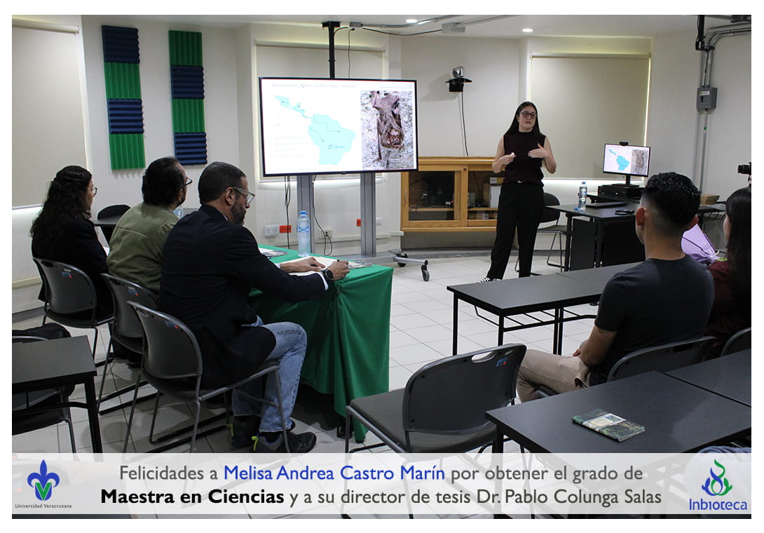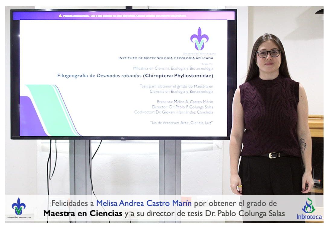 05 de noviembre de 2025.- En el Aula Híbrida del INBIOTECA a las 12:00 horas, se realizó el examen de grado de Maestría con la defensa pública de la tesis intitulada: Filogeografía de Desmodus rotundus (Chiroptera: Phyllostomidae). El jurado evaluador lo integró el Dr. Alejandro Antonio Castro Luna (Presidente), el Dr. Ernesto Ruelas Inzunza (Secretario), y como invitada de la Facultad de Ciencias de la UNAM, la Dra. Livia Socorro León Paniagua (Vocal Externa).