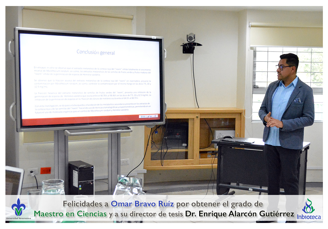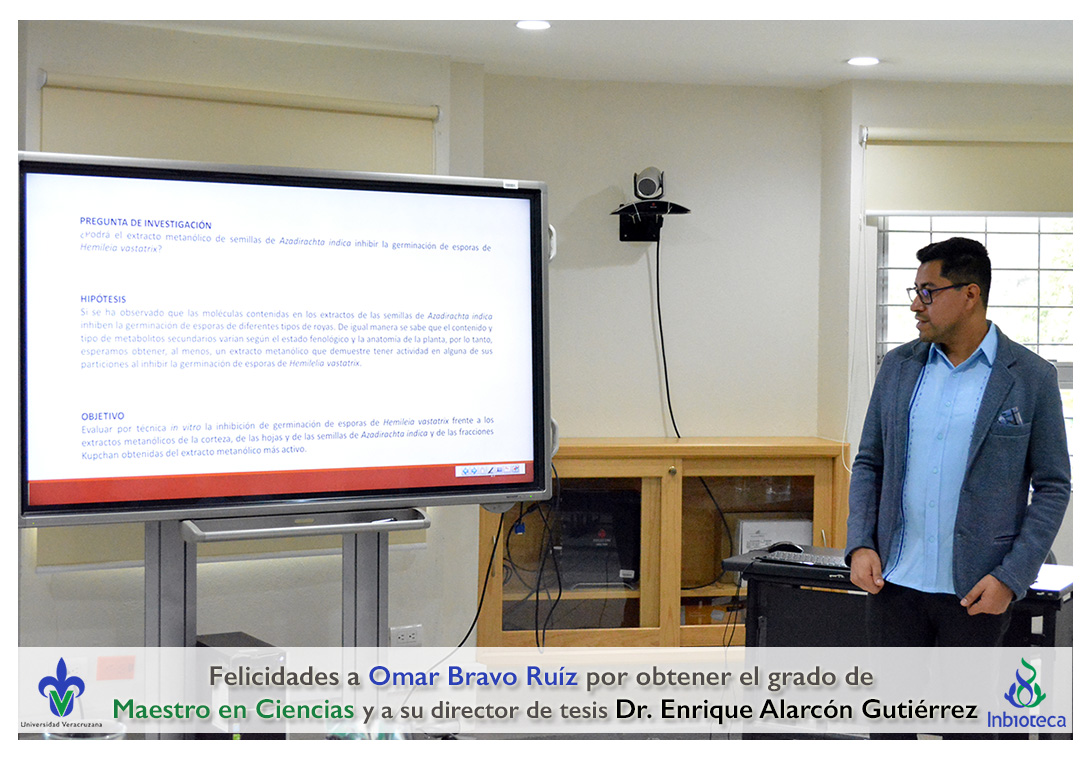31 de enero de 2019.- En el Aula de Usos Múltiples del INBIOTECA a las 11:00 horas, se realizó el examen de grado de Maestría con la defensa pública de la tesis titulada: "Evaluación de extractos metanólicos de Azadirachta indica como potenciales fungicidas sobre Myrothecium roridume inhibición de la germinación de esporas de Hemileia vastatrix".