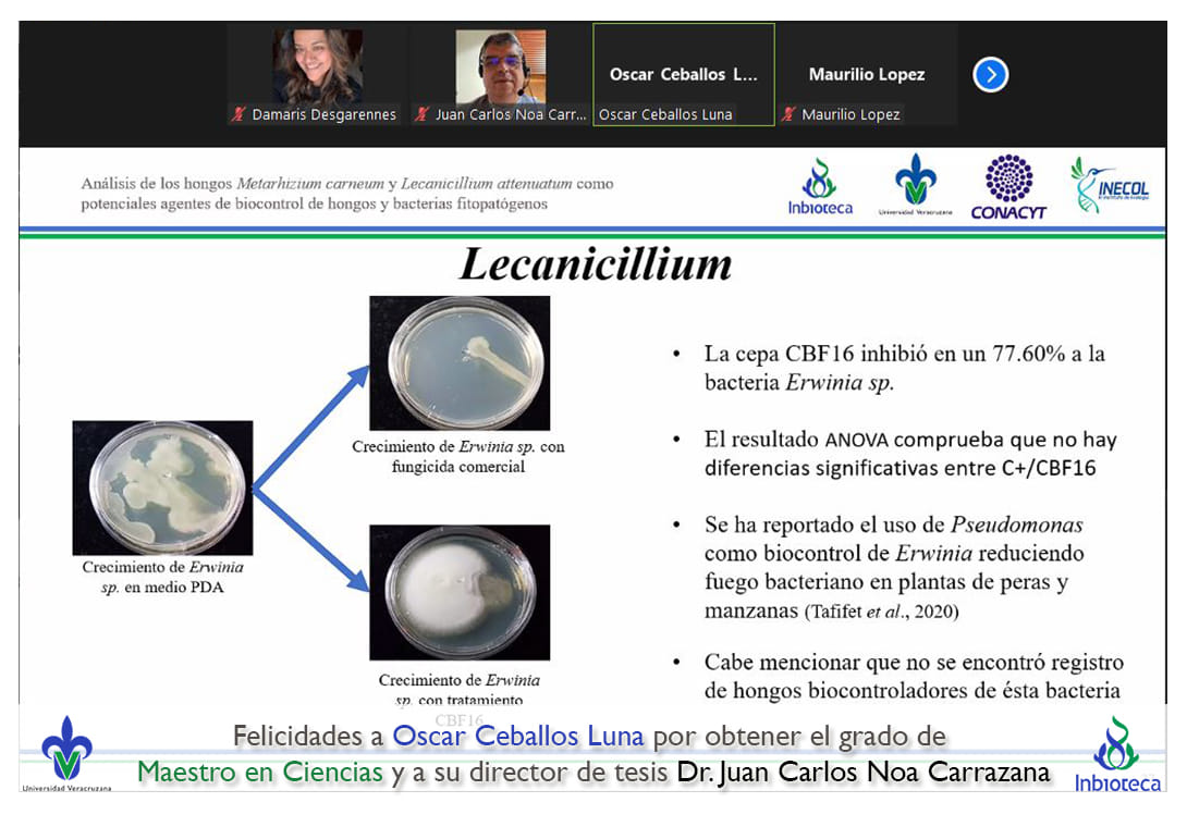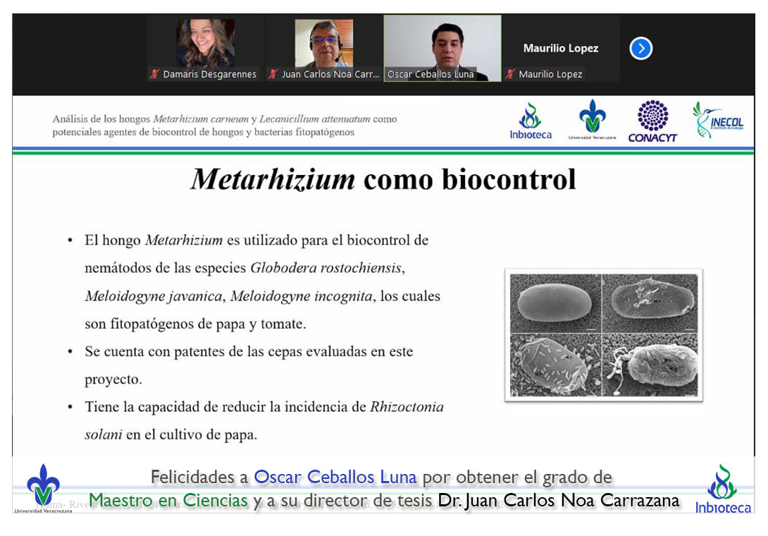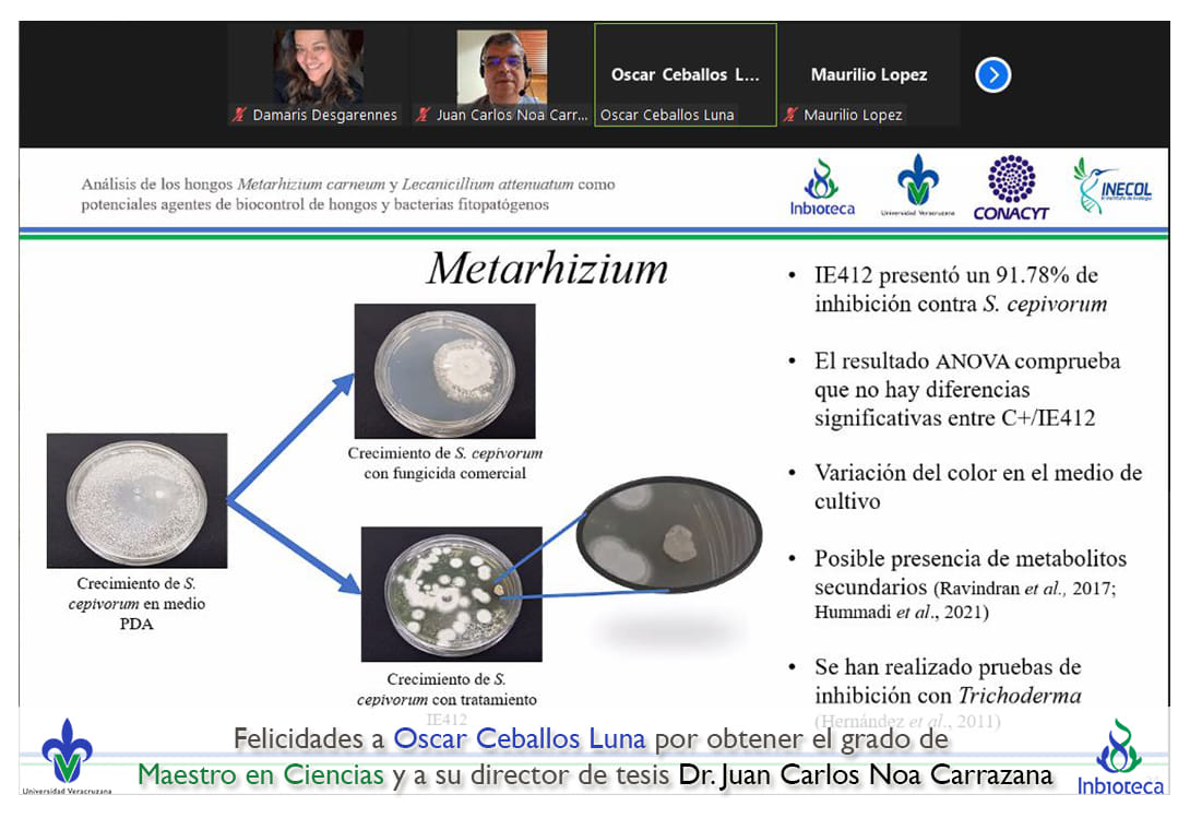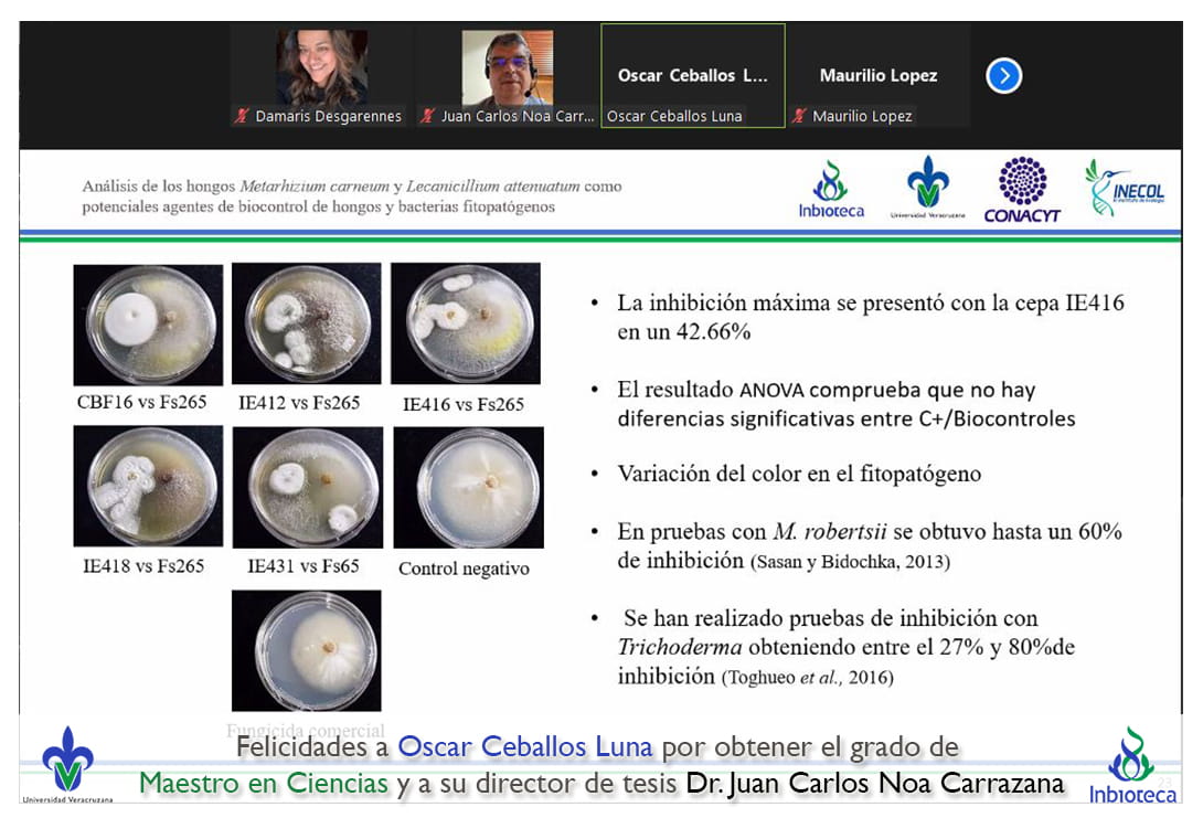 07 de enero de 2022.- A través de videoconferencia a las 10:00 horas, se realizó el examen de grado de Maestría con la defensa pública de la tesis intitulada: Análisis de los hongos Metarhizium carneum y Lecanicillium attenuatum como potenciales agentes de biocontrol de hongos y bacterias fitopatógenas. El jurado evaluador lo integró la Dra. Norma Flores Estévez (Presidenta), el Dr. Maurilio López Ortega (Secretario) y como invitada externa del INECOL, la Dra. Gloria Luz Carrión Villarnovo en calidad de (Vocal).