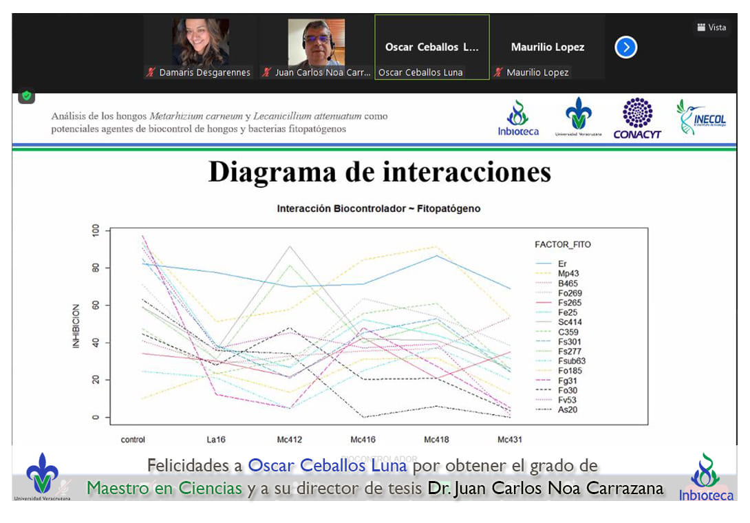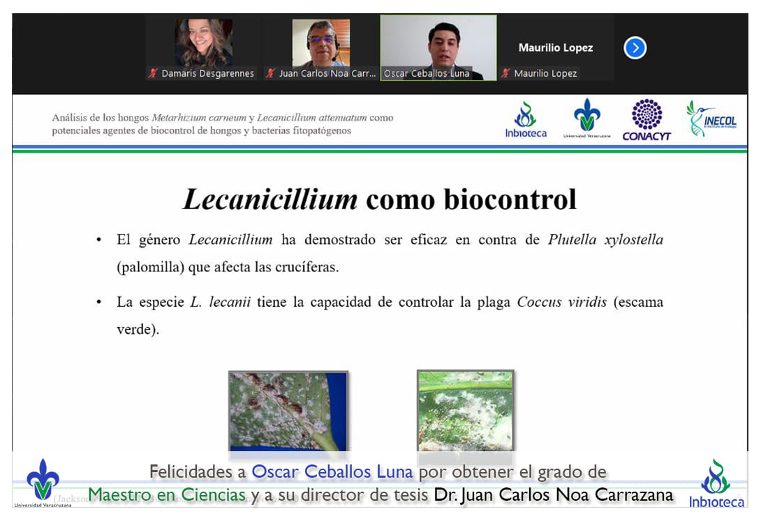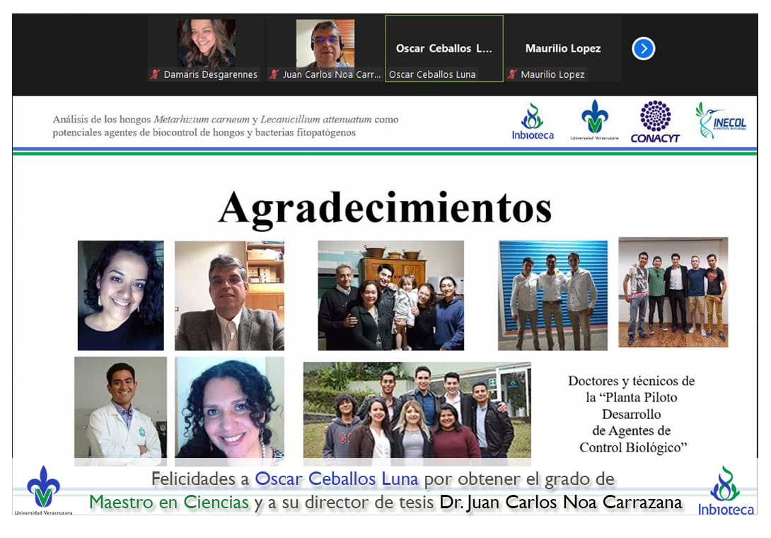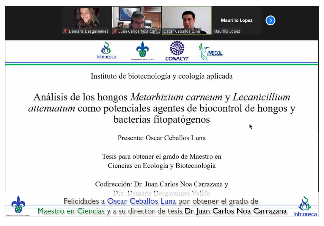 07 de enero de 2022.- A través de videoconferencia a las 10:00 horas, se realizó el examen de grado de Maestría con la defensa pública de la tesis intitulada: Análisis de los hongos Metarhizium carneum y Lecanicillium attenuatum como potenciales agentes de biocontrol de hongos y bacterias fitopatógenas. El jurado evaluador lo integró la Dra. Norma Flores Estévez (Presidenta), el Dr. Maurilio López Ortega (Secretario) y como invitada externa del INECOL, la Dra. Gloria Luz Carrión Villarnovo en calidad de (Vocal).