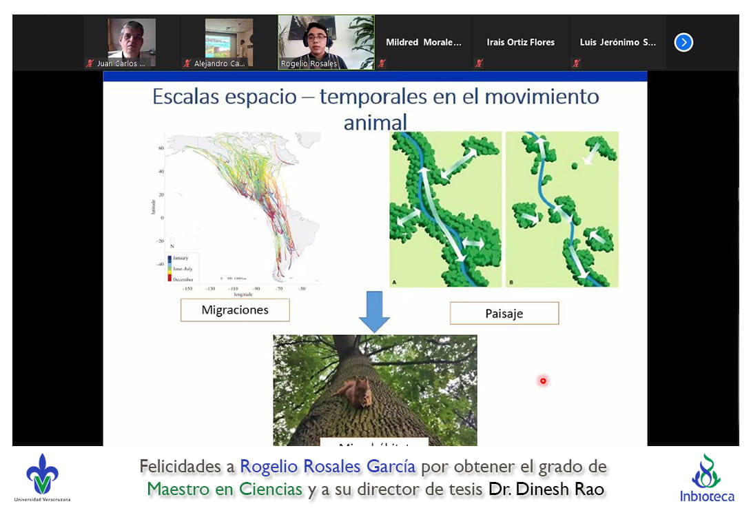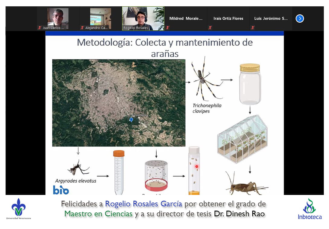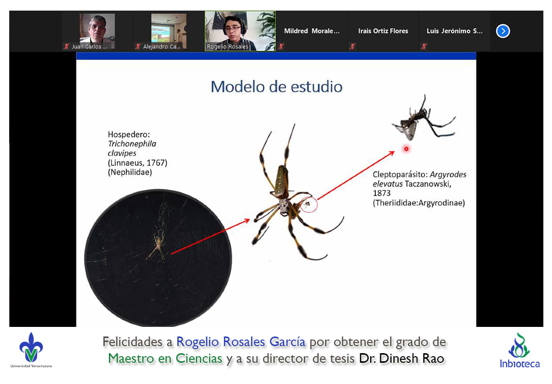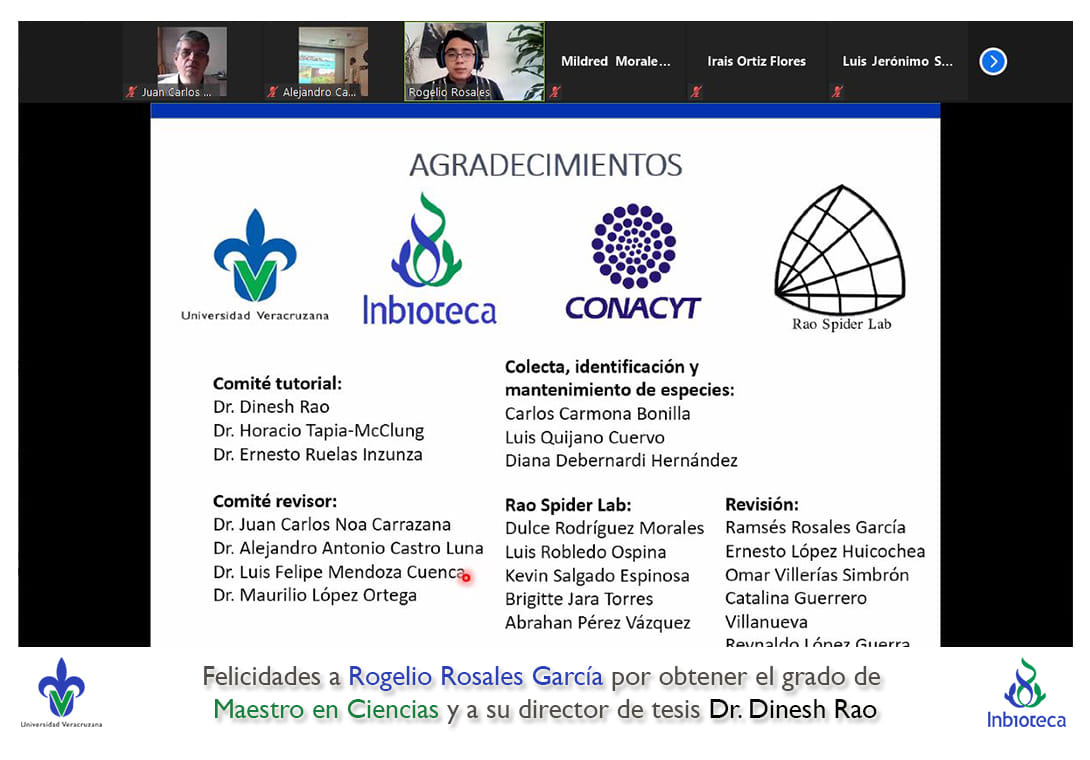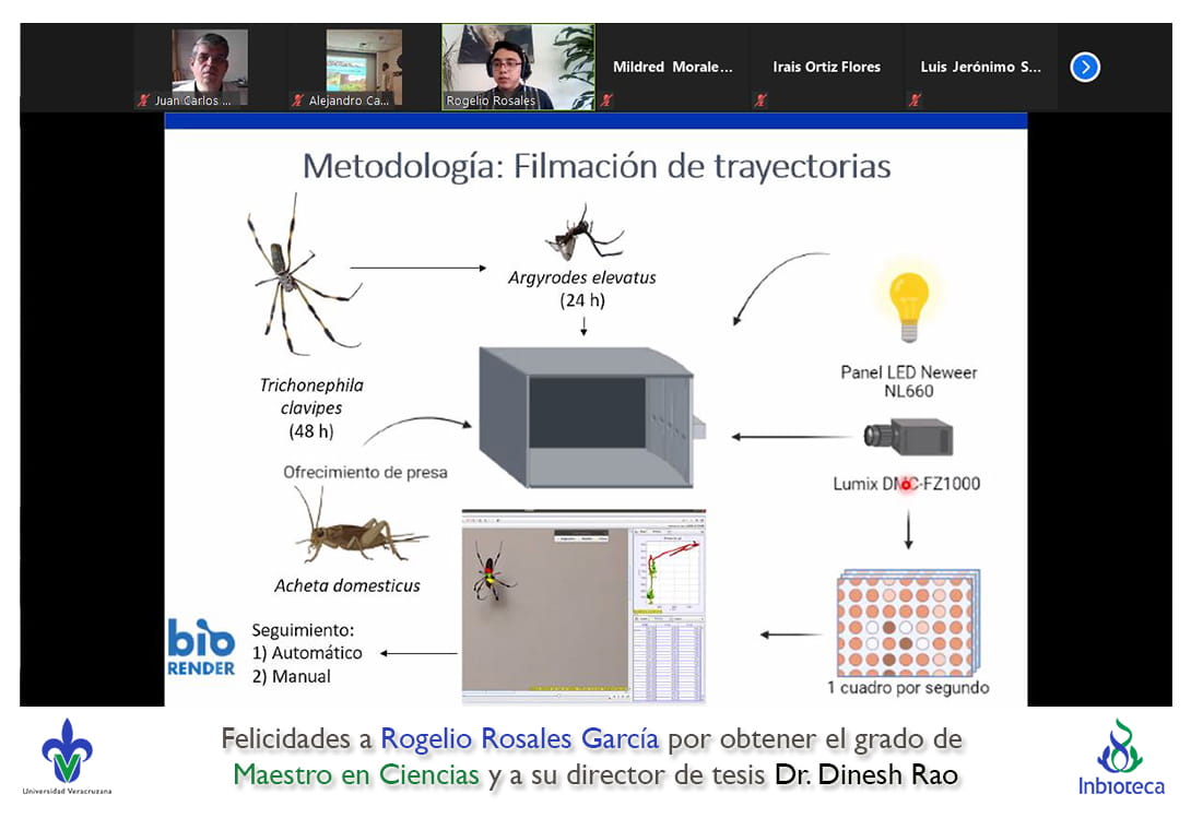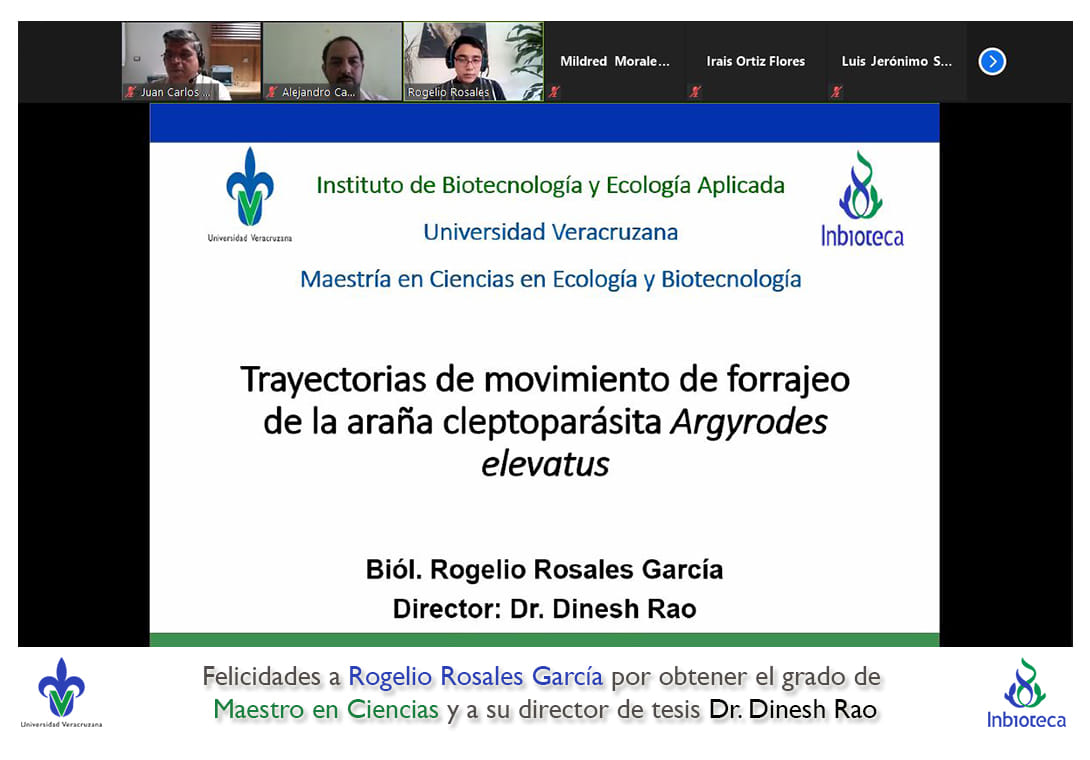 18 de junio de 2021.- A través de videoconferencia a las 12:00 horas, se realizó el examen de grado de Maestría con la defensa pública de la tesis intitulada: Trayectorias de movimiento de forrajeo de la araña cleptoparásita Argyrodes elevates. El jurado evaluador lo integró la Dr. Juan Carlos Noa Carrazana (Presidente), el Dr. Alejandro Antonio Castro Luna (Secretario) y como invitado externo del LANASE-UNAM, el Dr. Luis Felipe Mendoza Cuenca en calidad de (Vocal).