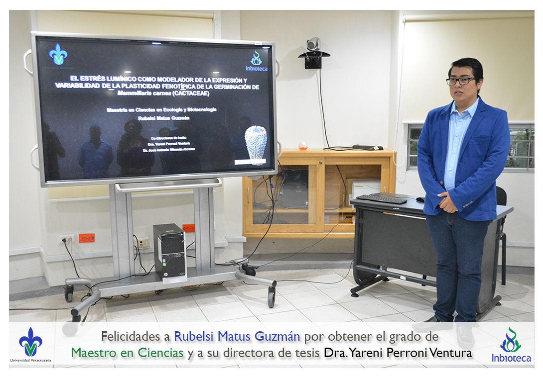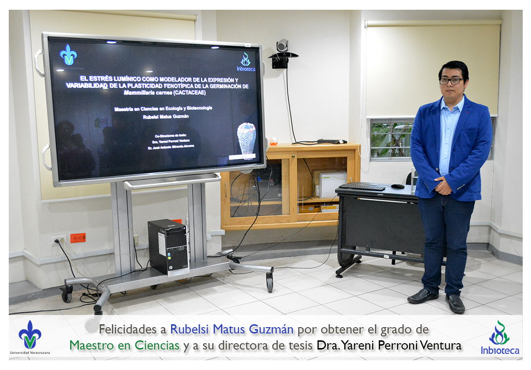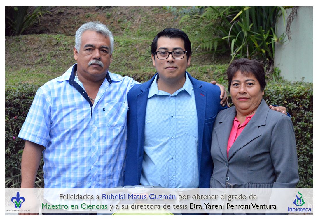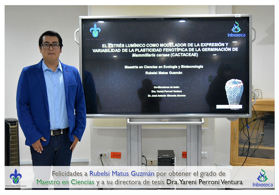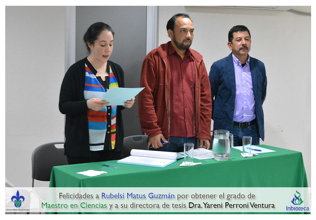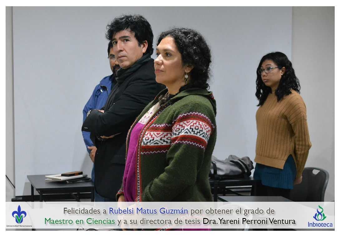 Felicidades a Rubelsi Matus Guzmán por obtener el grado de Maestro en Ciencias en Ecología y Biotecnología, a su directora de tesis Dra. Yareni Perroni Ventura, a su codirector de tesis Dr. José Antonio Miranda Jácome académico/investigador del Instituto de Investigaciones Biológicas (IIB-UV), a su comité y a todos los que contribuyeron en el trabajo realizado. ¡Enhorabuena!