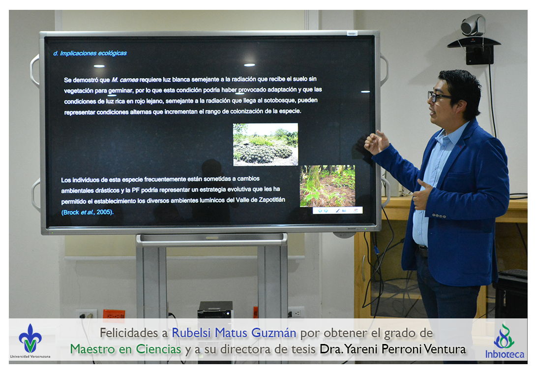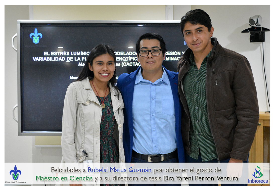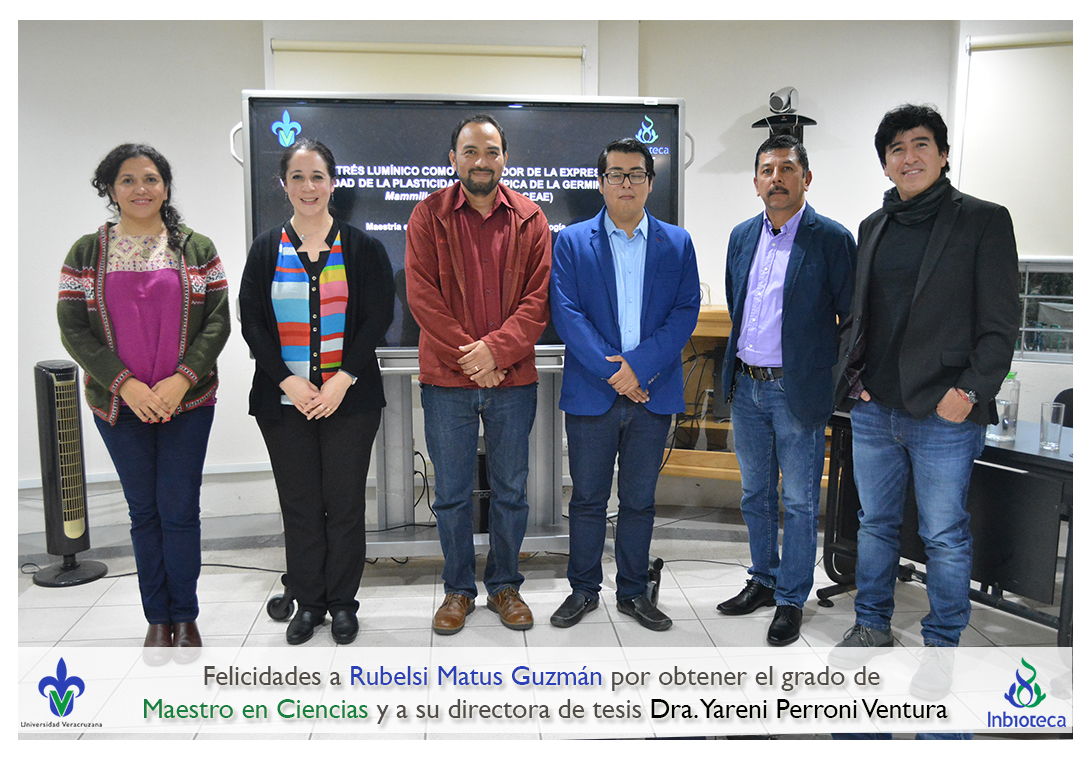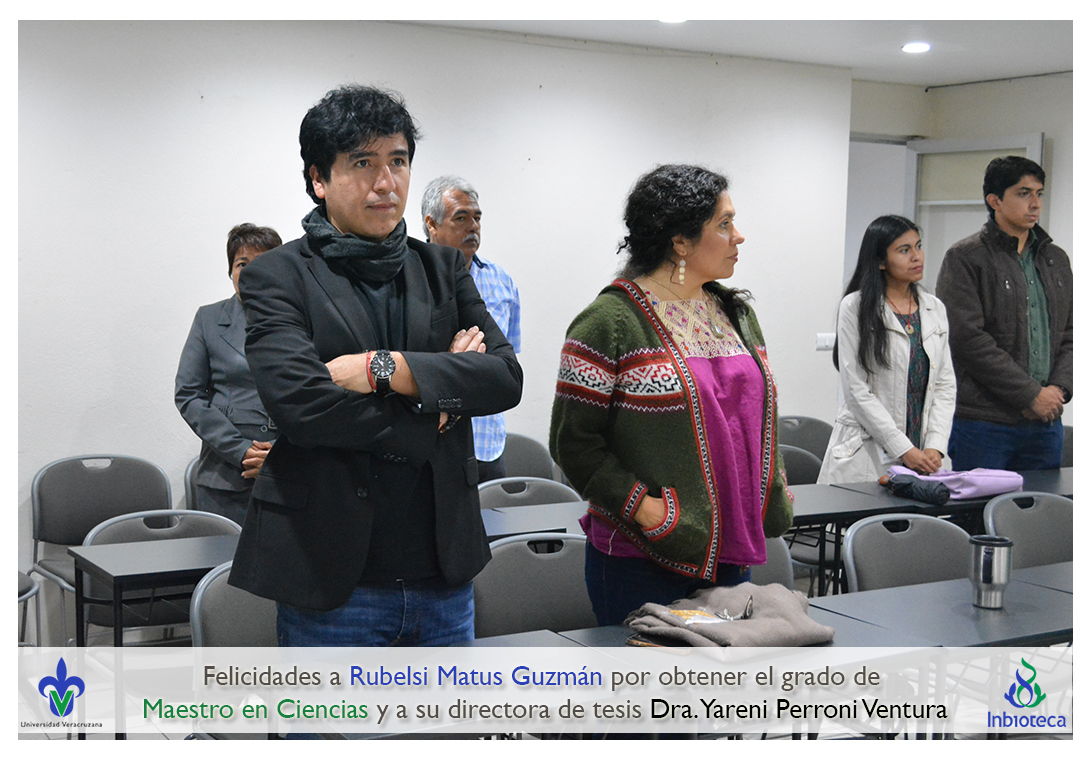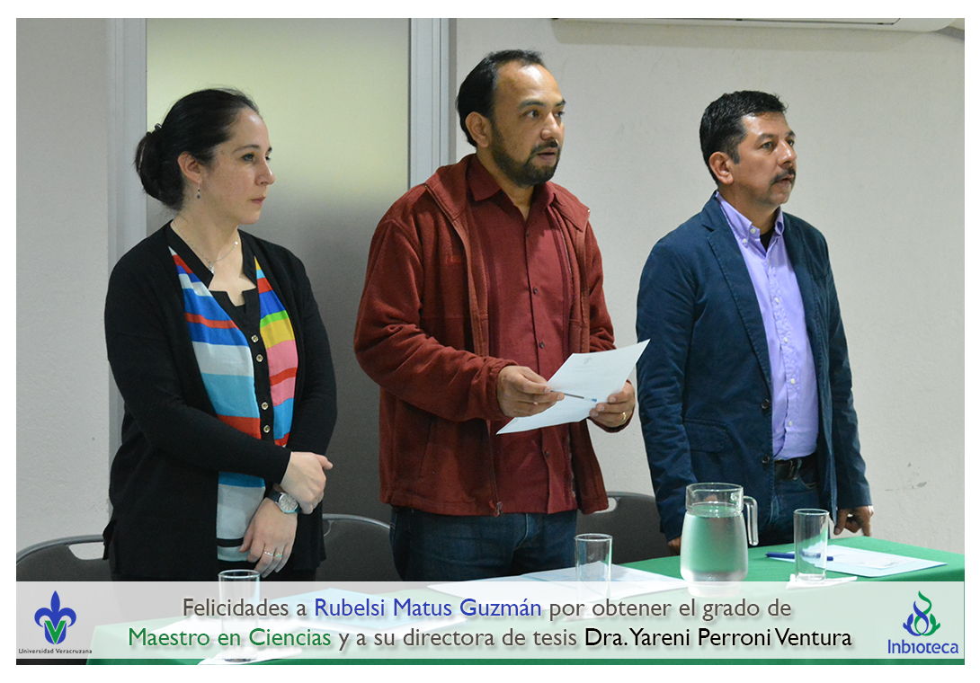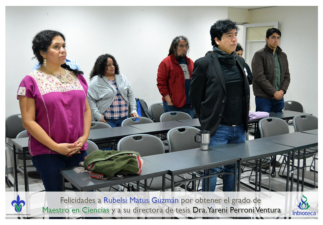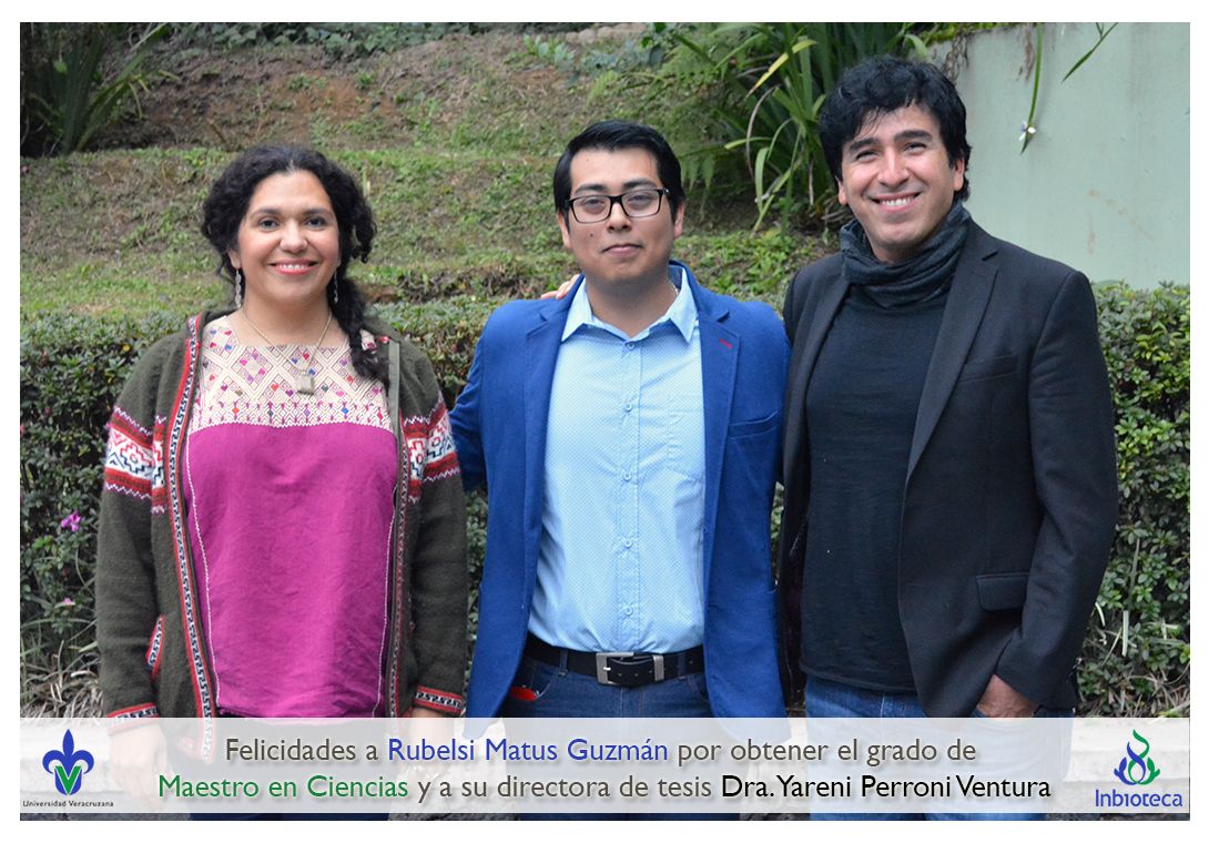 Felicidades a Rubelsi Matus Guzmán por obtener el grado de Maestro en Ciencias en Ecología y Biotecnología, a su directora de tesis Dra. Yareni Perroni Ventura, a su codirector de tesis Dr. José Antonio Miranda Jácome académico/investigador del Instituto de Investigaciones Biológicas (IIB-UV), a su comité y a todos los que contribuyeron en el trabajo realizado. ¡Enhorabuena!