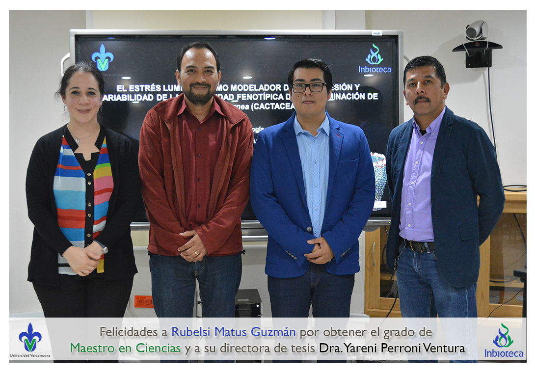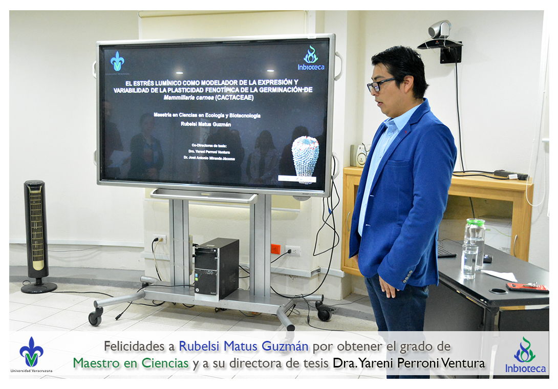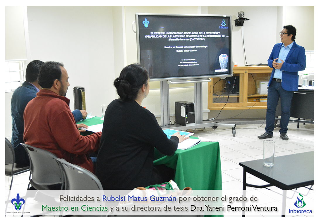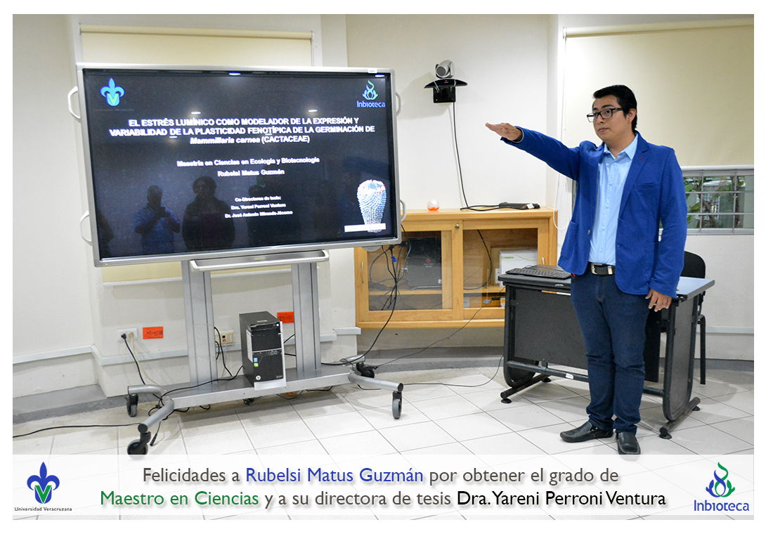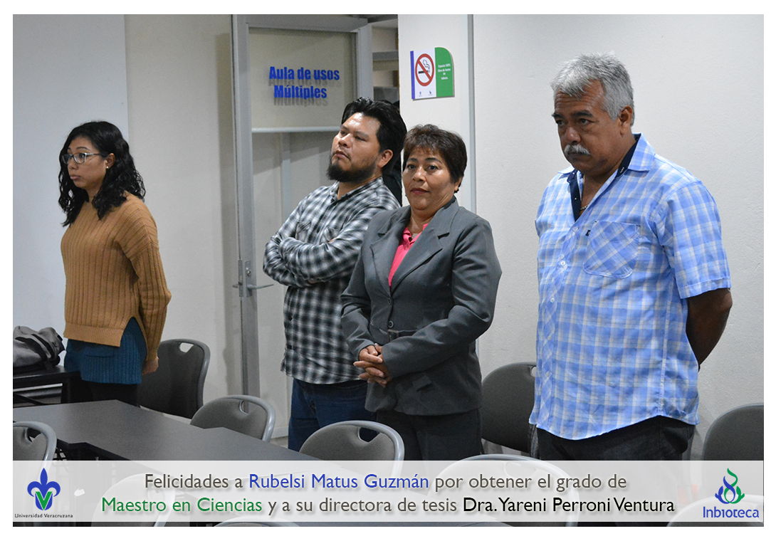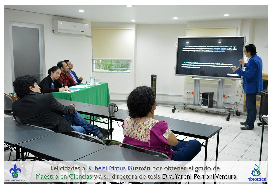 Felicidades a Rubelsi Matus Guzmán por obtener el grado de Maestro en Ciencias en Ecología y Biotecnología, a su directora de tesis Dra. Yareni Perroni Ventura, a su codirector de tesis Dr. José Antonio Miranda Jácome académico/investigador del Instituto de Investigaciones Biológicas (IIB-UV), a su comité y a todos los que contribuyeron en el trabajo realizado. ¡Enhorabuena!