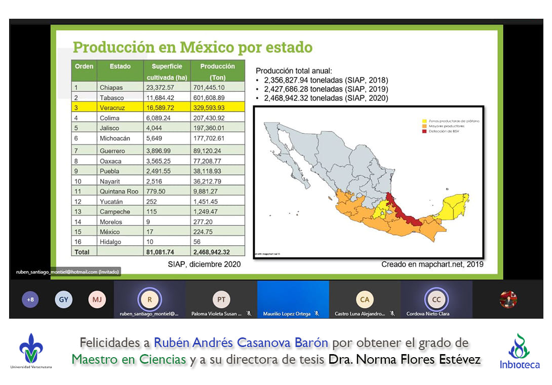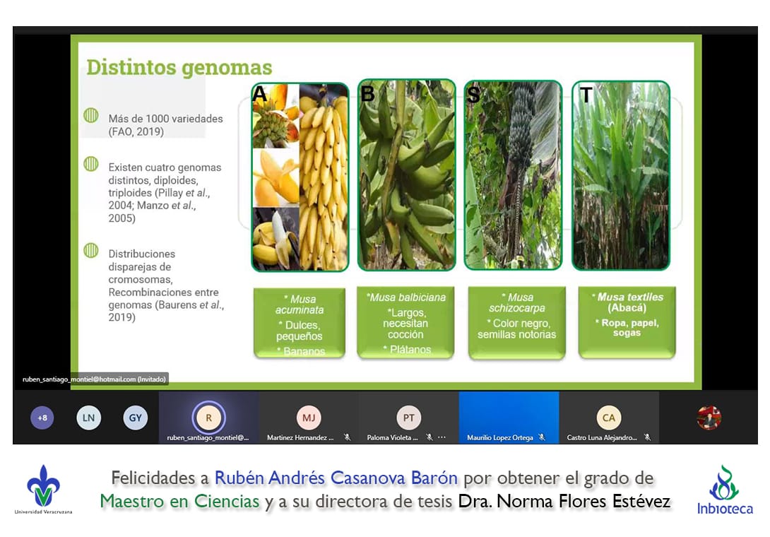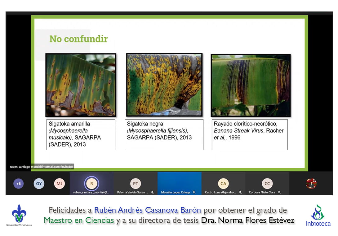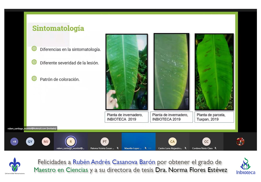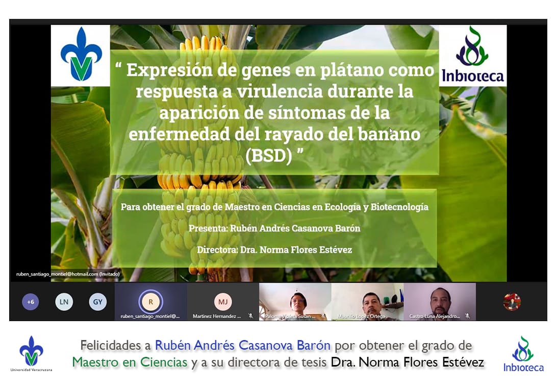 31 de mayo de 2021.- A través de videoconferencia, a las 10:00 horas, se realizó el examen de grado de Maestría con la defensa pública de la tesis intitulada: Cambios en la expresión de tres genes en plátano durante la aparición de síntomas de la enfermedad del rayado del banano (BSD). El jurado evaluador lo integró el Dr. Alejandro Antonio Castro Luna (Presidente), el Dr. Maurilio López Ortega (Secretario) y la Dra. Paloma Violeta Susan Tepetlan (Vocal).