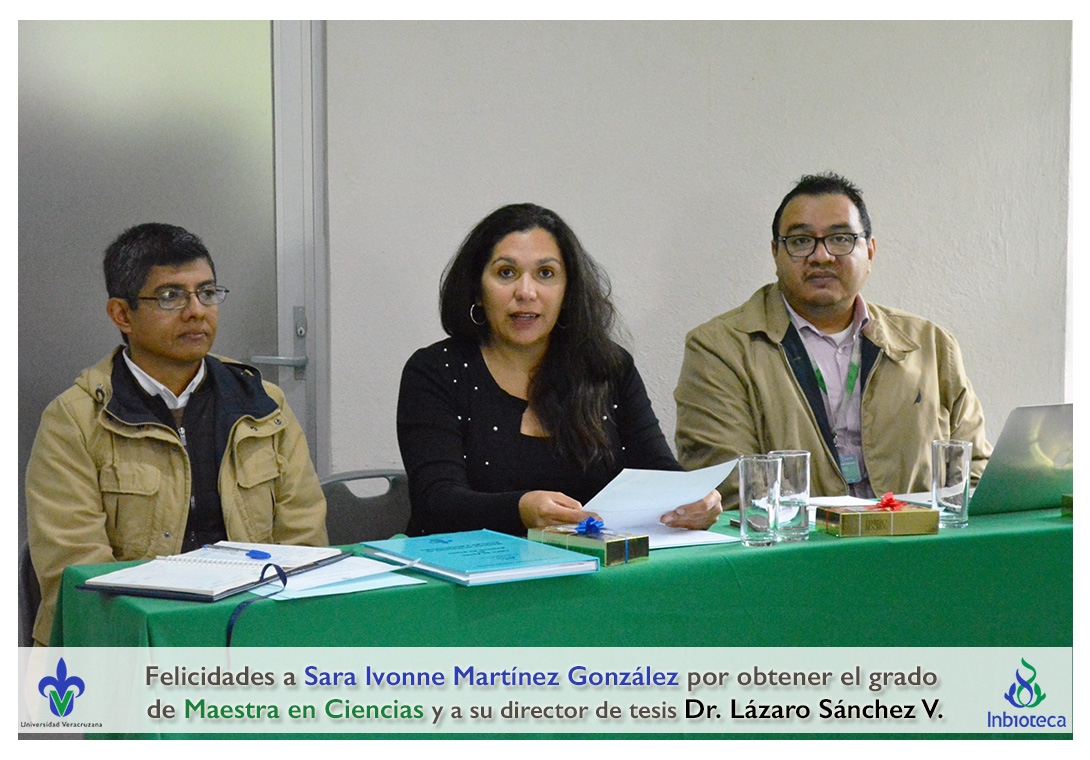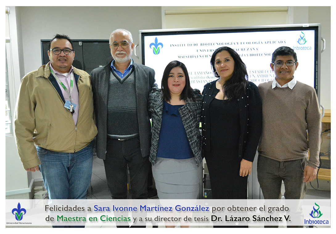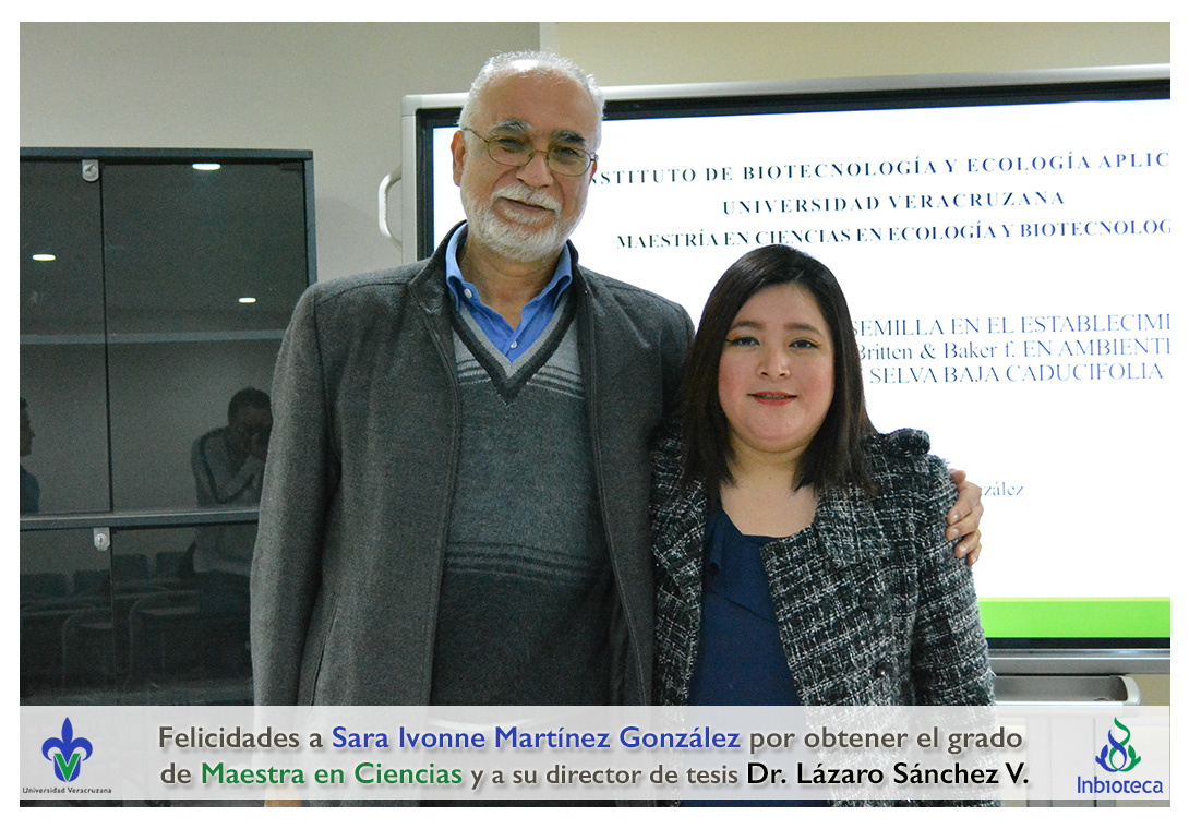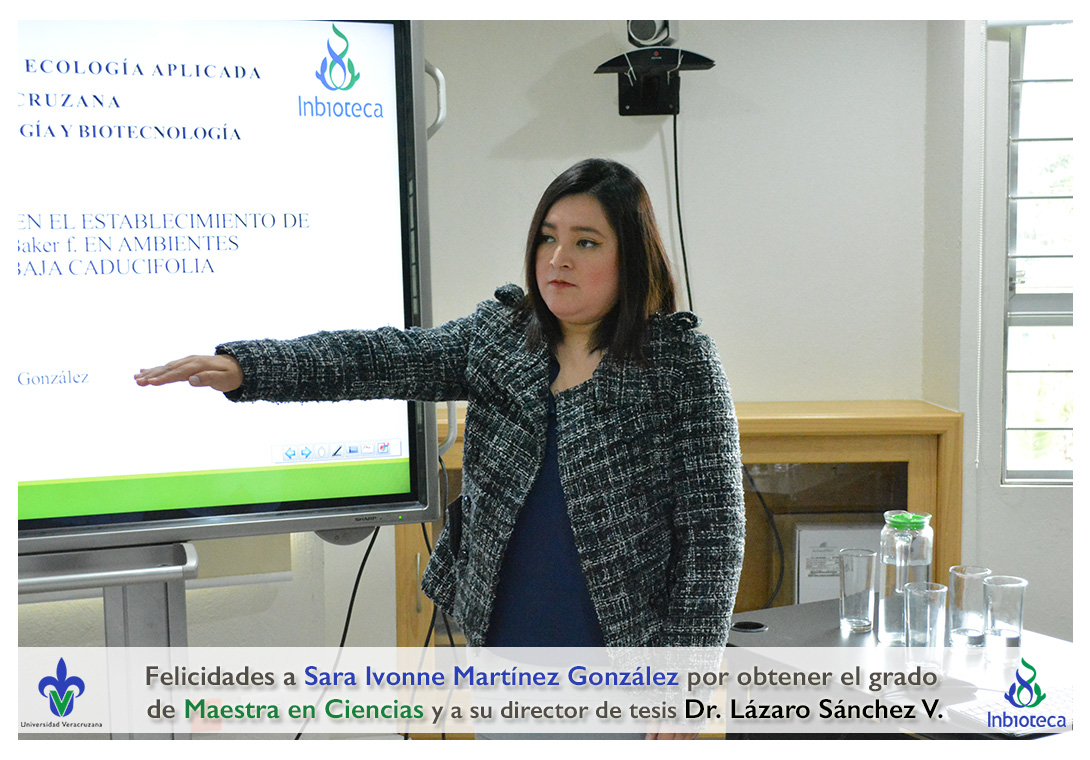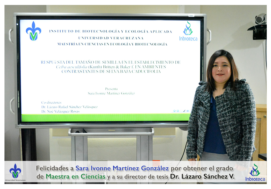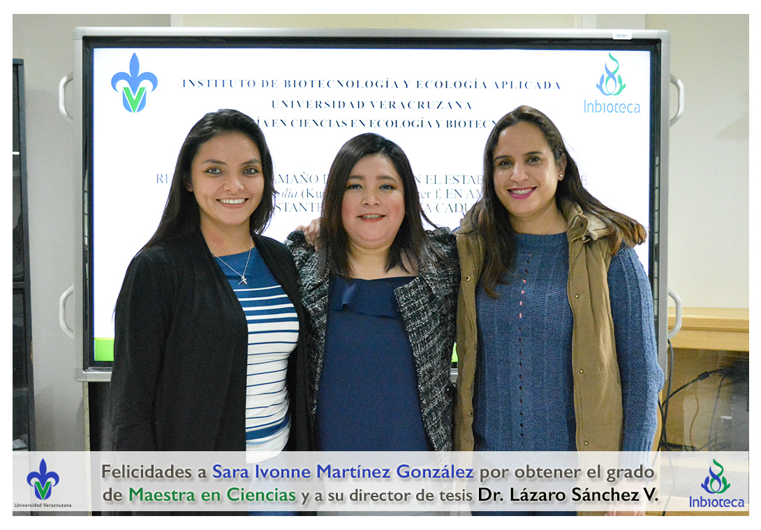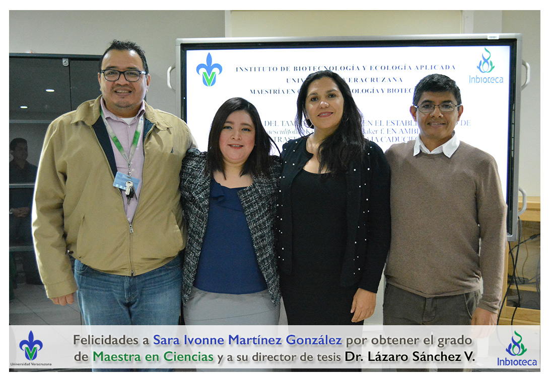 Felicidades a Sara Ivonne Martínez González por obtener el grado de Maestra en Ciencias en Ecología y Biotecnología, a su director de tesis Dr. Lázaro Rafael Sánchez Velásquez, a su codirector Dr. Noé Velázquez Rosas, a su comité y a todos los que contribuyeron en el trabajo realizado. ¡Enhorabuena!