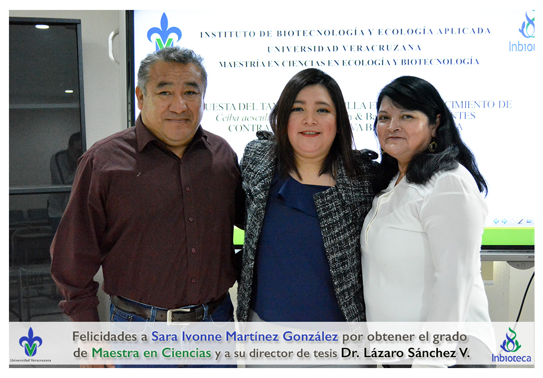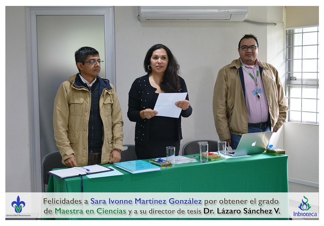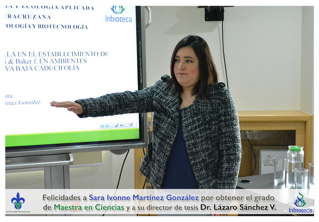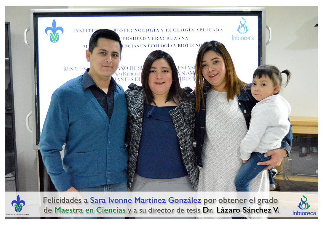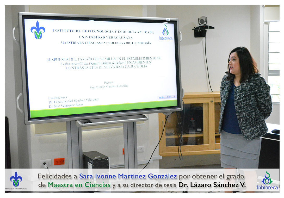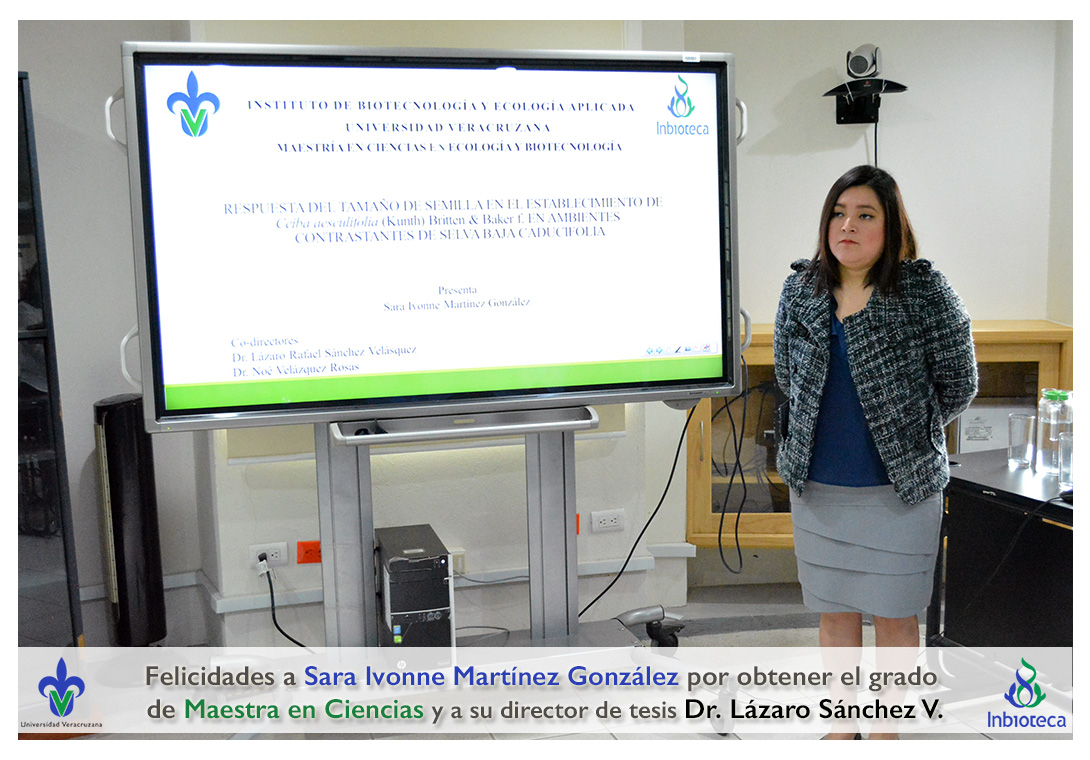 Felicidades a Sara Ivonne Martínez González por obtener el grado de Maestra en Ciencias en Ecología y Biotecnología, a su director de tesis Dr. Lázaro Rafael Sánchez Velásquez, a su codirector Dr. Noé Velázquez Rosas, a su comité y a todos los que contribuyeron en el trabajo realizado. ¡Enhorabuena!