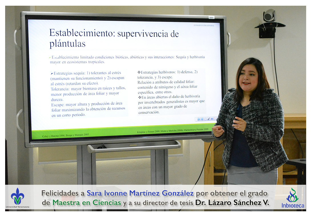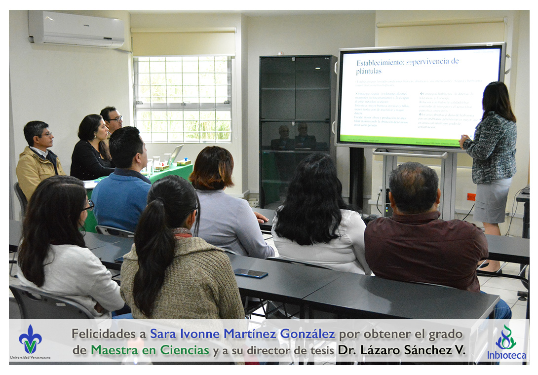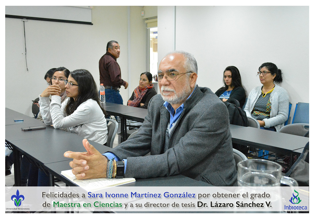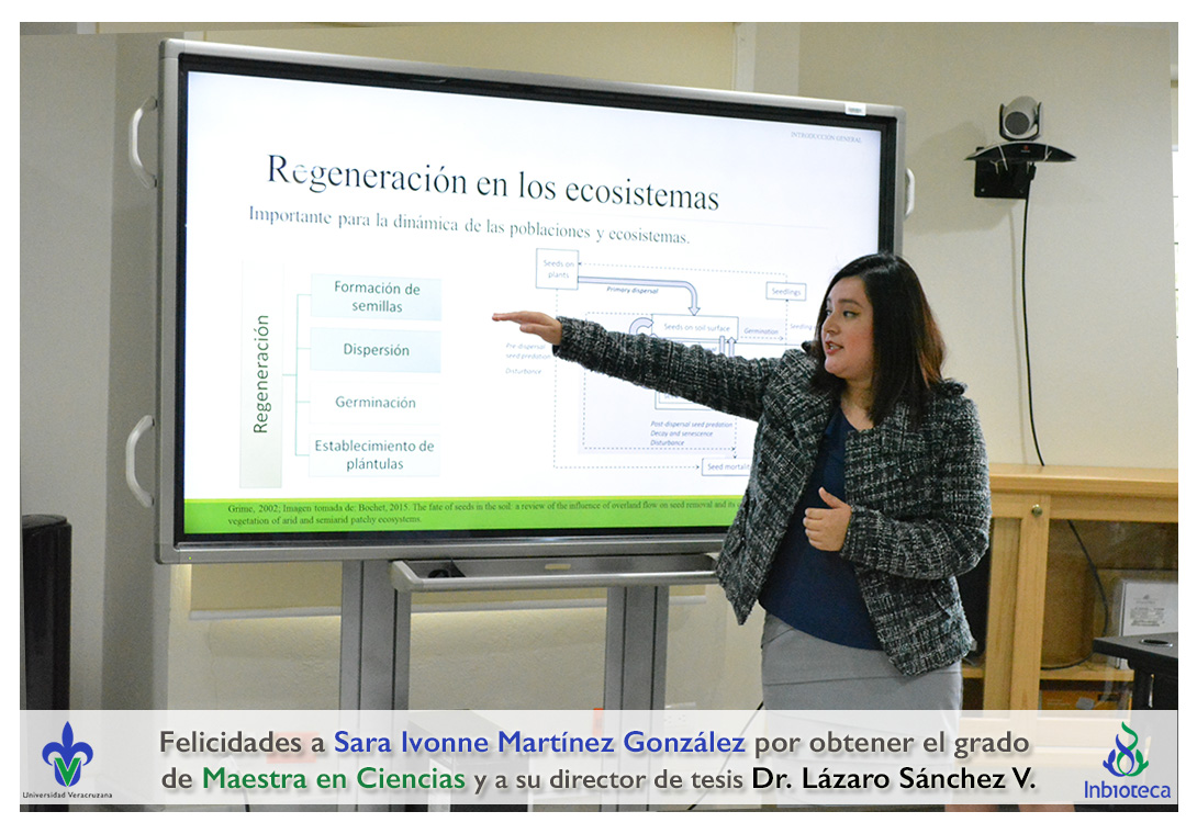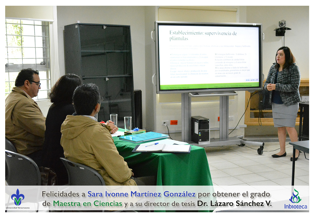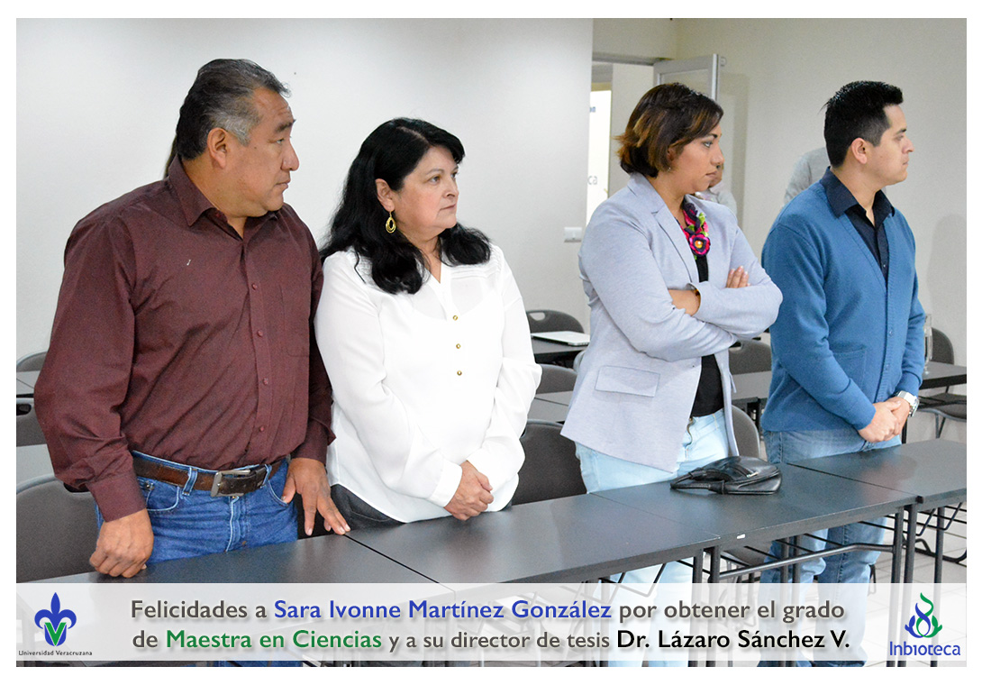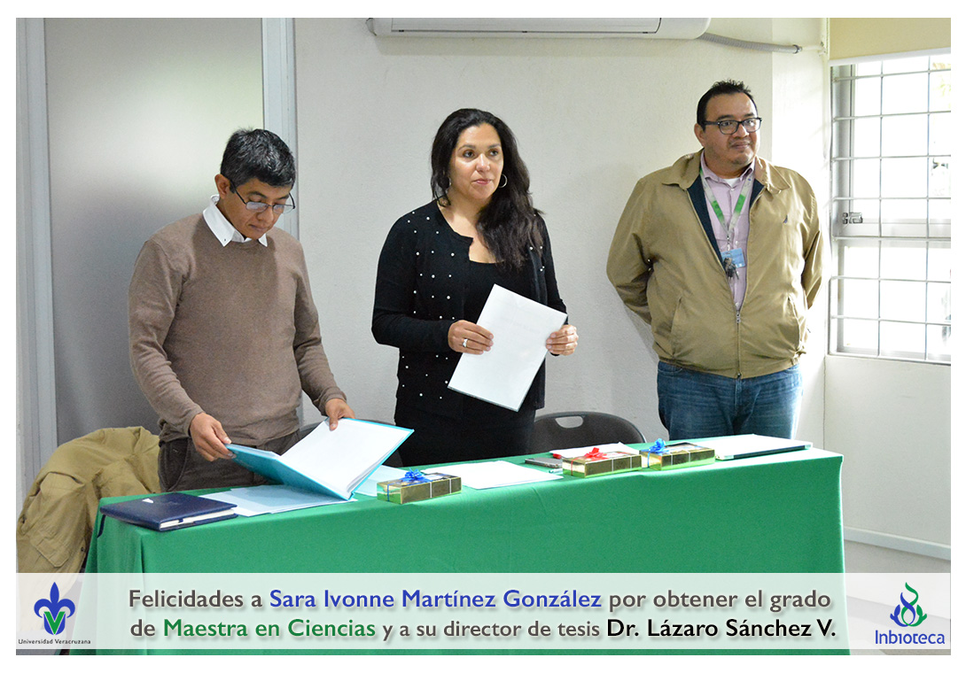 Felicidades a Sara Ivonne Martínez González por obtener el grado de Maestra en Ciencias en Ecología y Biotecnología, a su director de tesis Dr. Lázaro Rafael Sánchez Velásquez, a su codirector Dr. Noé Velázquez Rosas, a su comité y a todos los que contribuyeron en el trabajo realizado. ¡Enhorabuena!