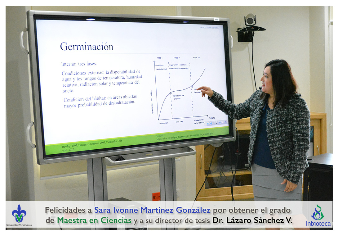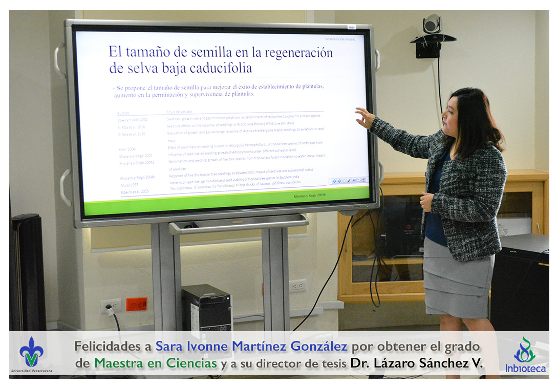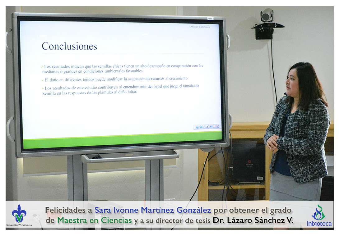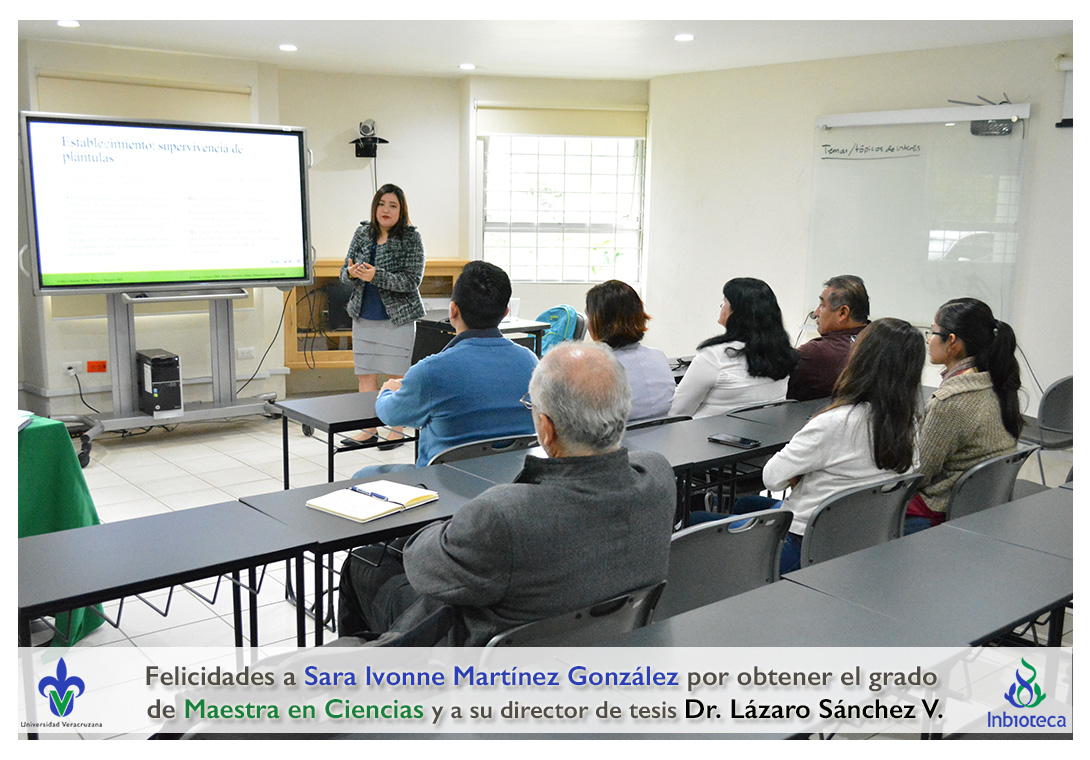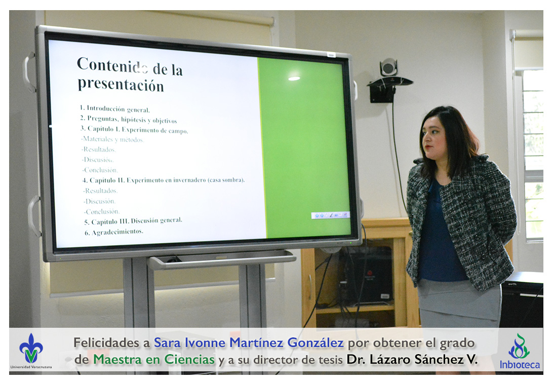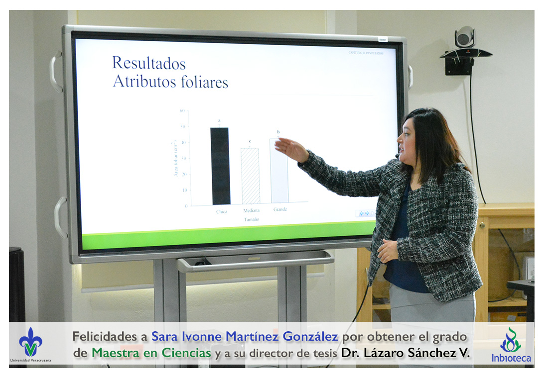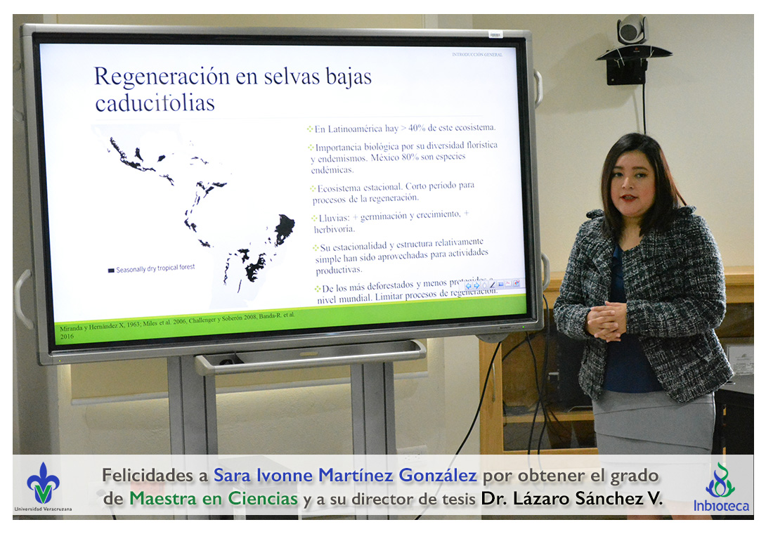 Felicidades a Sara Ivonne Martínez González por obtener el grado de Maestra en Ciencias en Ecología y Biotecnología, a su director de tesis Dr. Lázaro Rafael Sánchez Velásquez, a su codirector Dr. Noé Velázquez Rosas, a su comité y a todos los que contribuyeron en el trabajo realizado. ¡Enhorabuena!