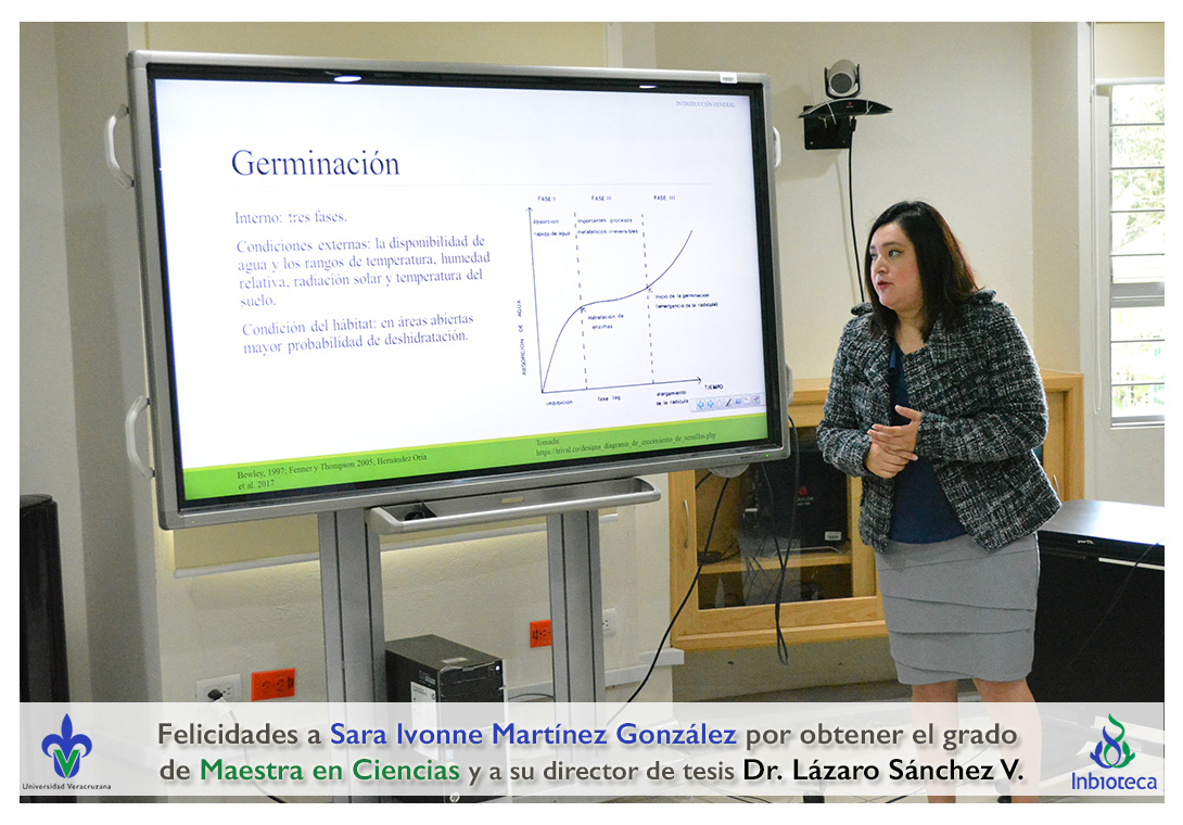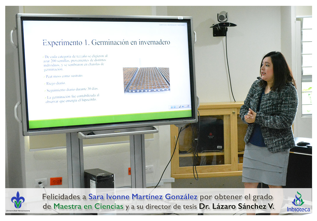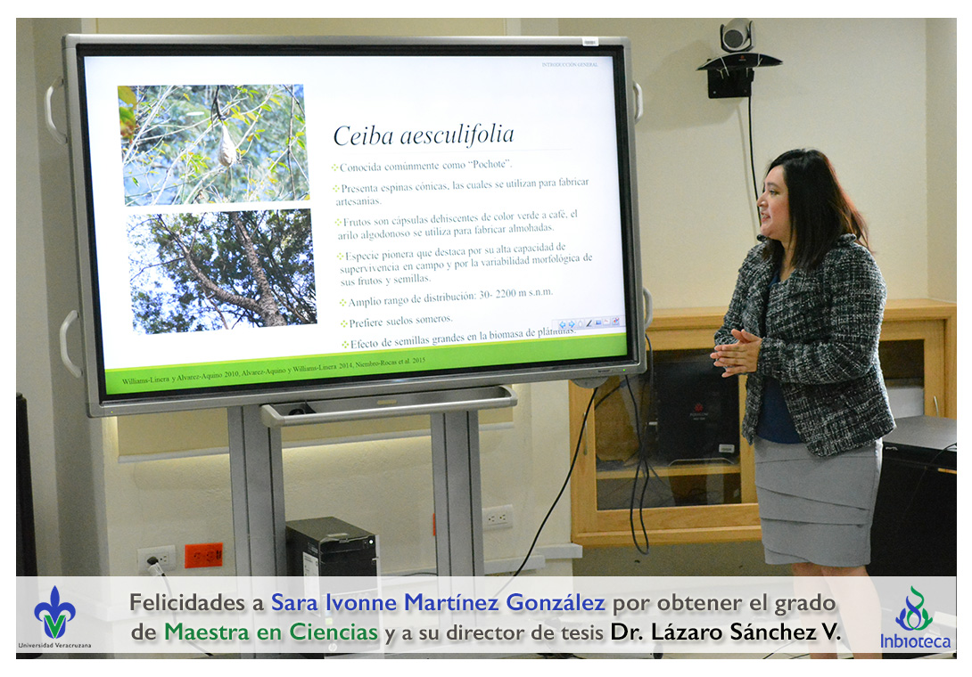 14 de enero de 2019.- En el Aula de Usos Múltiples del INBIOTECA a las 10:00 horas, se realizó el examen de grado de Maestría con la defensa pública de la tesis titulada: "Respuesta del tamaño de semilla en el establecimiento de Ceiba aesculifolia (Kunth) Britten & Baker f. en ambientes contrastantes de selva baja caducifolia".