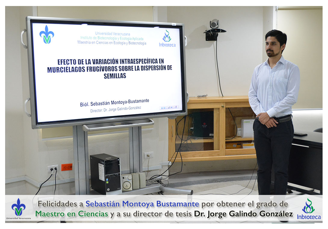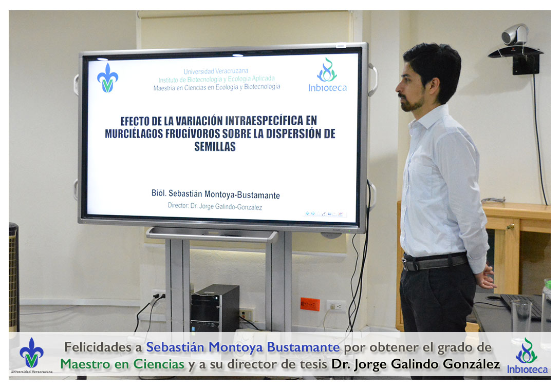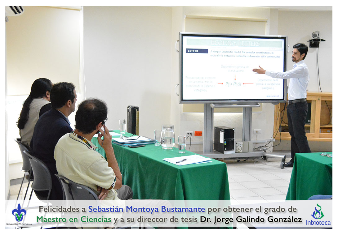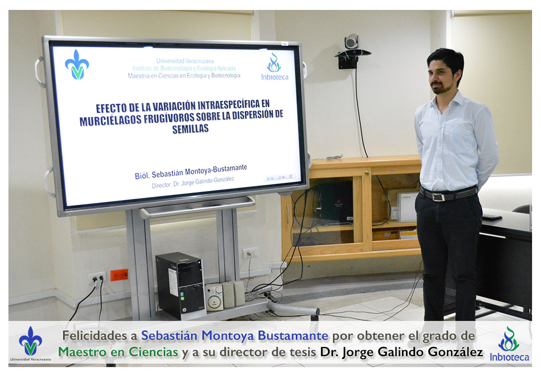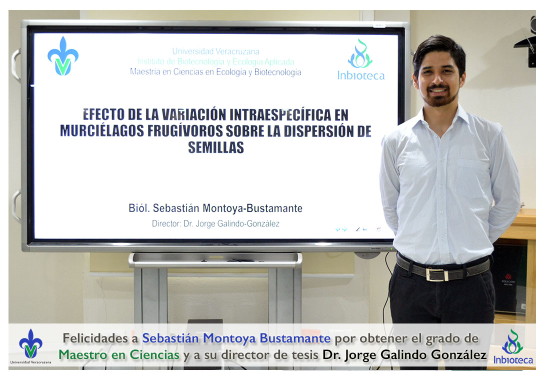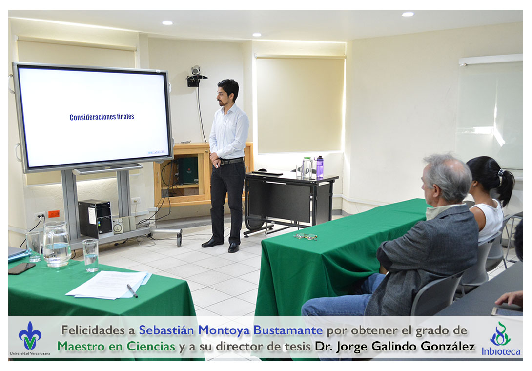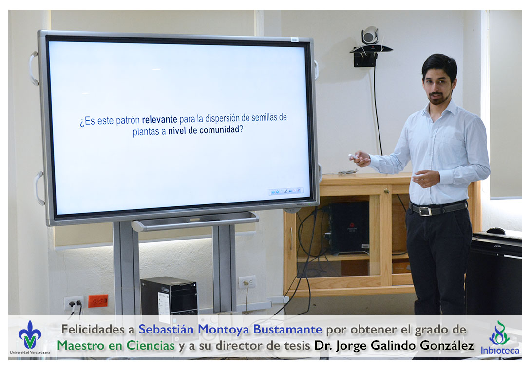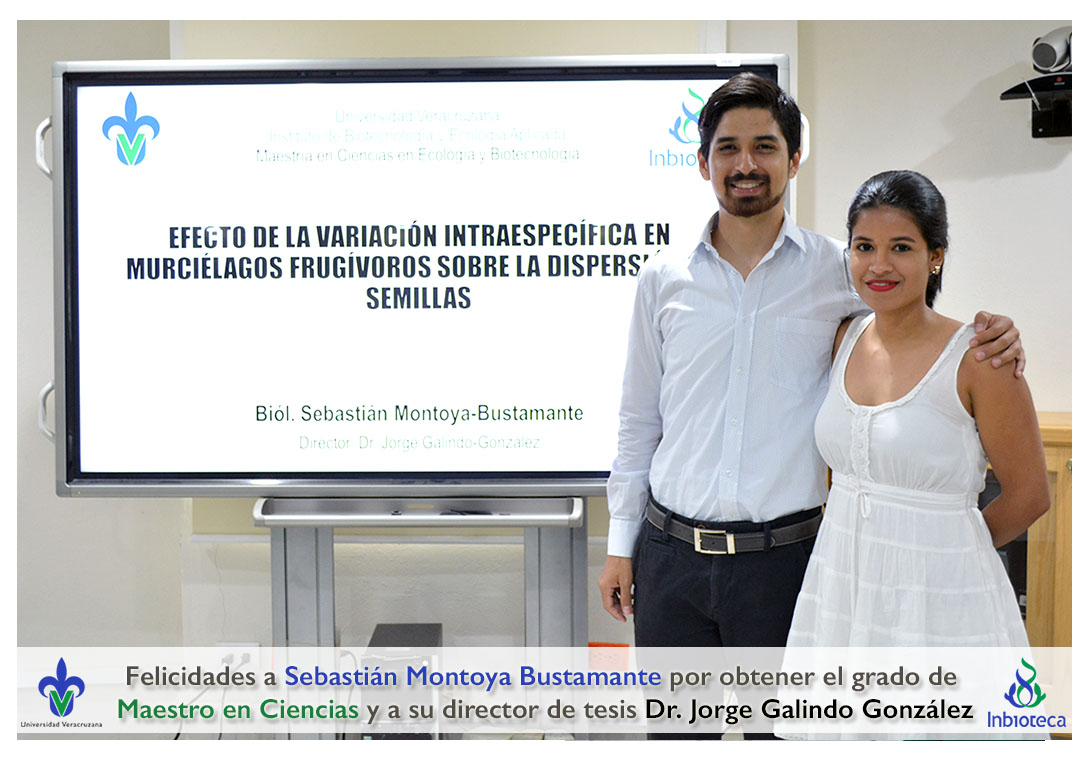 Felicidades a Sebastián Montoya Bustamante por obtener el grado de Maestro en Ciencias en Ecología y Biotecnología, a su director de tesis Dr. Jorge Rodrígo Galindo González, a su comité y a todos los que contribuyeron en el trabajo realizado. ¡Enhorabuena!