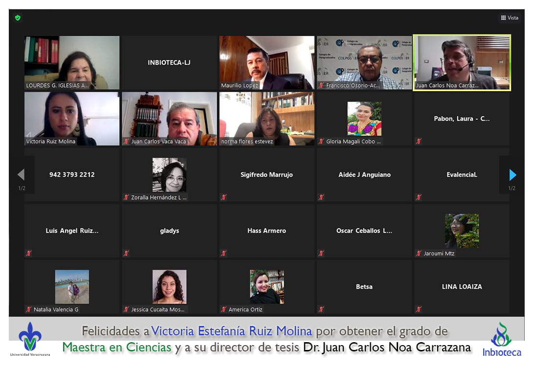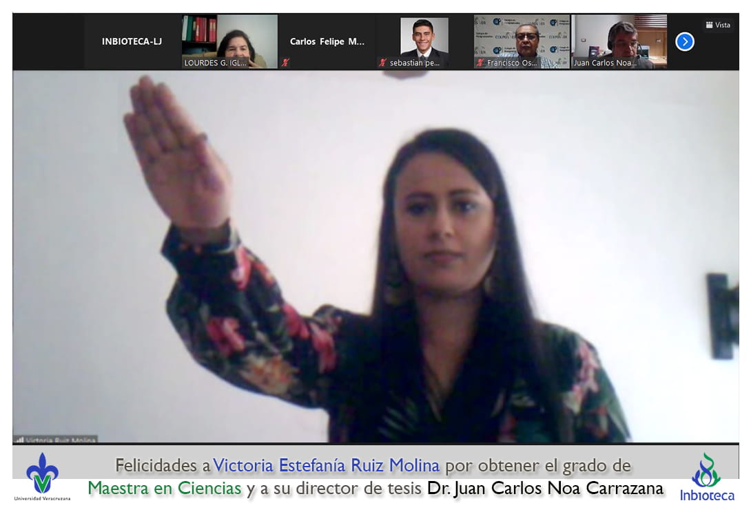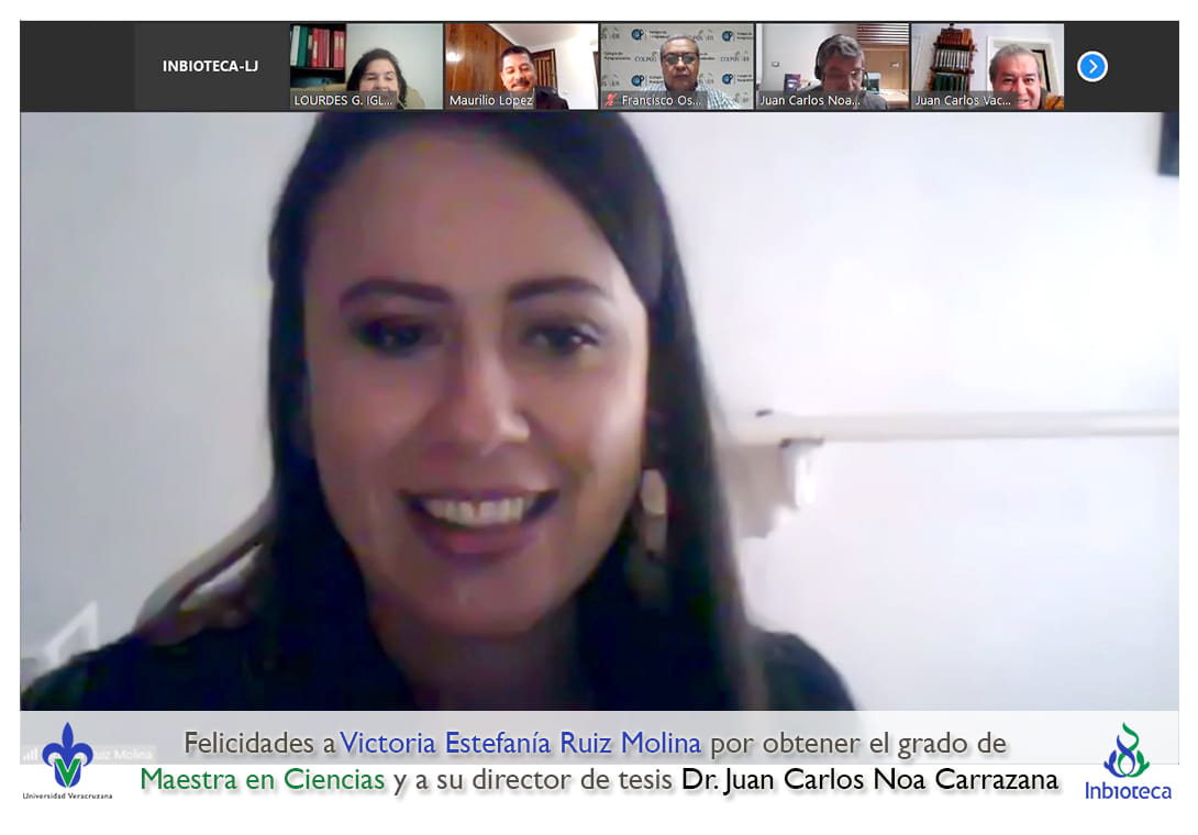 Felicidades a Victoria Estefanía Ruiz Molina por obtener el grado de Maestra en Ciencias en Ecología y Biotecnología por Unanimidad con Mención Honorífica, a su director de tesis Dr. Juan Carlos Noa Carrazana, a su codirector de tesis Dr. Juan Carlos Vaca Vaca, a su comité y a todos los que contribuyeron en el trabajo realizado. ¡Enhorabuena!