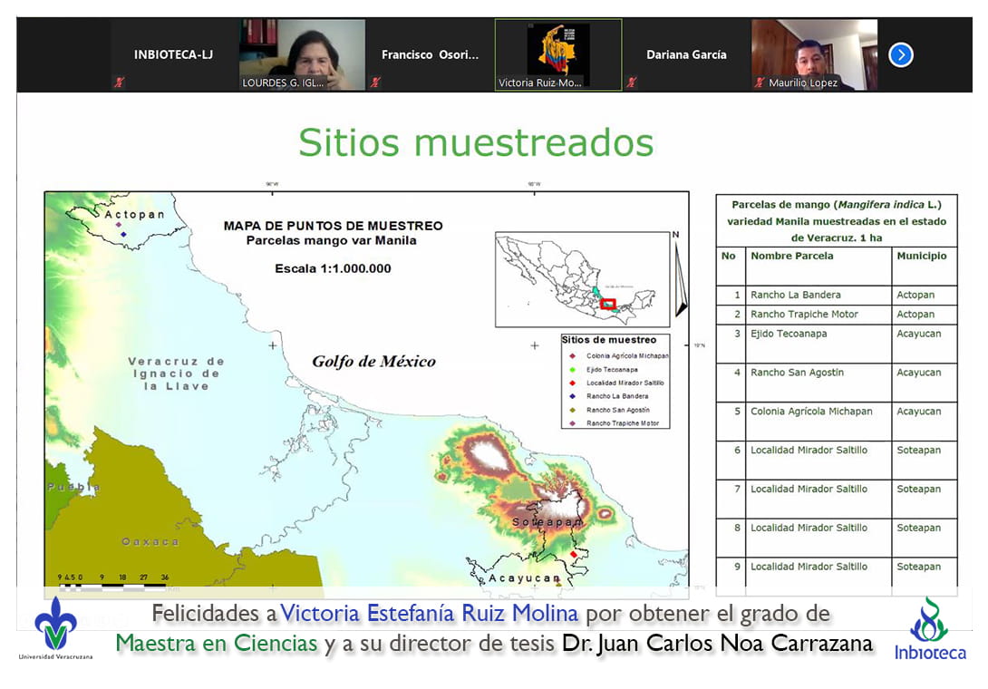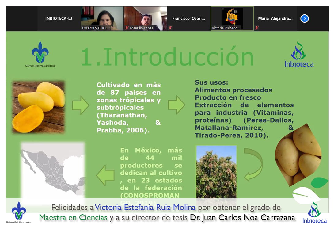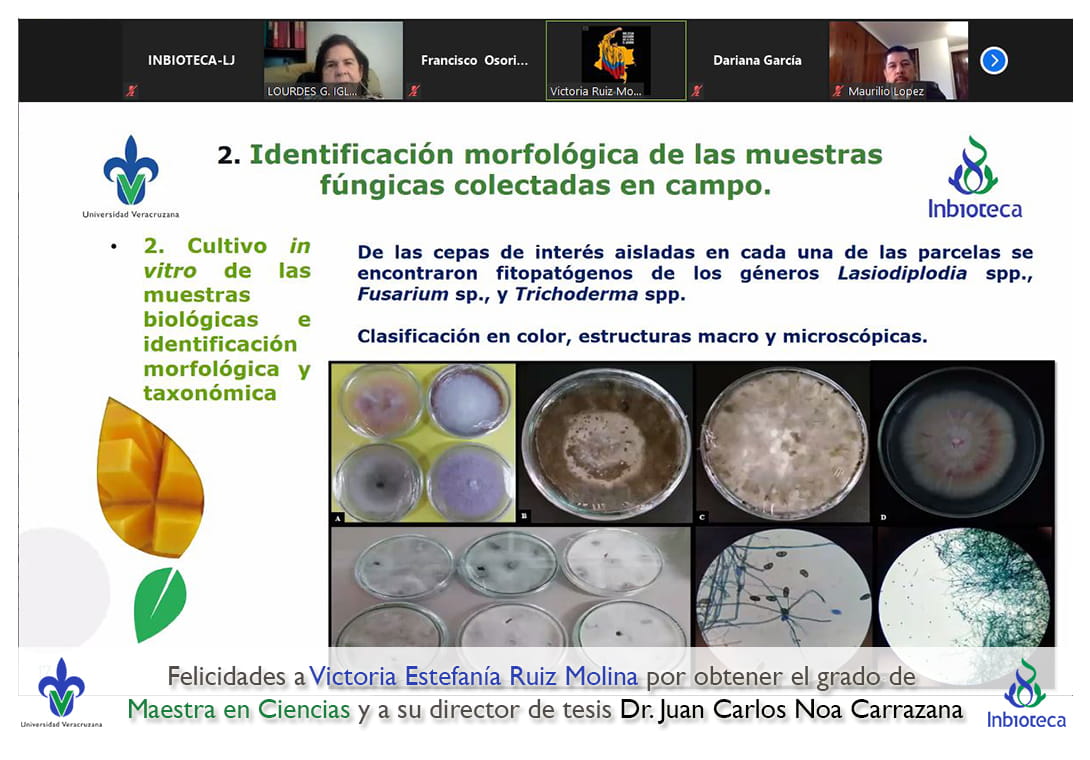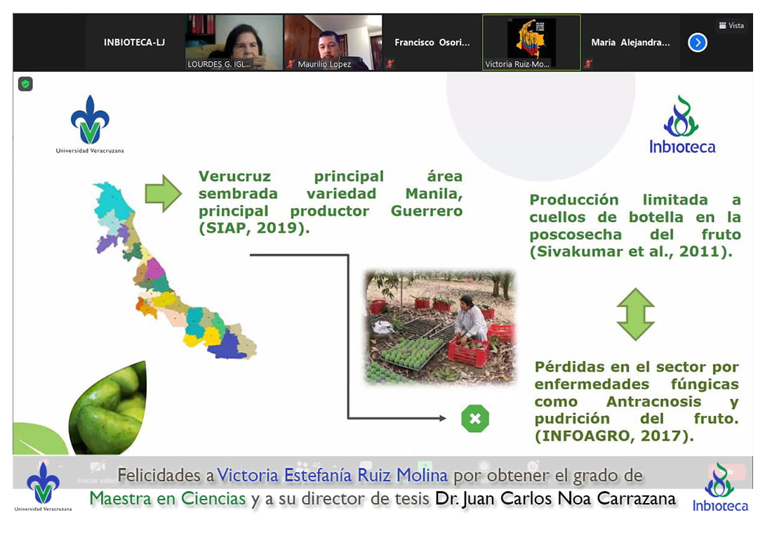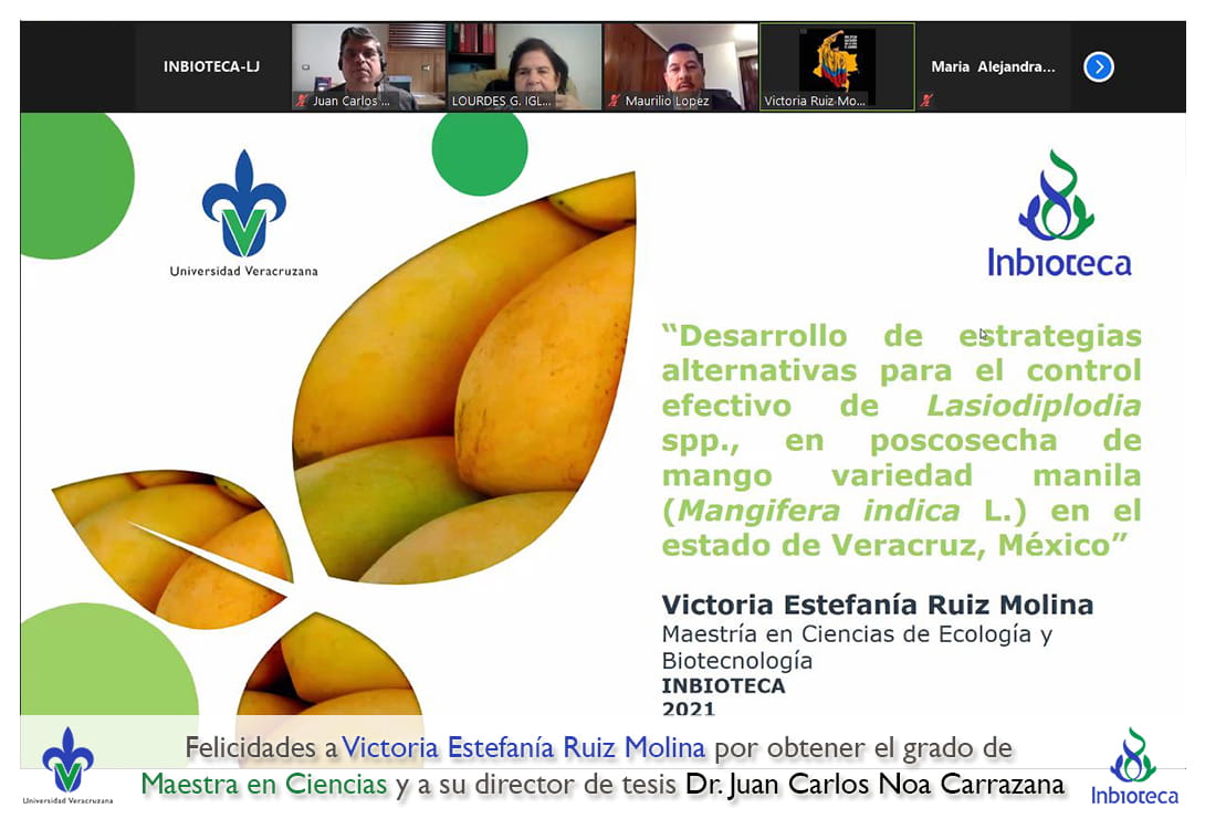 04 de junio de 2021.- A través de videoconferencia a las 10:00 horas, se realizó el examen de grado de Maestría con la defensa pública de la tesis intitulada: Desarrollo de estrategias alternativas de control para Lasiodiplodia spp., en la poscosecha de mango var. Manila (Mangifera indica L.) en el estado de Veracruz, México). El jurado evaluador lo integró el Dr. Maurilio López Ortega (Presidente), la Dra. Lourdes Georgina Iglesias Andreu (Secretaria) y como invitado externo del COLPOS-veracruz, el Dr. Francisco Osorio Acosta en calidad de (Vocal).