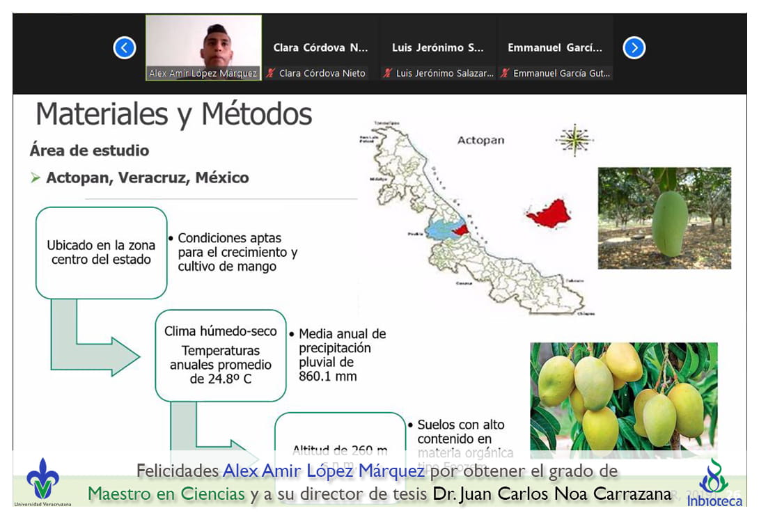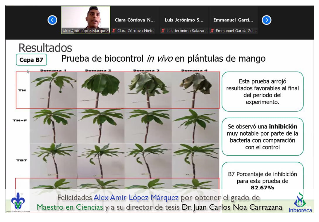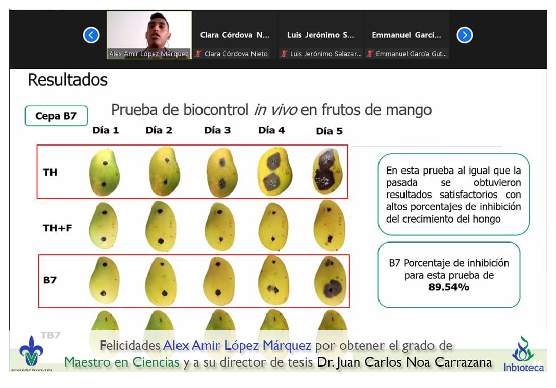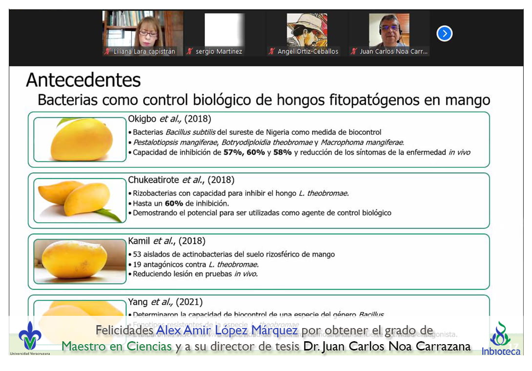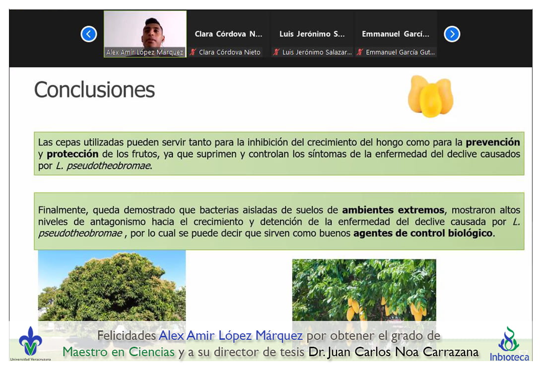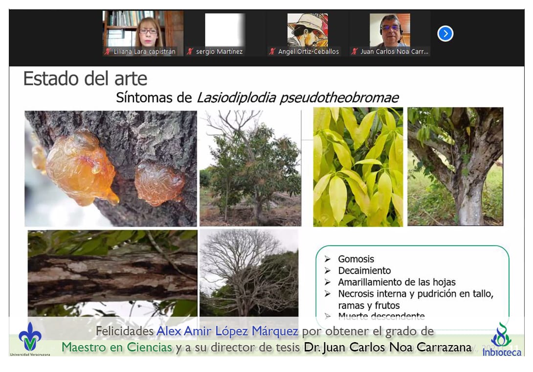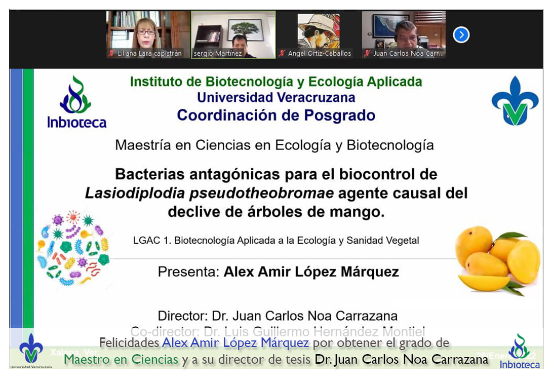 25 de enero de 2022.- A través de videoconferencia a las 11:00 horas, se realizó el examen de grado de Maestría con la defensa pública de la tesis intitulada: Bacterias antagónicas para el biocontrol de Lasiodiplodia pseudotheobromae agente causal del declive de árboles de mango. El jurado evaluador lo integró el Dr. Sergio Martínez Hernández (Presidente), el Dr. Angel Isauro Ortiz Ceballos (Secretario) y como invitada externa de la Facultade de Ciencias Agrícolas (UV), la Dra. Liliana Lara Capistrán en calidad de (Vocal).
