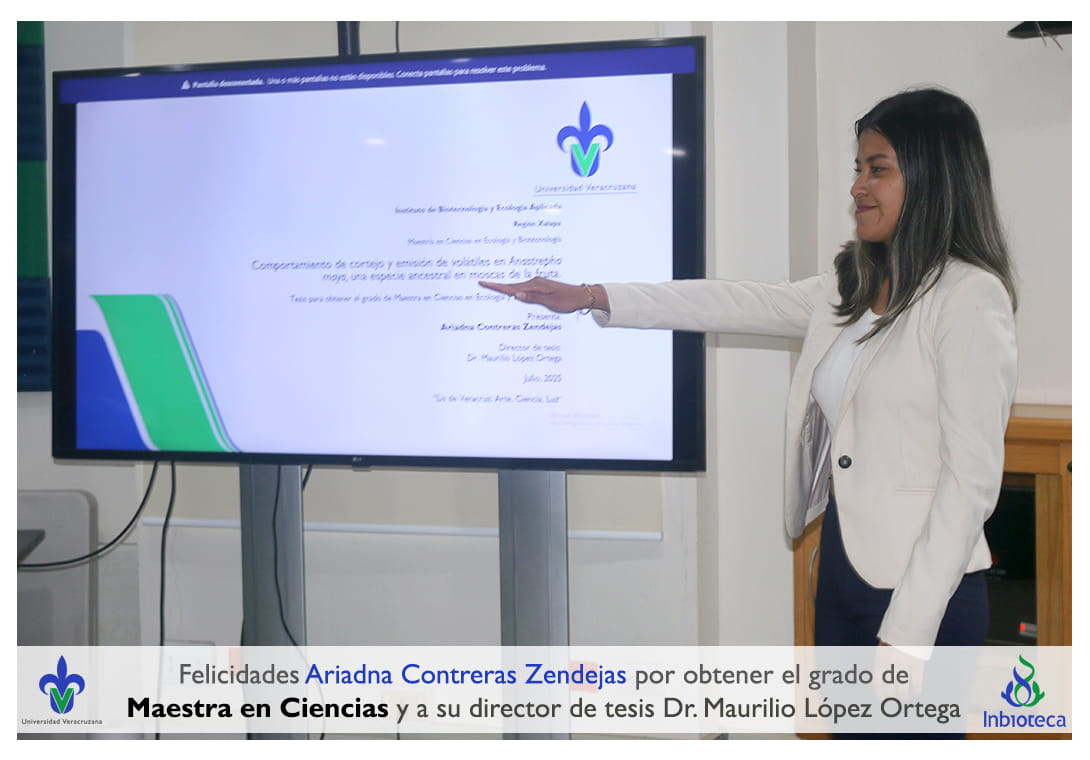 03 de julio de 2025.- En el Aula Híbrida del INBIOTECA a las 16:00 horas, se realizó el examen de grado de Maestría con la defensa pública de la tesis intitulada: Comportamiento y volátiles químicos en Anastrepha maya, una especie ancestral en moscas de la fruta. El jurado evaluador lo integró el Dr. Francisco Díaz Fleischer (Presidente), el Dr. Ana Elena Dorantes Acosta (Secretaria), y como invitada del Instituto de Investigaciones en Inteligencia Artificial (IIIA-UV), la Dra. Guadalupe Córdova García (Vocal Externa).