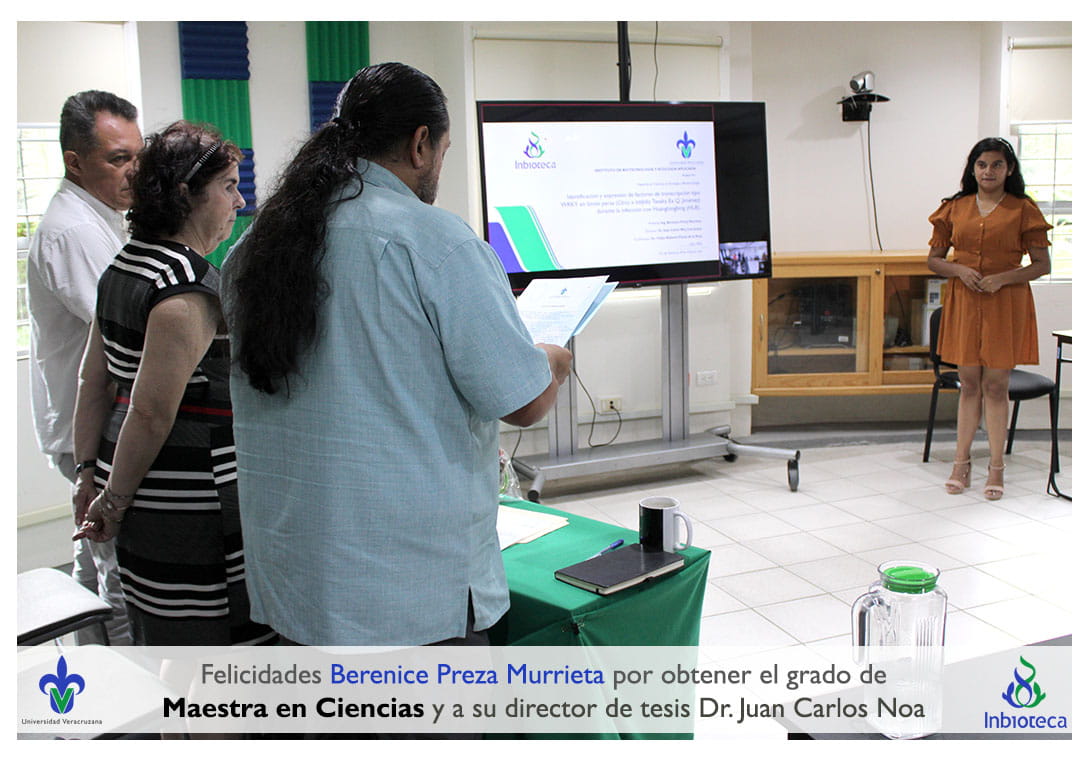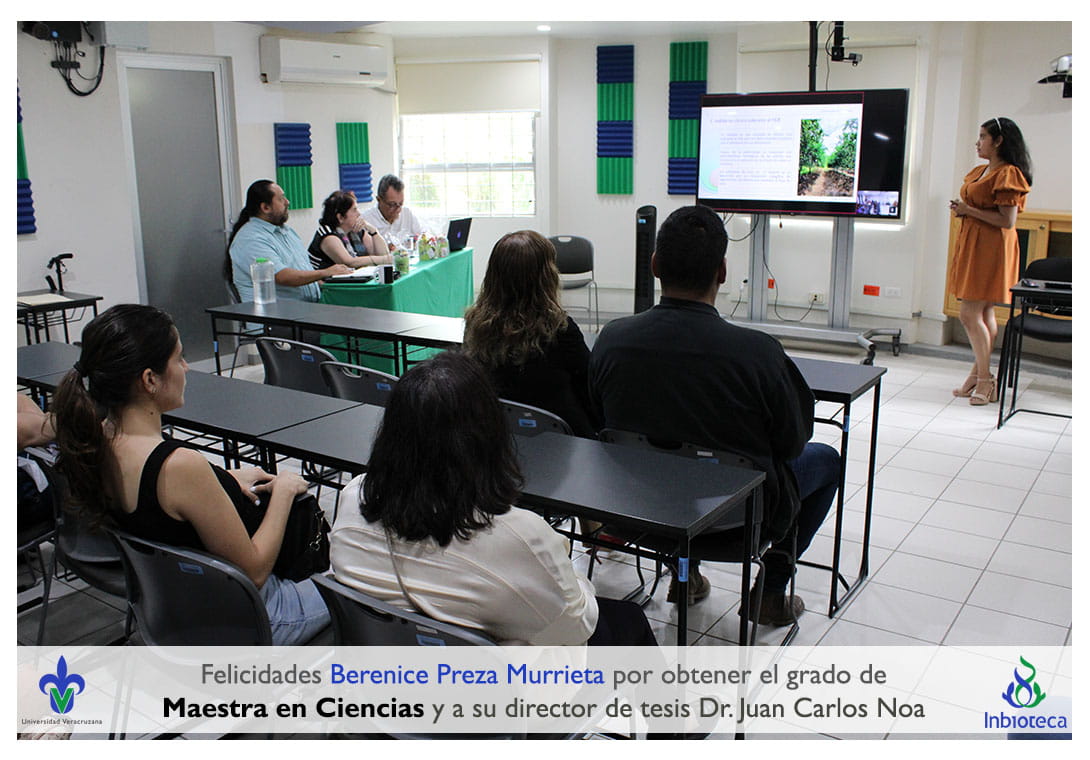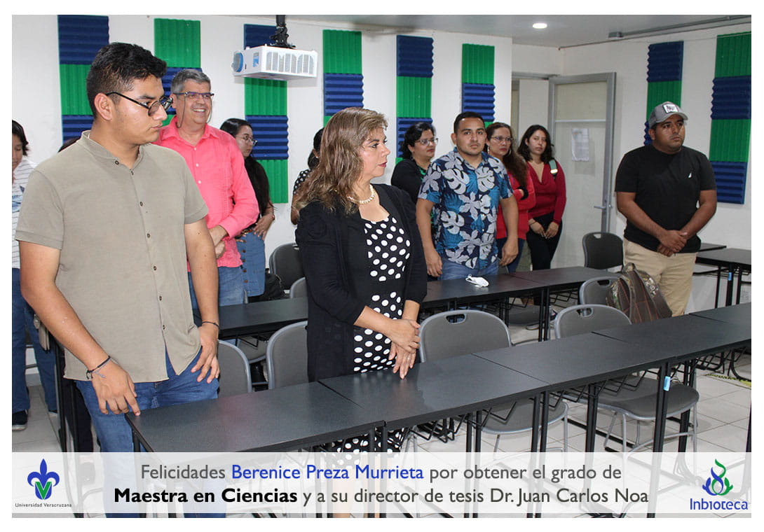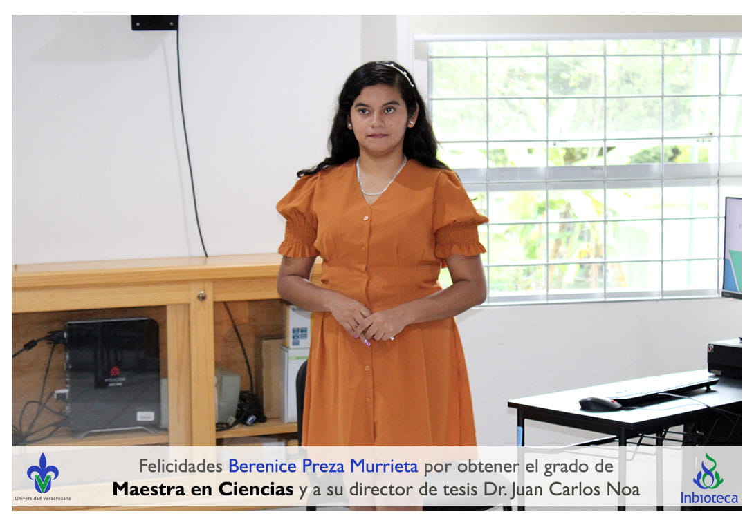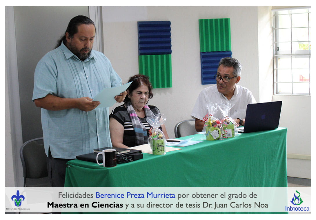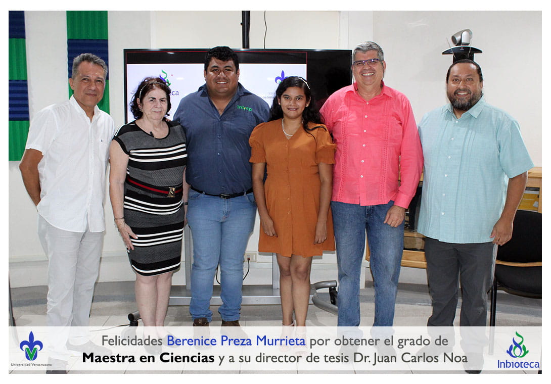Felicidades a Berenice Preza Murrieta por obtener por unanimidad el grado de Maestra en Ciencias en Ecología y Biotecnología, a su director de tesis Dr. Juan Carlos Noa Carrazana, a su codirector de tesis Dr. Felipe Roberto Flores de la Rosa, a su comité y a todos los que contribuyeron en el trabajo realizado. ¡Enhorabuena!