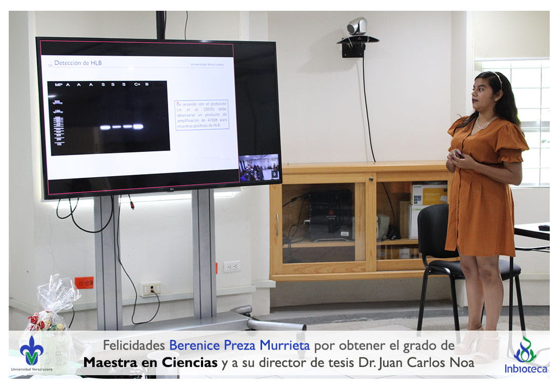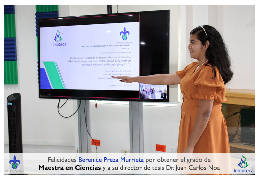 05 de julio de 2023.- En el Aula Híbrida del INBIOTECA a las 12:00 horas, se realizó el examen de grado de Maestría con la defensa pública de la tesis intitulada: Identificación y expresión de factores de transcripción tipo WRKY en Limón Persa (Citrus x latifolia Tanaka Ex Q Jiménez) durante la infección con Huanglongbing (HLB). El jurado evaluador lo integró el Dr. Antonio Andrade Torres (Presidente), la Dra. Lourdes Georgina Iglesias Andreu (Secretaria), y como invitado externo de la Facultad de Ciencias Agrícolas, Campus Xalapa (AGRONIMÍA – UV), el Dr. Mauricio Luna Rodríguez (Vocal Externo).