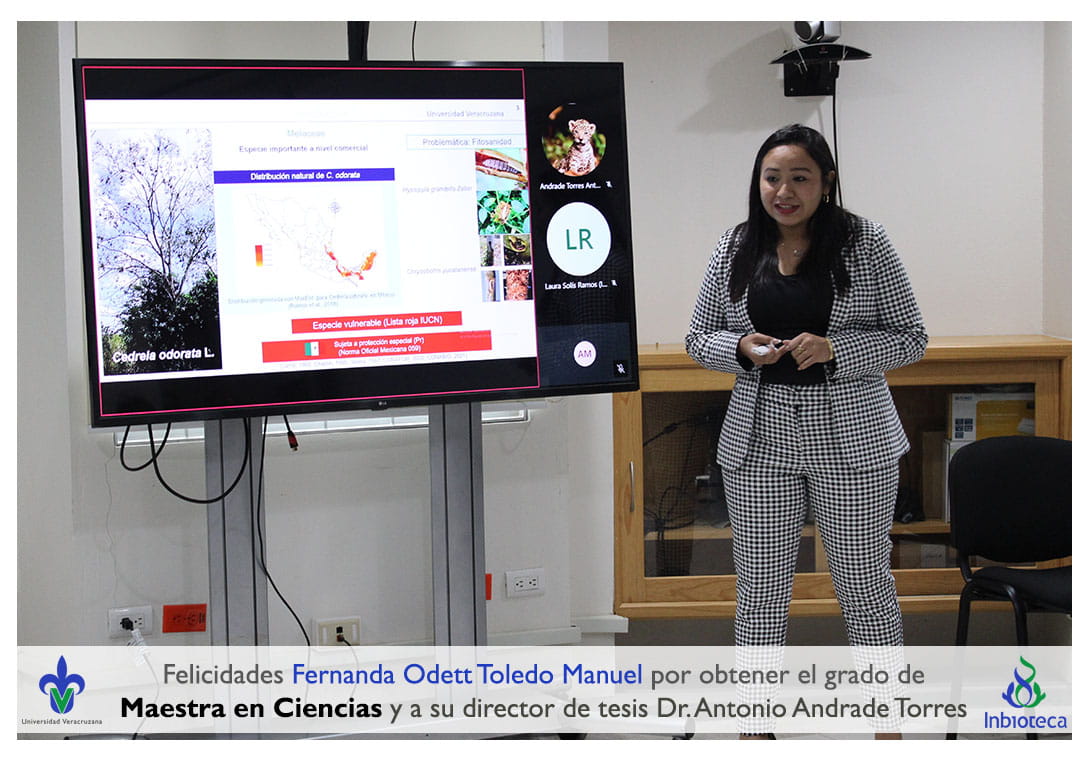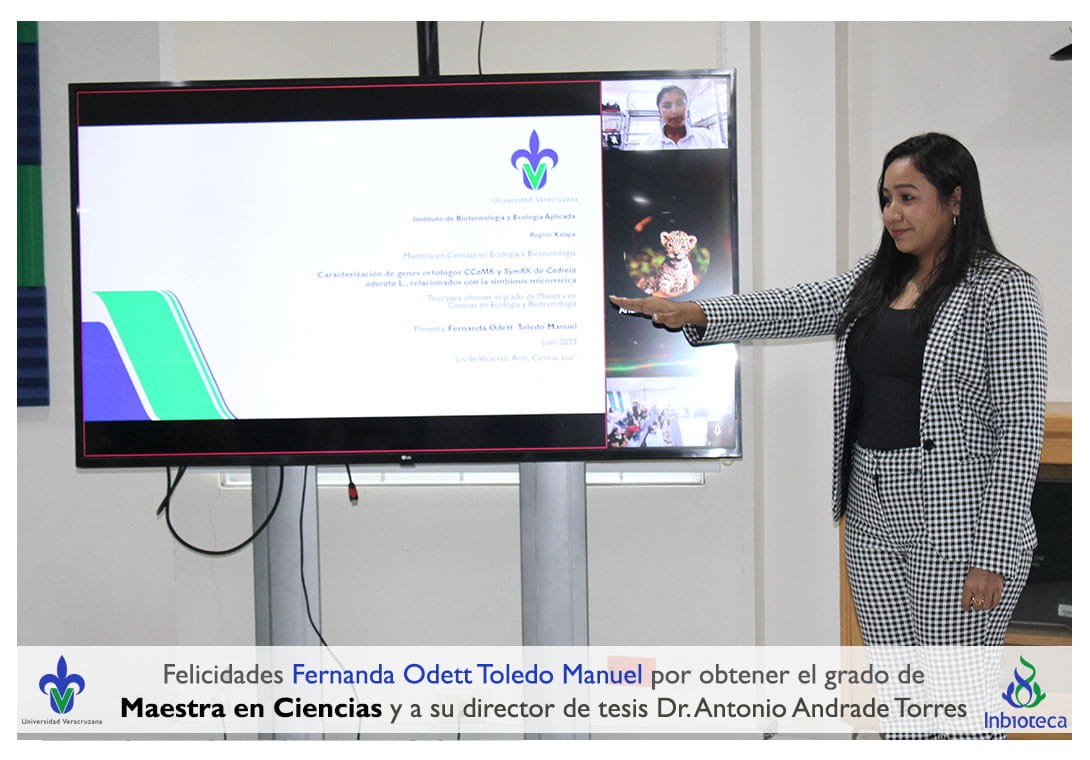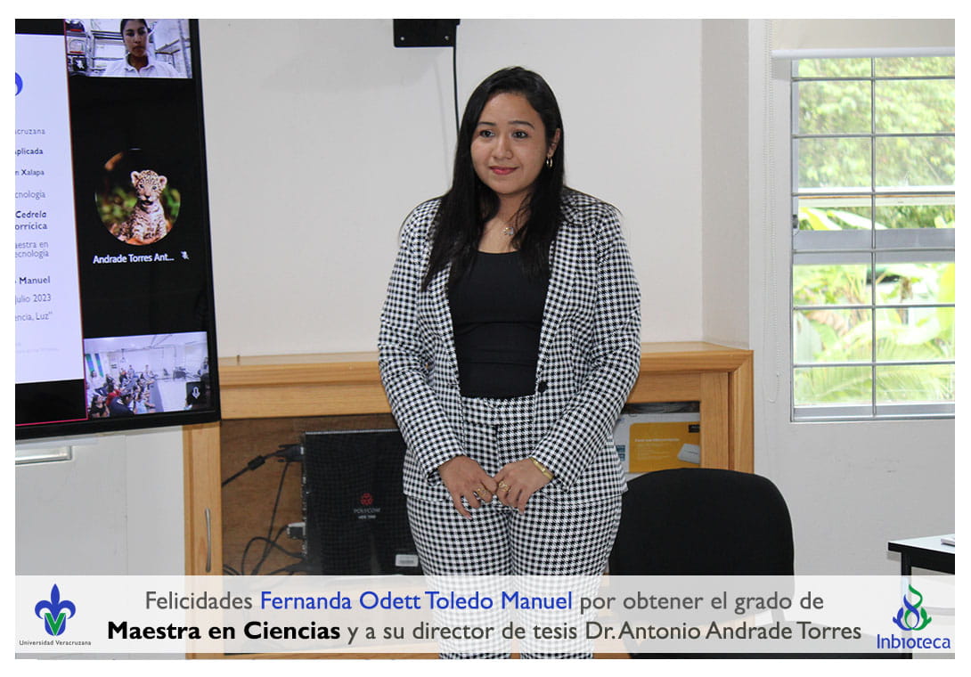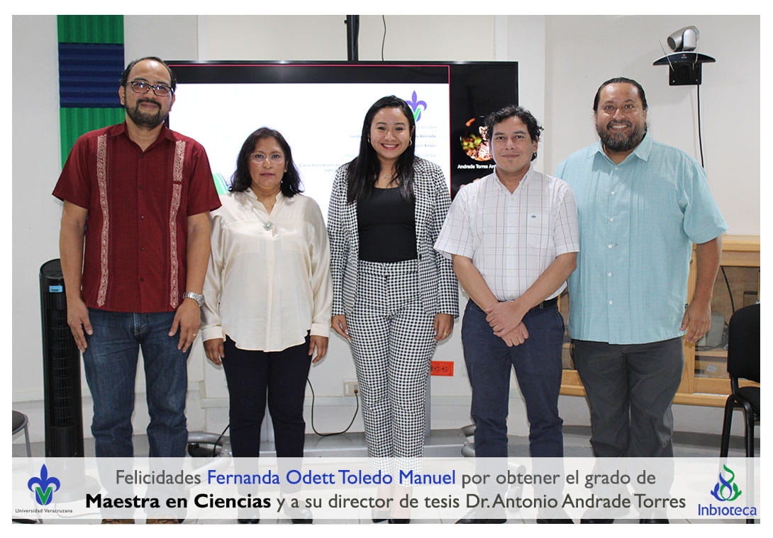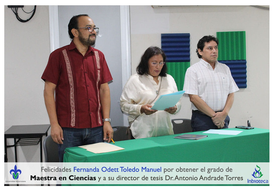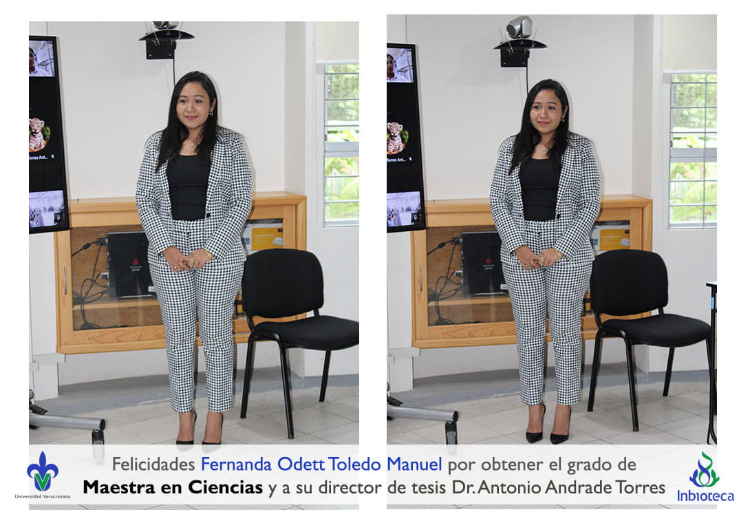 Felicidades a Fernanda Odett Toledo Manuel por obtener por unanimidad el grado de Maestra en Ciencias en Ecología y Biotecnología, a su director de tesis Dr. Antonio Andrade Torres, a su codirectora de tesis Dra. Laura Yesenia Solís Ramos, a su comité y a todos los que contribuyeron en el trabajo realizado. ¡Enhorabuena!