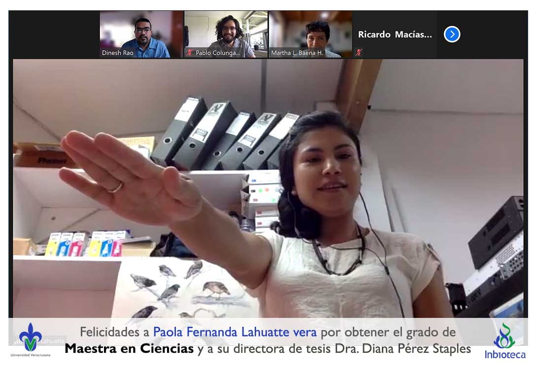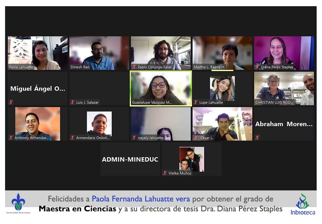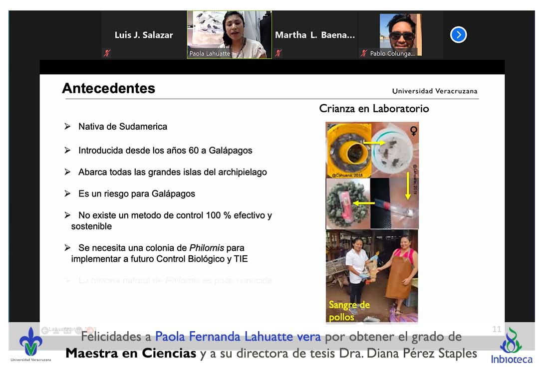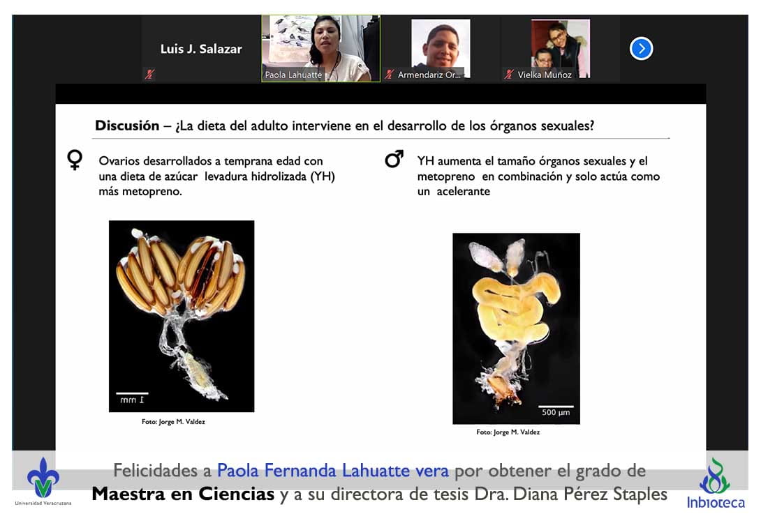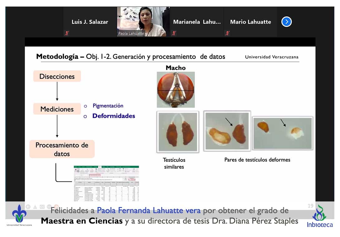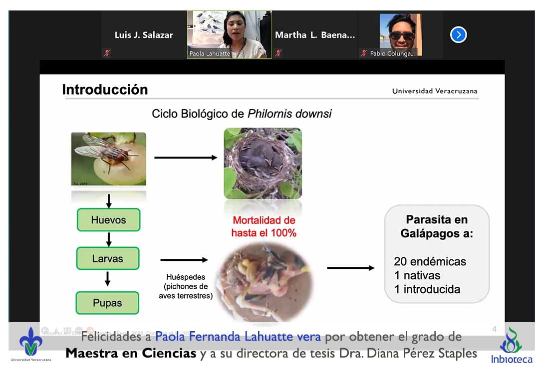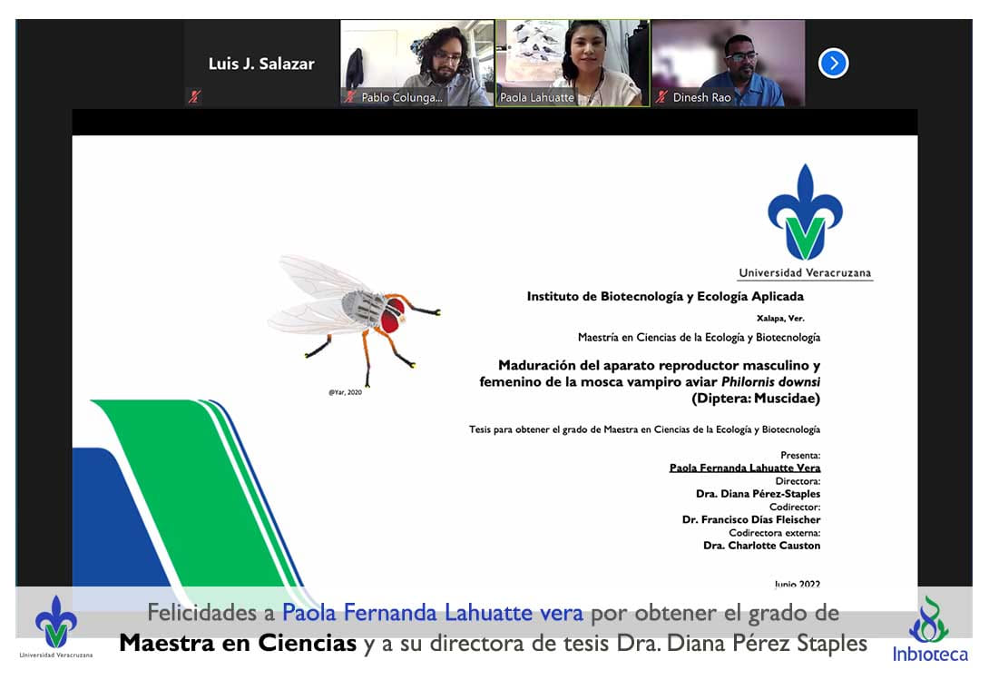 30 de junio de 2022.- A través de videoconferencia a las 11:00 horas, se realizó el examen de grado de Maestría con la defensa pública de la tesis intitulada: Maduración del aparato reproductor masculino y femenino de la mosca vampiro aviar Philornis downsi (Diptera: Muscidae). El jurado evaluador lo integró el Dr. Dinesh Rao (Presidente), el Dr. Pablo Francisco Colunga Salas (Secretario), y como invitada externa del Instituto de Investigaciones Biológicas (IIB-UV), la Dra. Martha Lucía Baena Hurtado (Vocal Externo).