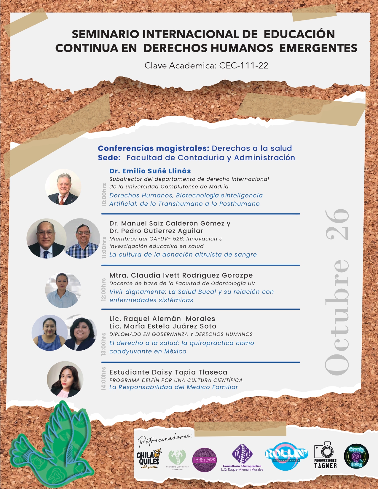 CONFERENCIA MAGISTRAL INTERNACIONAL ESPAÑA EN LA FACULTAD DE CONTADURÍA Y ADMINISTRACIÓN«Derechos Humanos, Biotecnología e inteligencia Artificial: de lo Transhumano a lo Posthumano» Dr. Emilio Suñé Llinás MODALIDAD PRESENCIAL 26-10-2022. 10: 00 am En el Auditoria de la Facultad de Contaduría y Administración. ZONA UV