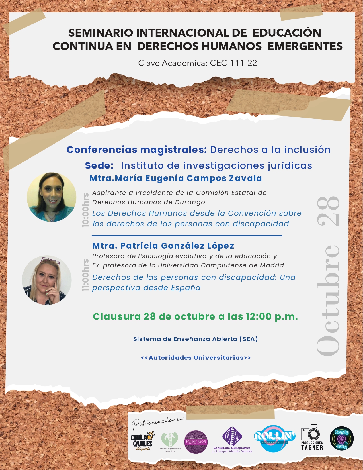CONFERENCIA MAGISTRAL NACIONAL ESPECIAL EN EL INSTITUTO DE INVESTIGACIONES JURÍDICAS<<Los Derechos Humanos desde la Convención sobre los derechos de las personas con discapacidad>> Mtra. María Eugenia Campos Zavala MODALIDAD PRESENCIAL Aspirante a Presidente de la Comisión Estatal de Derechos Humanos de Durango 28-10-2022/10:00 hrs