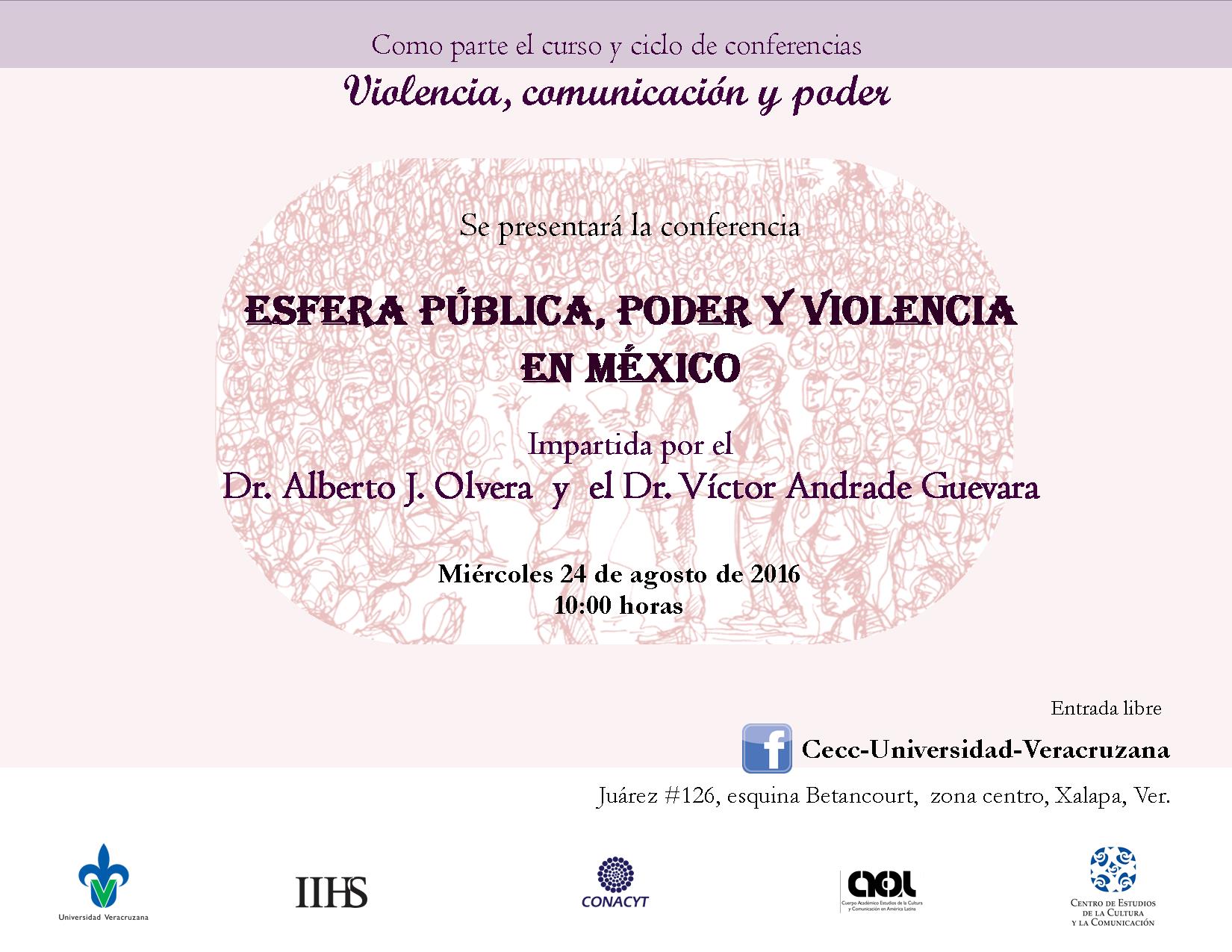 Como parte el curso y ciclo de conferencias: Violencia, comunicación y poder se hace una invitación para la conferencia Esfera pública, poder y violencia en México que será impartida por el Dr. Alberto J. Olvera y el Dr. Víctor Andrade Guevara ambos del Instituto de Investigaciones Histórico Sociales de la UV. La sesión se realizará el próximo miércoles 24 de agosto de 2016 a las 10:00 horas en el Centro de Estudios de la Cultura y la Comunicación (Juárez #126, esquina Betancourt, zona centro, Xalapa, Ver.) La entrada es completamente libre.