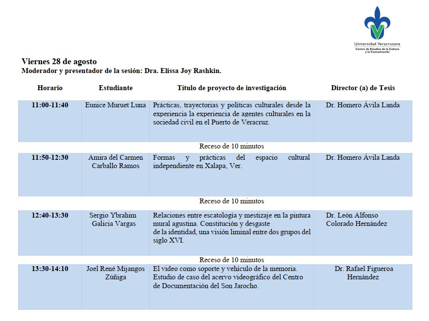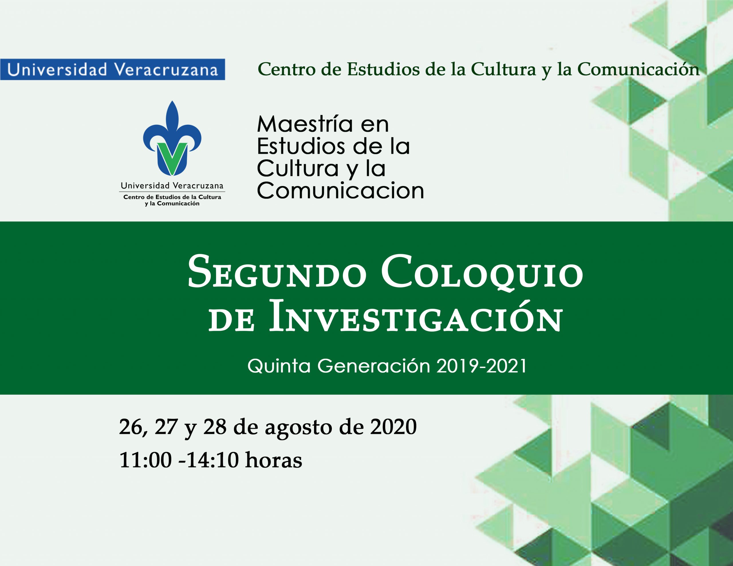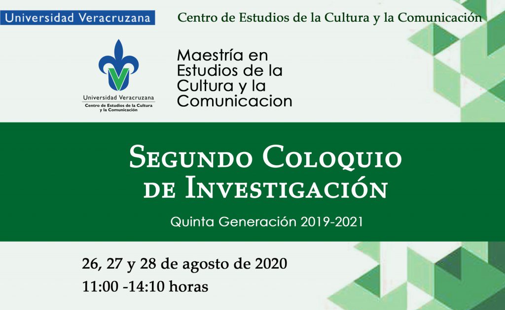 El Centro de Estudios de la Cultura y la Comunicación y la Maestría en Estudios de la Cultura y la Comunicación tiene el placer de invitarlos al Segundo Coloquio de Investigación de la Quinta Generación 2019-2021 de la MECC, el cuál se llevará a cabo el 26, 27 y 28 de agosto de 2020 a las 11:00 horas.