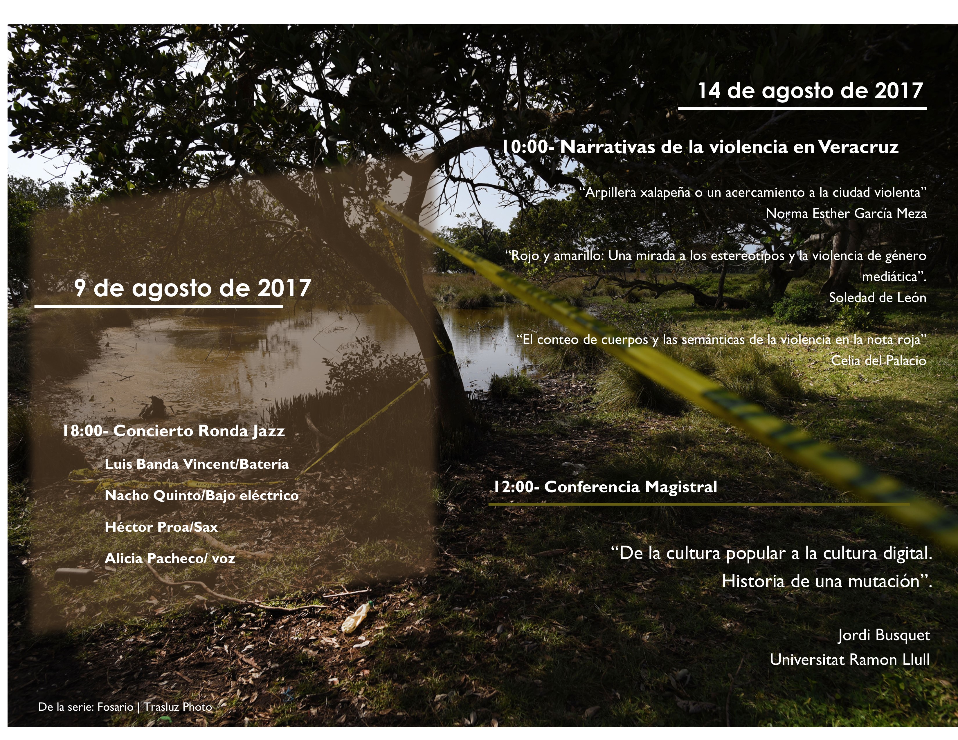 El miércoles 9 a las 18 horas tendremos un Concierto de Jazz con el grupo Ronda Jazz, gracias a la colaboración de Difusión Cultural de la Universidad Veracruzana. El Lunes 14 a las 10 de la mañana se realizará la mesa de discusión Narrativas de la Violencia en Veracruz: “Arpillera xalapeña o un acercamiento a la ciudad violenta” por Norma Esther García Meza; «Rojo y amarillo: Una mirada a los estereotipos y la violencia de género mediática» por Soledad de León y “El conteo de cuerpos y las semánticas de la violencia en la nota roja” por Celia del Palacio.