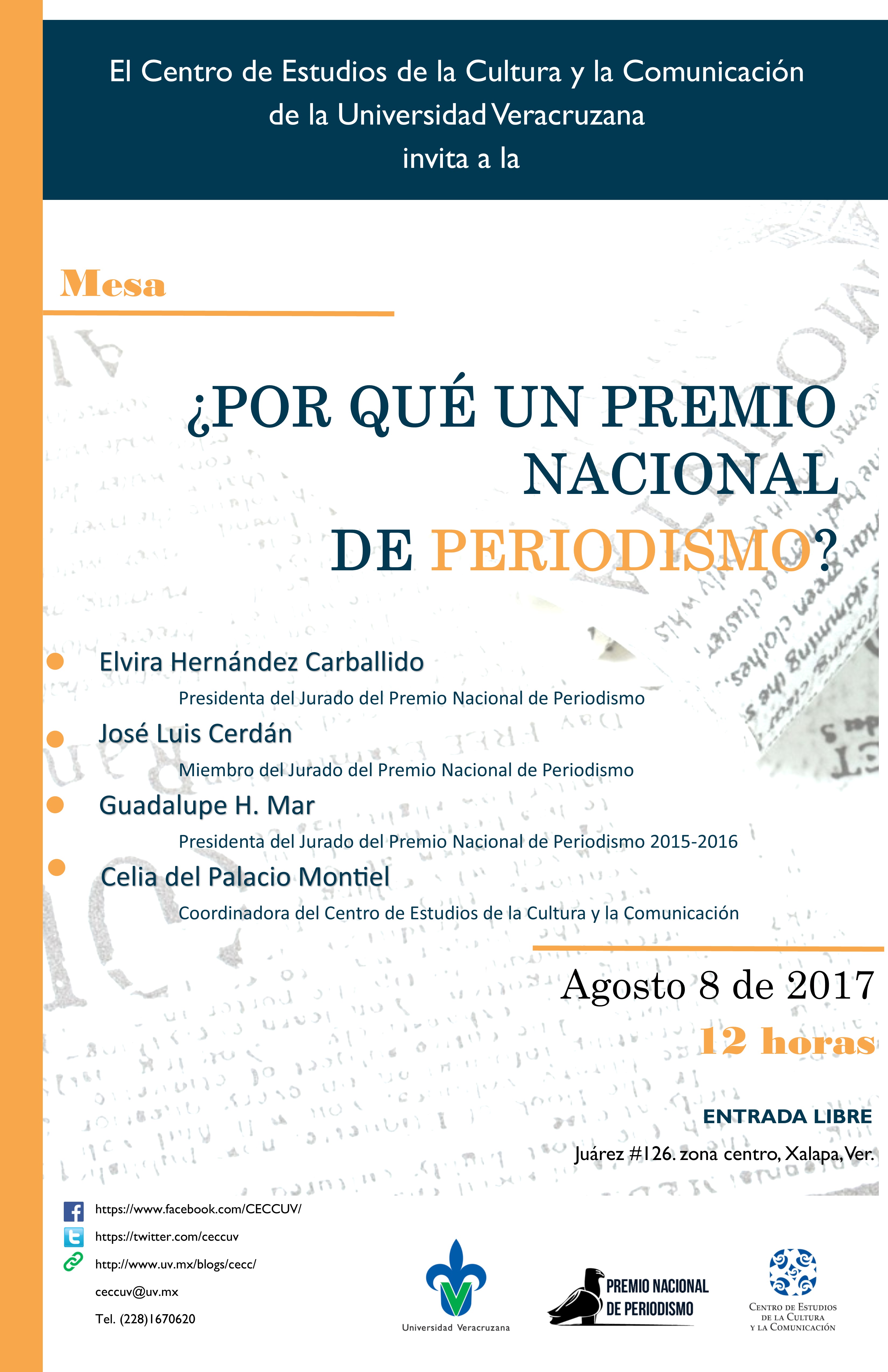 El martes 8 de agosto a las 12 de día vamos a tener una mesa sobre el “Premio Nacional de Periodismo” en esa mesa van a participar Elvira Hernández Carballido, presidenta del Jurado de este año; José Luis Cerdán, miembro del Jurado de este año; Guadalupe H. Mar, que fue presidenta del jurado el año pasado y la Dra. Celia del Palacio, coord. del CECC. Se pretende analizar ¿Por qué un premio nacional de periodismo? y discutir sobre ese reconocimiento de la sociedad y de los demás periodistas a un trabajo de excelencia.