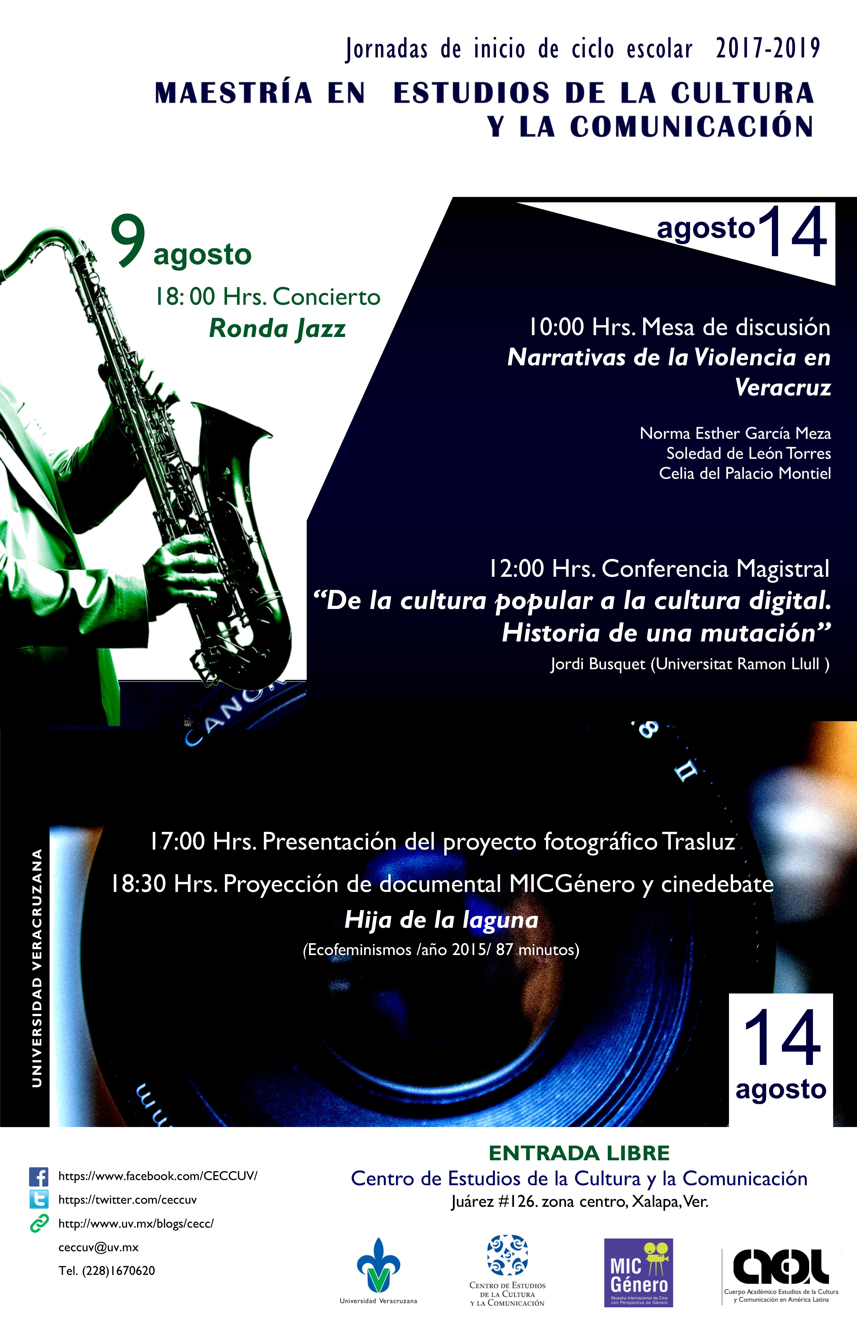 El Centro de Estudios de la Cultura y la Comunicación se siente muy feliz de darle la bienvenida a todos los alumnos UV, pero sobre todo, a la nueva generación de la Maestría. Es por eso que ha organizado una semana de actividades para debatir sobre los temas de cultura, comunicación, medios y violencia.