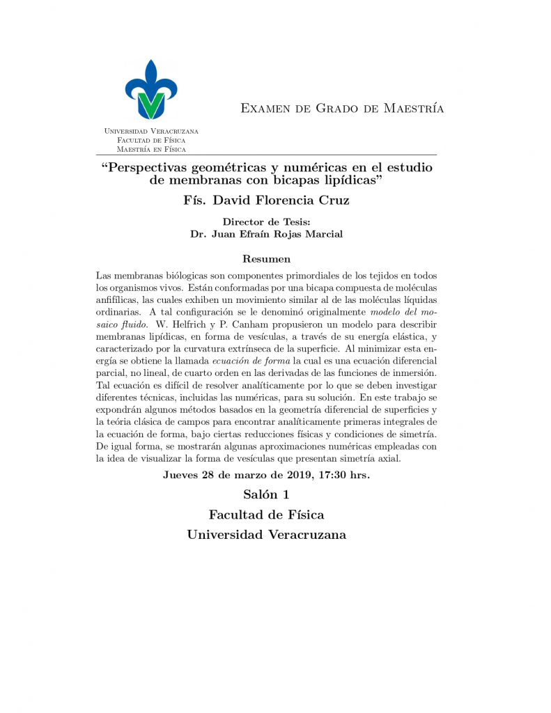 Se invita cordialmente a toda la comunidad de la Facultad de Física al examen de grado del estudiante Fis. David Florencia Cruz