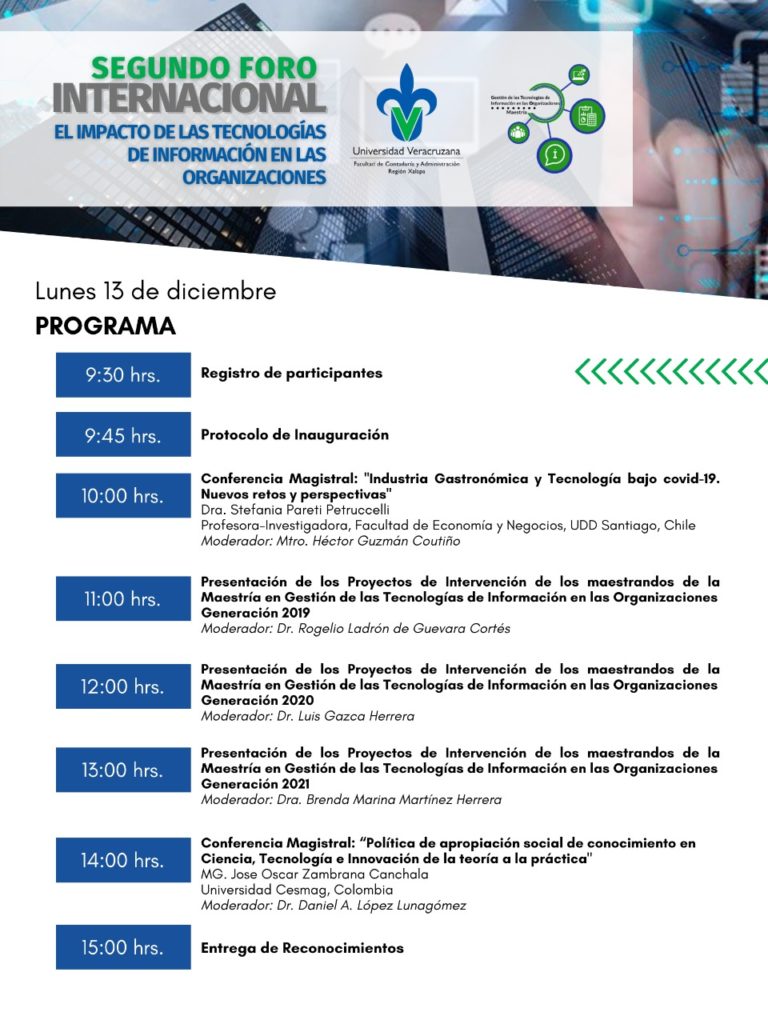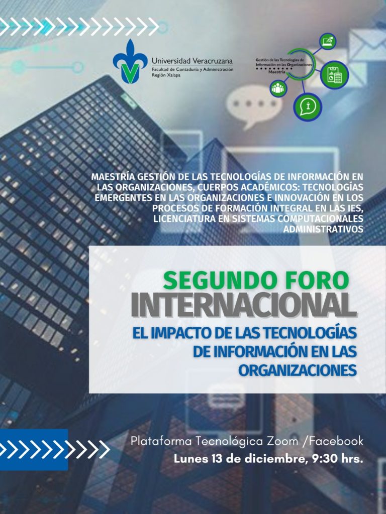 La Maestría en Gestión de las Tecnologías de la Información en las Organizaciones adscrita a la Facultad de Contaduría y Administración realiza el 2° Foro Internacional El Impacto de las Tecnologías en las Organizaciones, la cual se llevará a cabo el día Lunes 13 de diciembre.