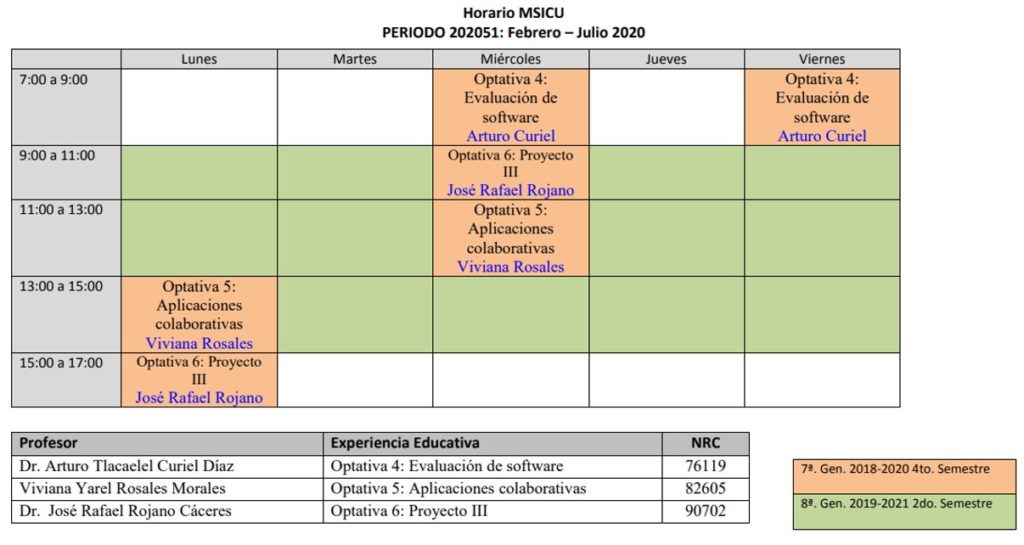 | 9:00 a 11:00 | Factores Humanos | Servicios de Red | Probabilidad y Estadística | Tecnología Interactiva | |