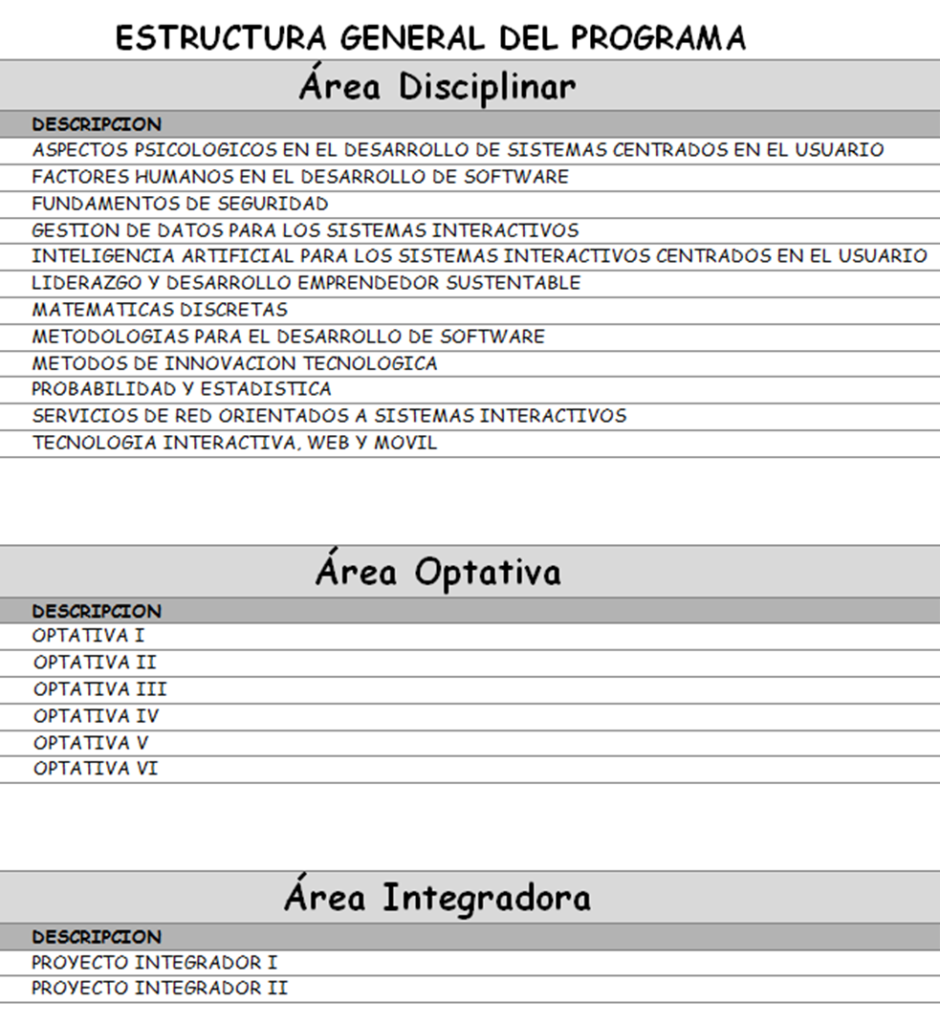 El programa de Maestría en Sistemas Interactivos Centrados en el Usuario, se cursará en cuatro períodos semestrales. El programa comprende 105 créditos en 20 Experiencias Educativas (EE) cubriendo un total de 315 horas teóricas y 915 horas prácticas.