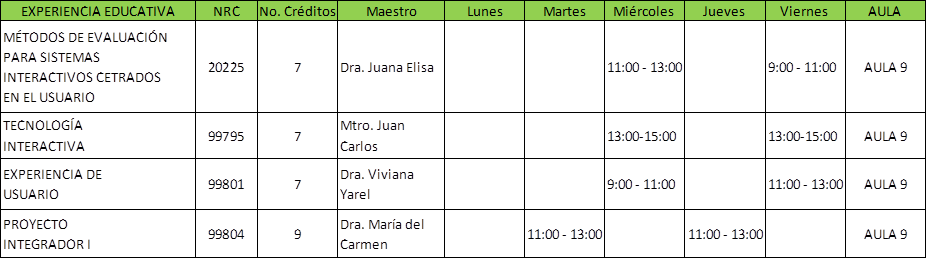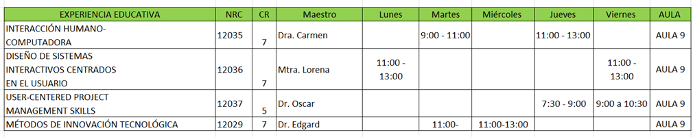 | EXPERIENCIA EDUCATIVA | NRC | Maestro | Lunes | Martes | Miércoles | Jueves | Viernes | AULA |