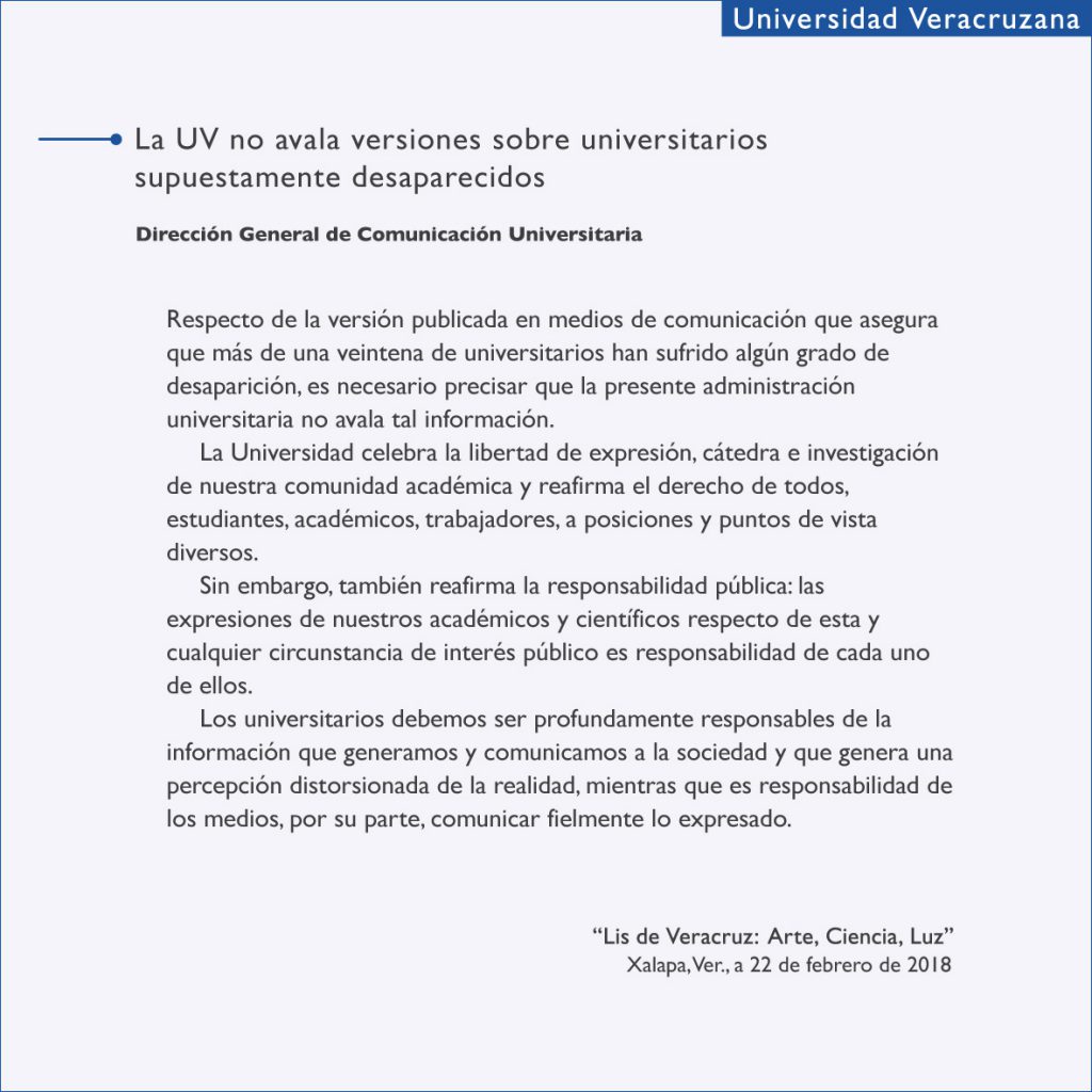 La UV no avala versiones sobre universitarios supuestamente desaparecidos