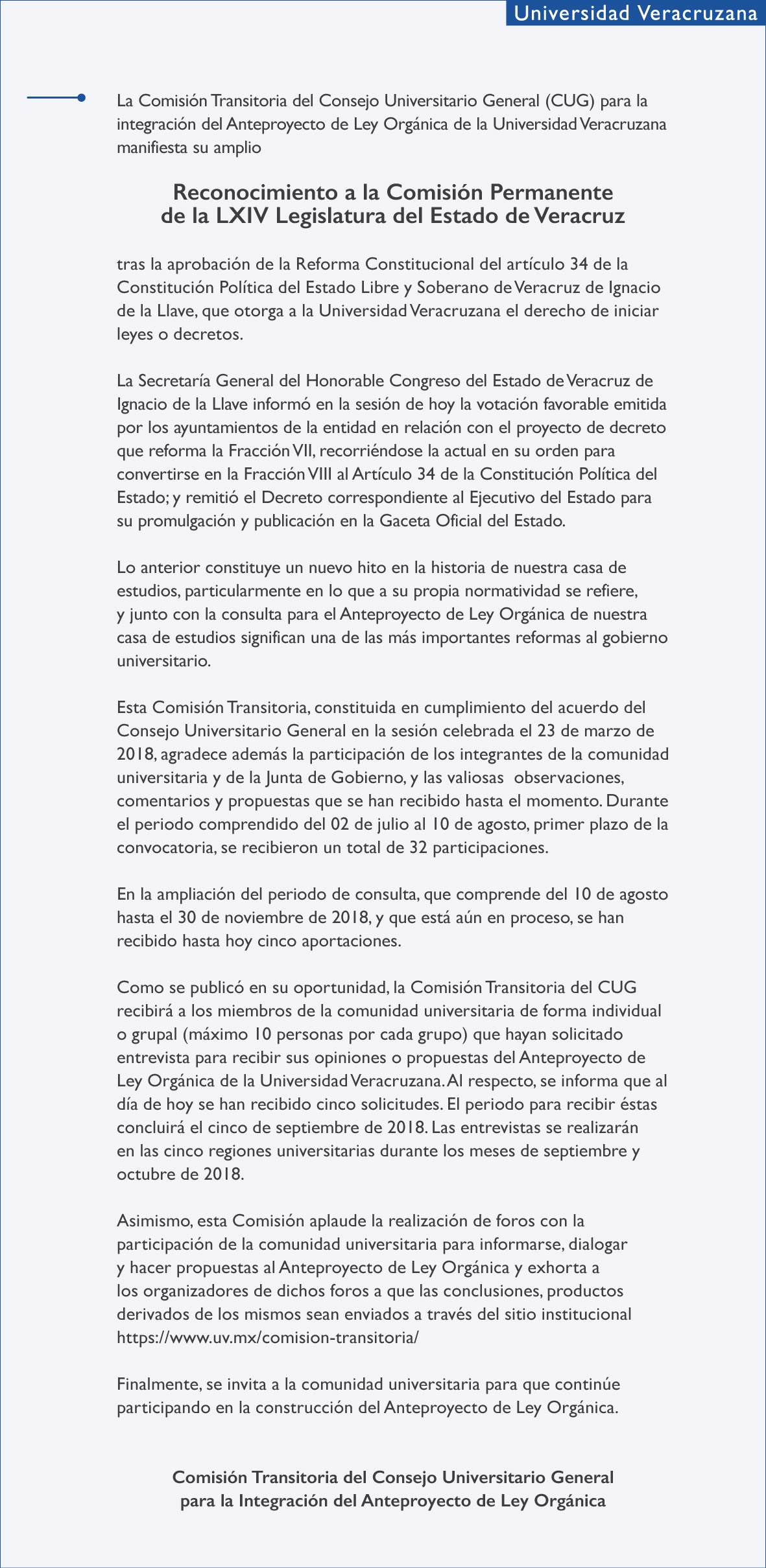 De la Comisión Transitoria para la integración del Anteproyecto de Ley Orgánica De la Comisión Transitoria del CUG