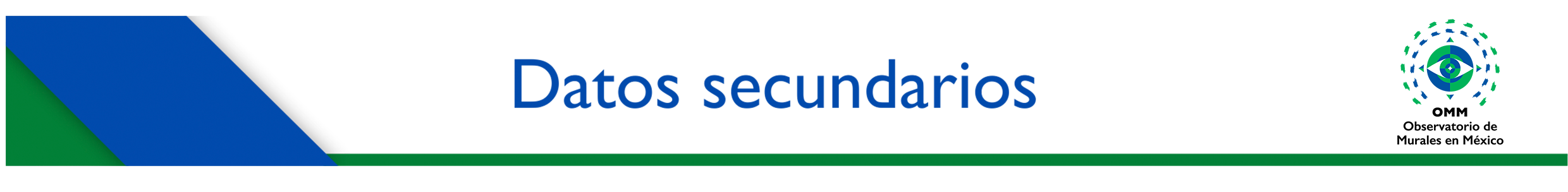 Datos secundarios Base de Datos Estadísticas internacionales Fuente Tema Periodo Formato Enlace Street Art Cities Mapa de las ciudades más populares sobre arte callejero 2023 WEB Mural Arts Philadelphia Registro de las obras de arte por: vecindario y programa al que pertenece WEB The Mural Conservancy of Los Angeles (MCLA) Registro de las obras de arte por: vecindario y programa al que pertenece WEB JSTOR/ARTSTOR Colección de imágenes de arte, incluidas obras de muralismo WEB