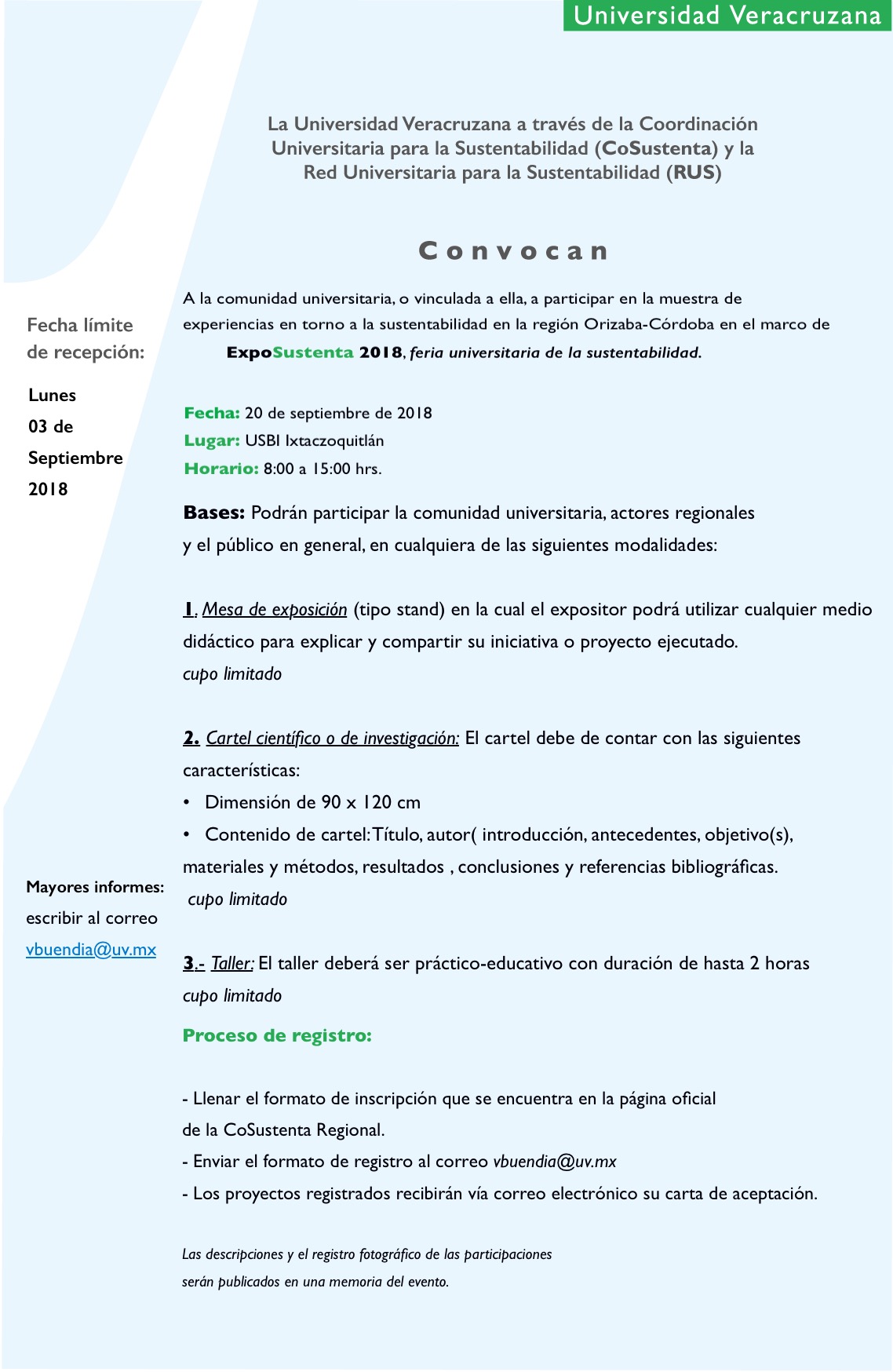 La ExpoSustenta, feria universitaria de sustentabilidad, es un evento anual organizado en las 5 regiones universitarias con el objetivo de generar un espacio para conocer e intercambiar experiencias universitarias de sustentabilidad, articular esfuerzos y estimular el trabajo multidisciplinario e interinstitucional emprendido por alumnos, académicos, autoridades y sociedad, comprometidos con el tema.