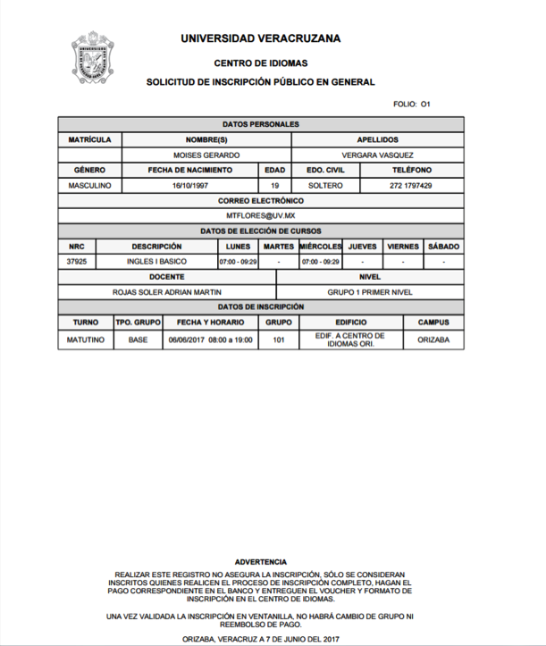 4.El personal del Centro de Idiomas le proporcionará una matrícula y su solicitud de pago.