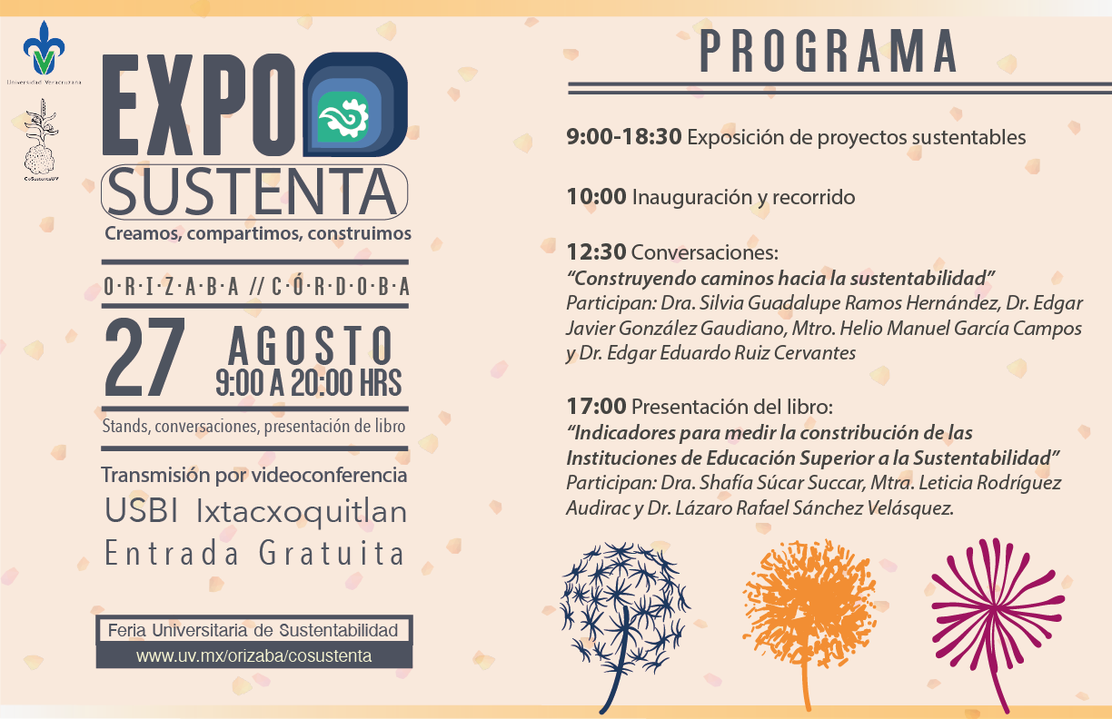 Ante los urgentes desafíos socio-ambientales y con el objetivo de generar un espacio para intercambiar experiencias de sustentabilidad, articular esfuerzos y estimular el trabajo multidisciplinario e interinstitucional emprendido por alumnos, académicos y directivos comprometidos con la sustentabilidad en su más amplio sentido y acorde al Plan Maestro de Sustentabilidad de la Universidad Veracruzana (UV) a través de la Coordinación Universitaria para la Sustentabilidad (Cosustenta) se realizará la “Expo Sustenta 2015: creamos, compartimos, construimos”, el 27 de agosto a partir de las 9:00hrs en las Unidades de Servicios Bibliotecarios y de Información (USBI) de Xalapa como sede principal y de Ixtaczoquitlan, como sub-sede.