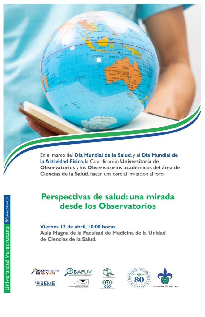 El próximo viernes 12 de abril de 2024 a las 10:00 horas, se llevará a cabo el foro: «Perspectivas de salud: una mirada desde los observatorios», en el marco del día mundial de la salud. El evento se llevará a cabo en el Aula Magna de la facultad de medicina de la Unidad de Ciencias de la Salud de la UV.