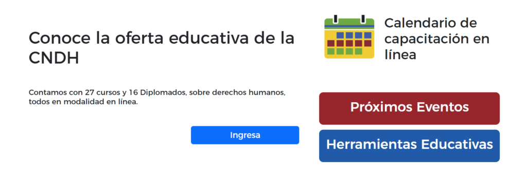 La Comisión Nacional de los Derechos Humanos, a través de su plataforma EDUCA CNDH, pone a disposición del público una amplia gama de cursos y diplomados gratuitos en línea. Cuenta con cursos y diplomados certificados en áreas como cultura de paz, género, salud, derechos humanos y mediación. Todo con flexibilidad de acceso, disponibles en cualquier lugar y momento, ideales para enriquecer tu formación con enfoque en derechos humanos.