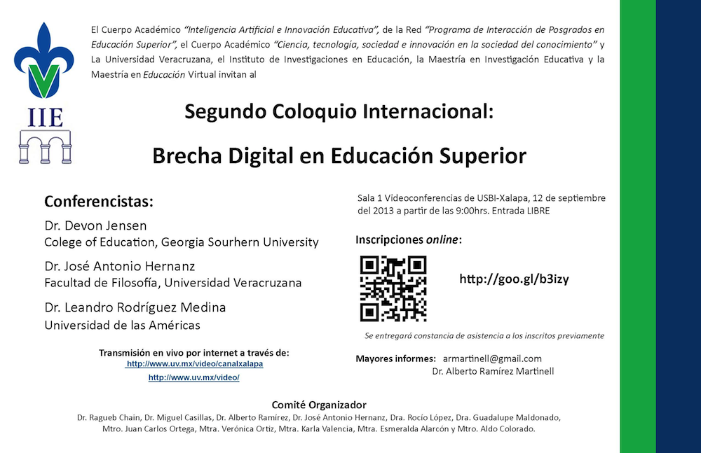 El Cuerpo Académico “Inteligencia Artificial e Innovación Educativa” (UV-079 PROMEP), la Red «Programa de interacción de Posgrdo en Educación Superior», el Cuerpo Académico «Ciencia, tecnología, sociedad e innovación en la sociedad del conocimiento», la Universidad Veracruzana, el Instituto de Investigaciones en Educación, el Doctorado y la Maestría en Investigación educativa y la Maestría en Educación Virtual, invitan al Segundo Coloquio Internacional