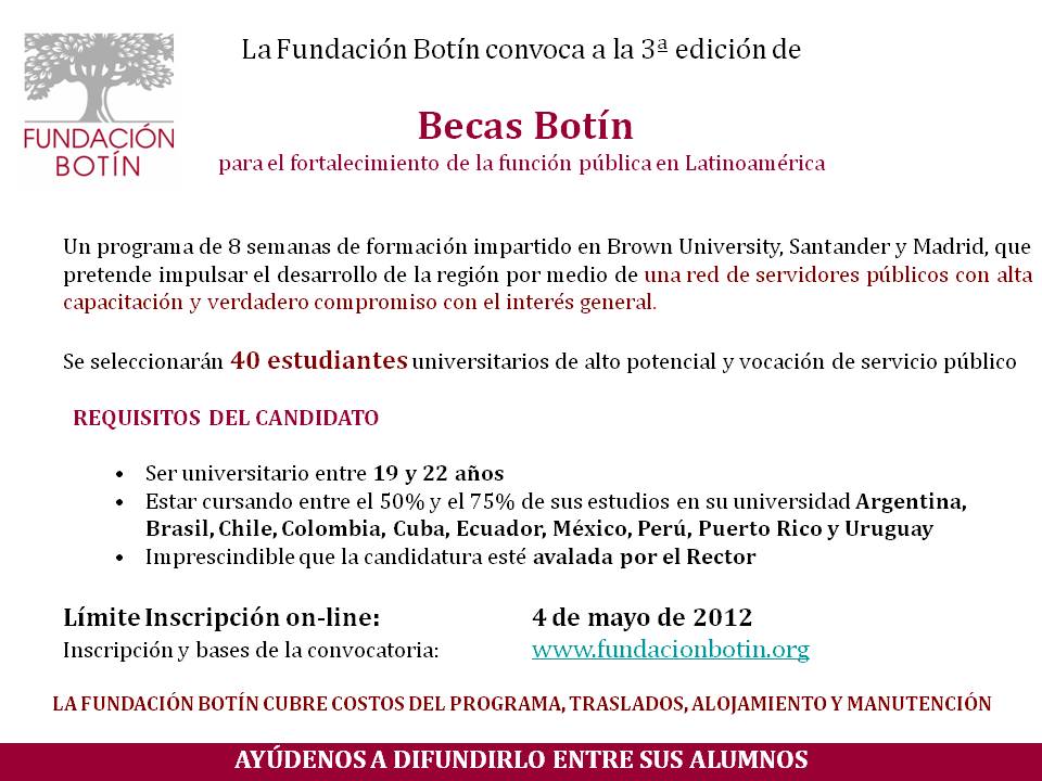Compartir Twitter Facebook Correo electrónico Whatsapp Becas Botín para el fortalecimiento de la función pública en Latinoamérica 20 marzo, 2012 Gerardo Contreras Vega
